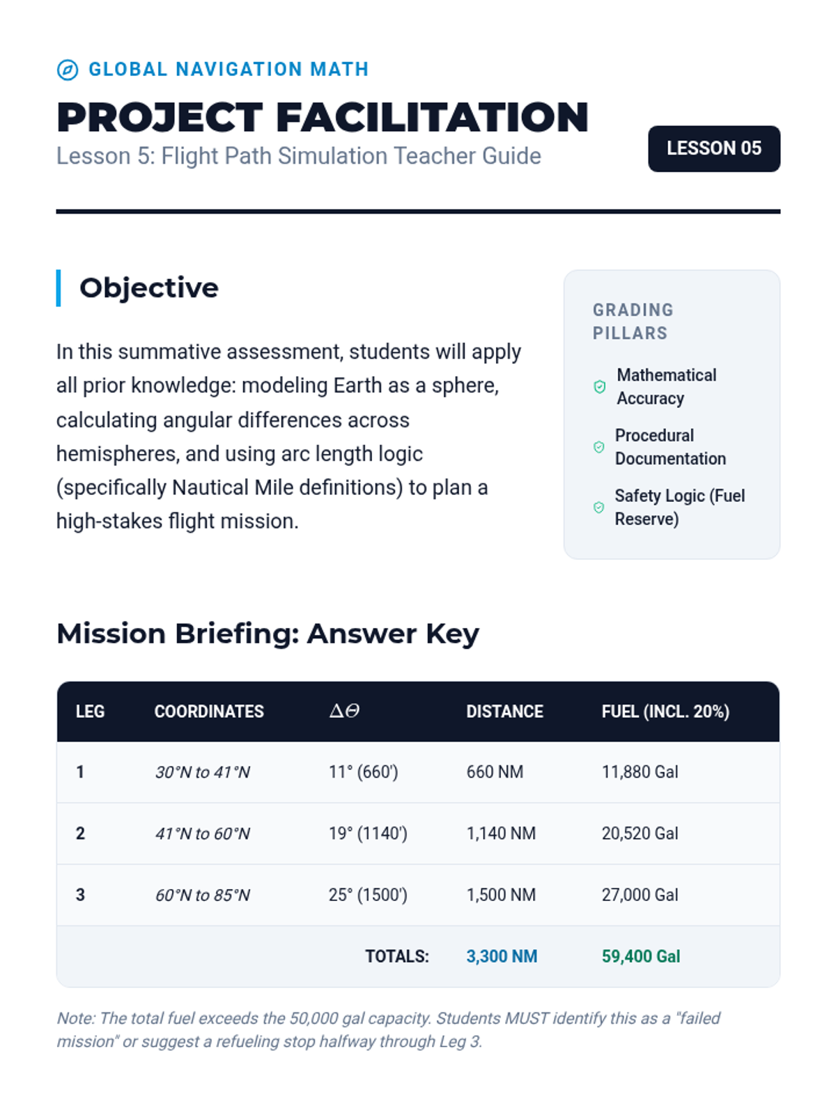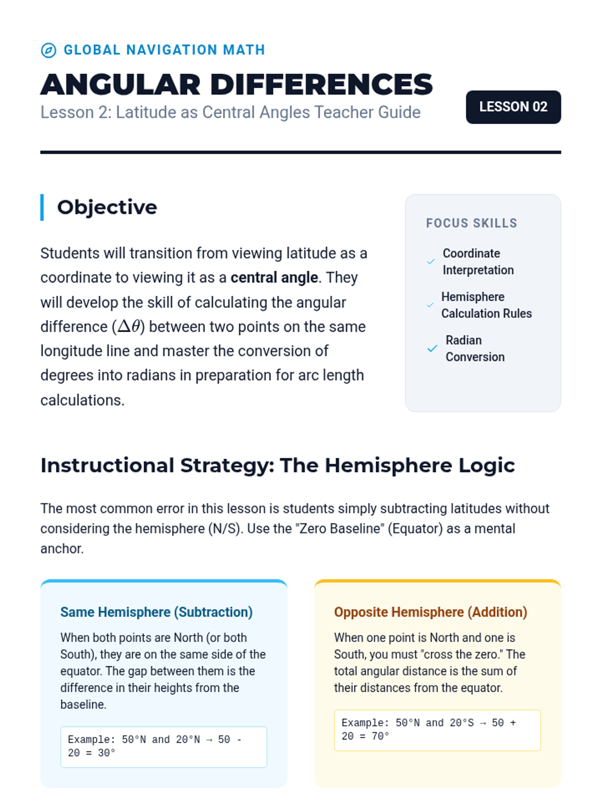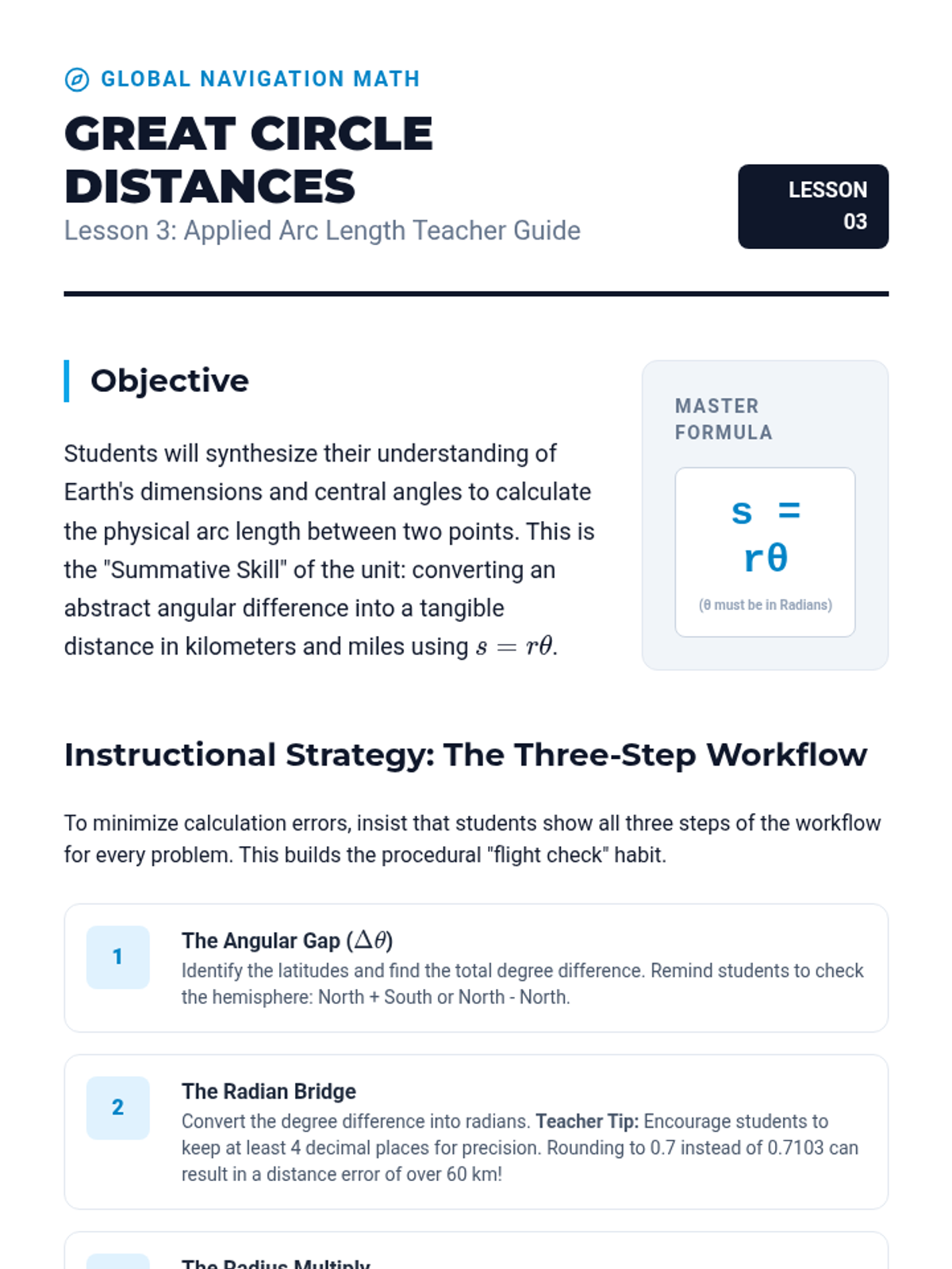 This sequence applies circular geometry to a global scale, introducing students to spherical geometry concepts used in navigation and aviation. Students treat the Earth as a sphere and use arc length formulas to calculate 'Great Circle' distances between cities, concluding with a flight path simulation.