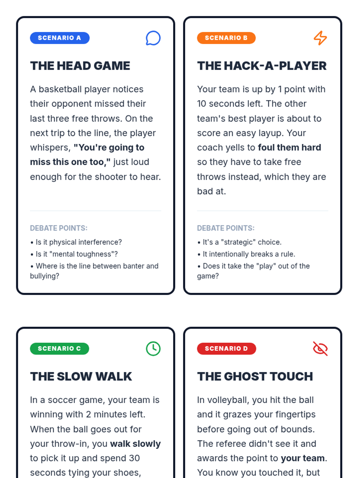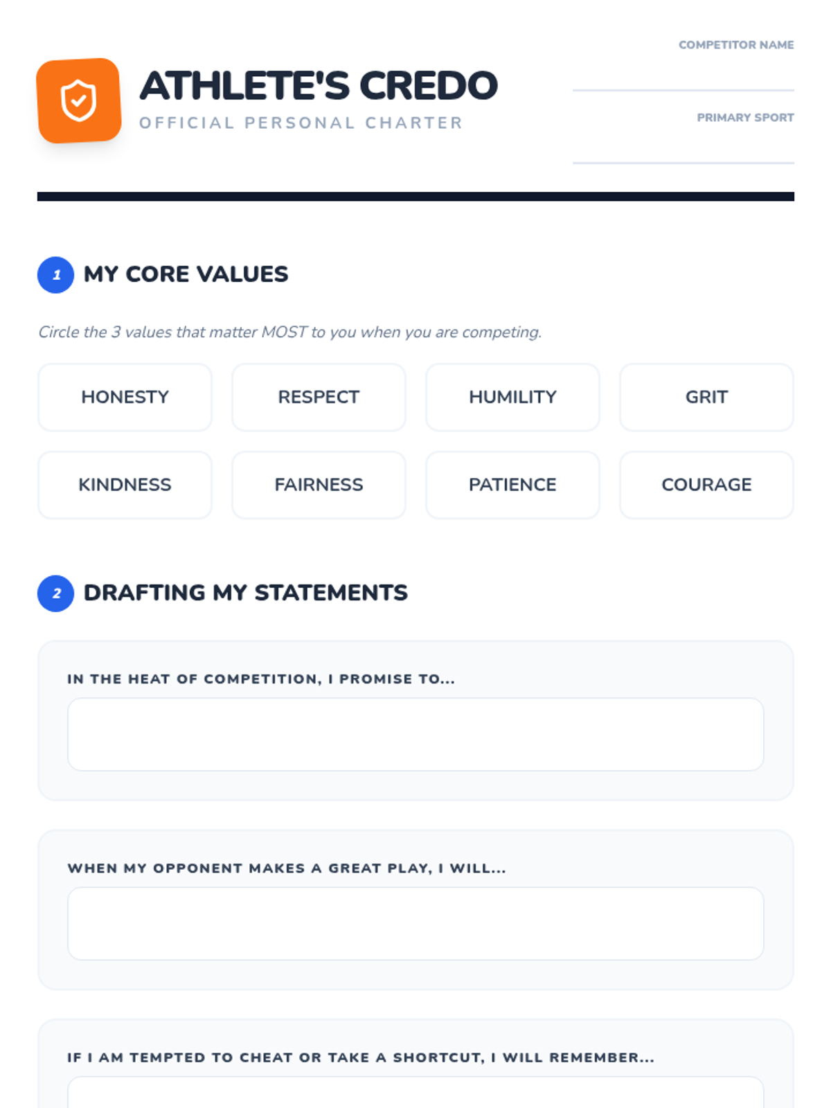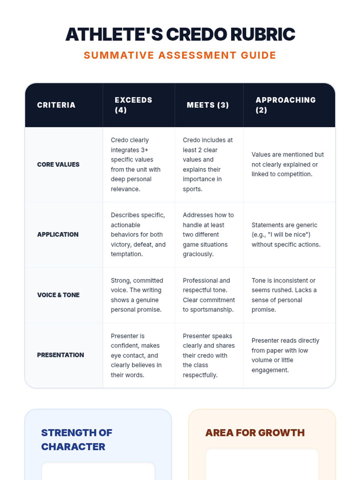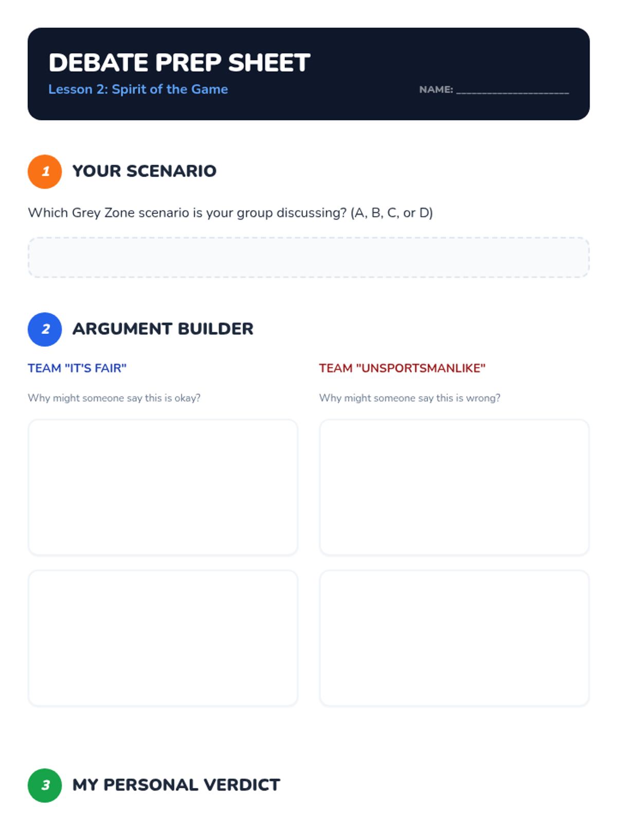 A 5-lesson unit for 5th graders exploring sportsmanship, integrity, and fair play through real-world case studies, debates, and personal reflection. Students move from defining basic ethical behavior to navigating complex grey areas and developing their own athlete's credo.