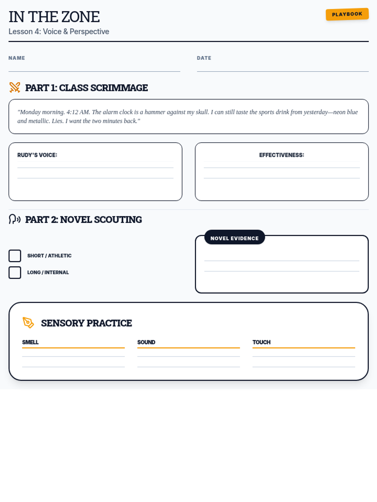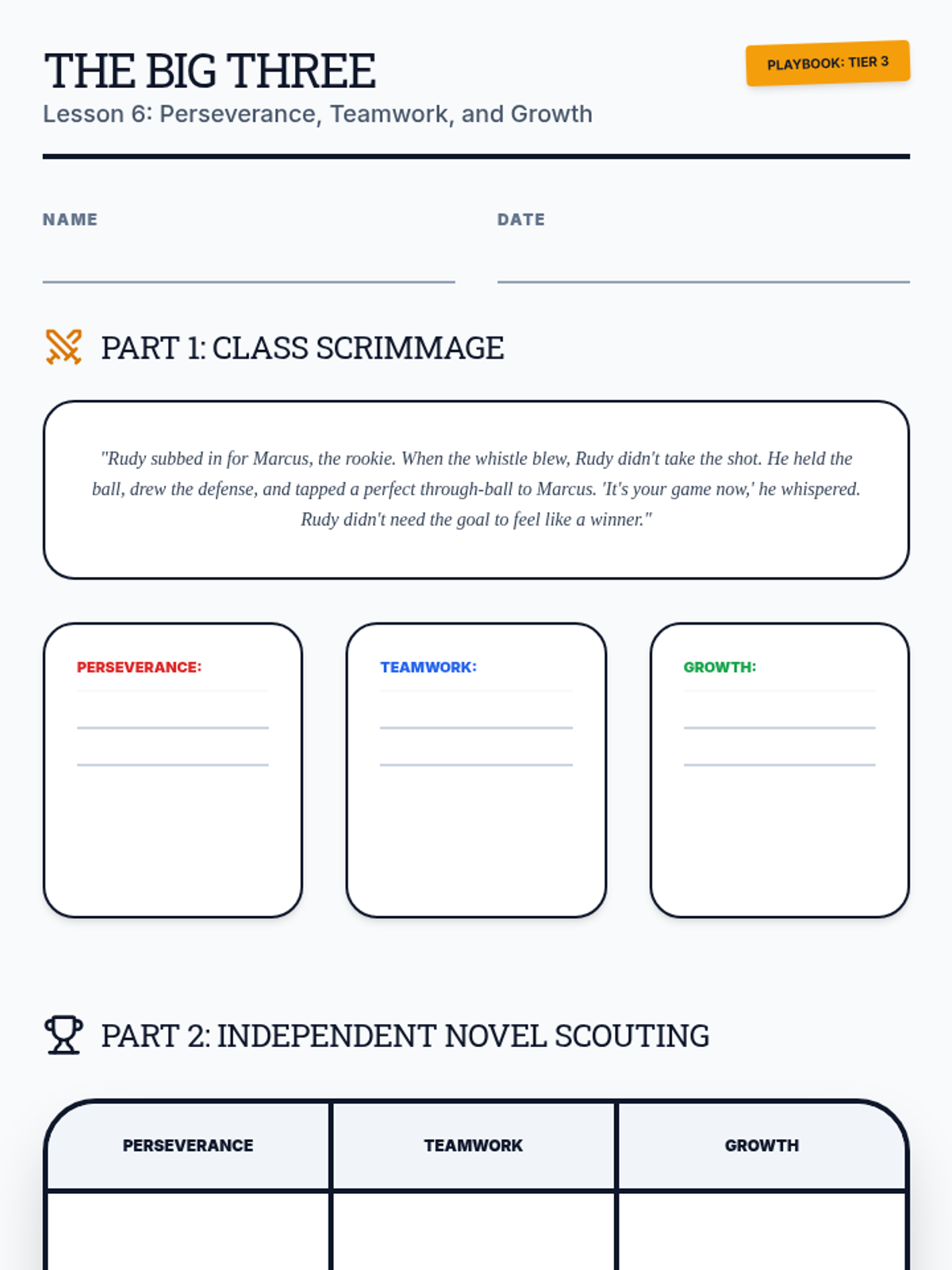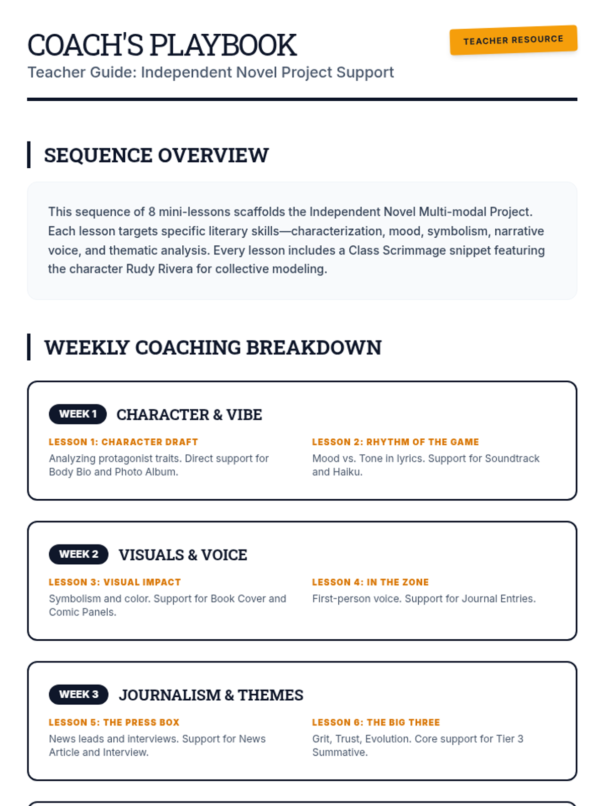 A 4-week series of mini-lessons for Sports Literature designed to support students through an independent novel project. The sequence covers characterization, symbolism, theme analysis, and media literacy through the lens of sports narratives.