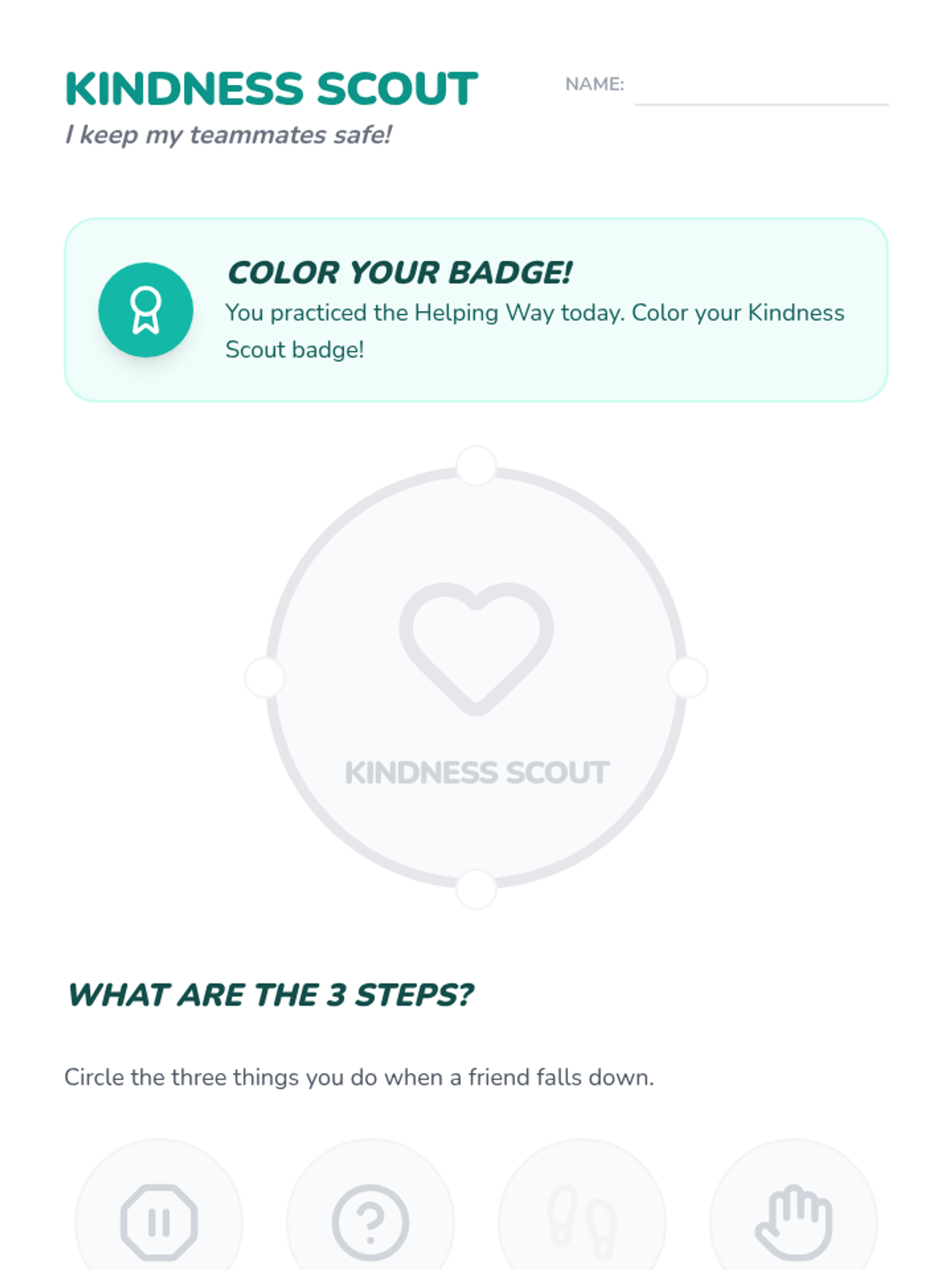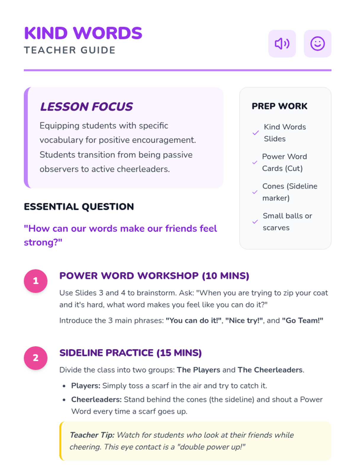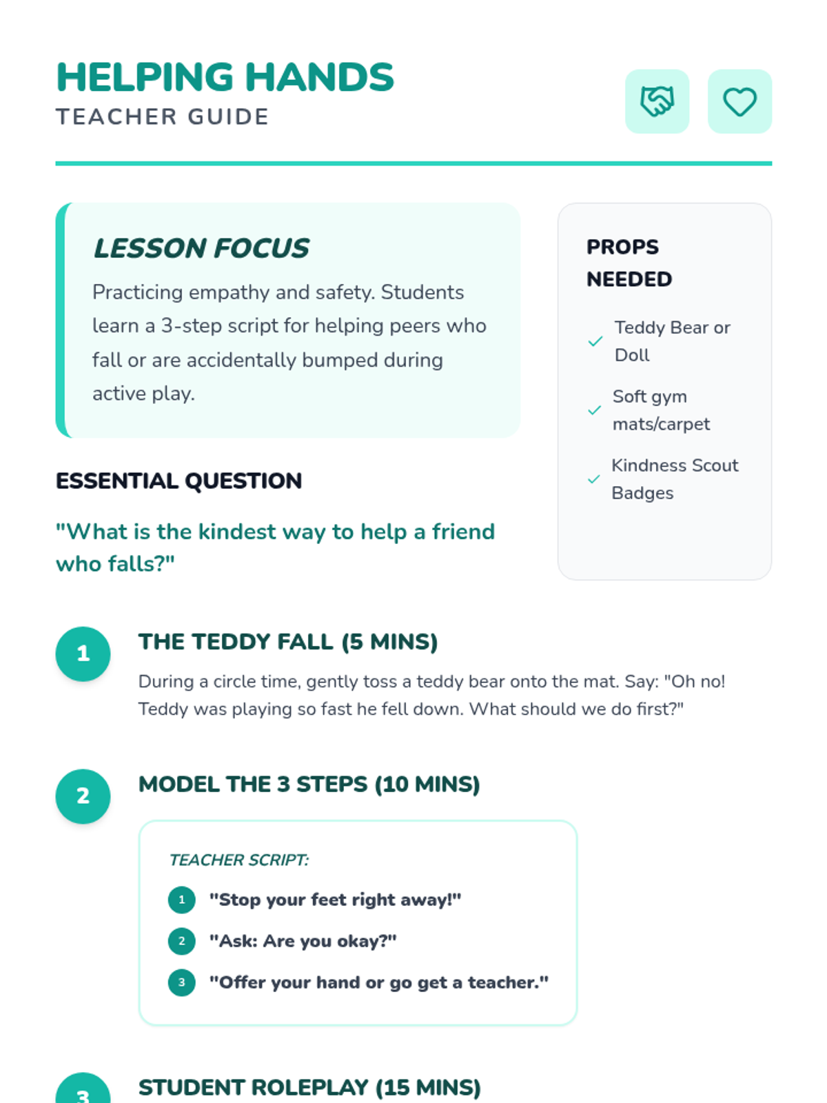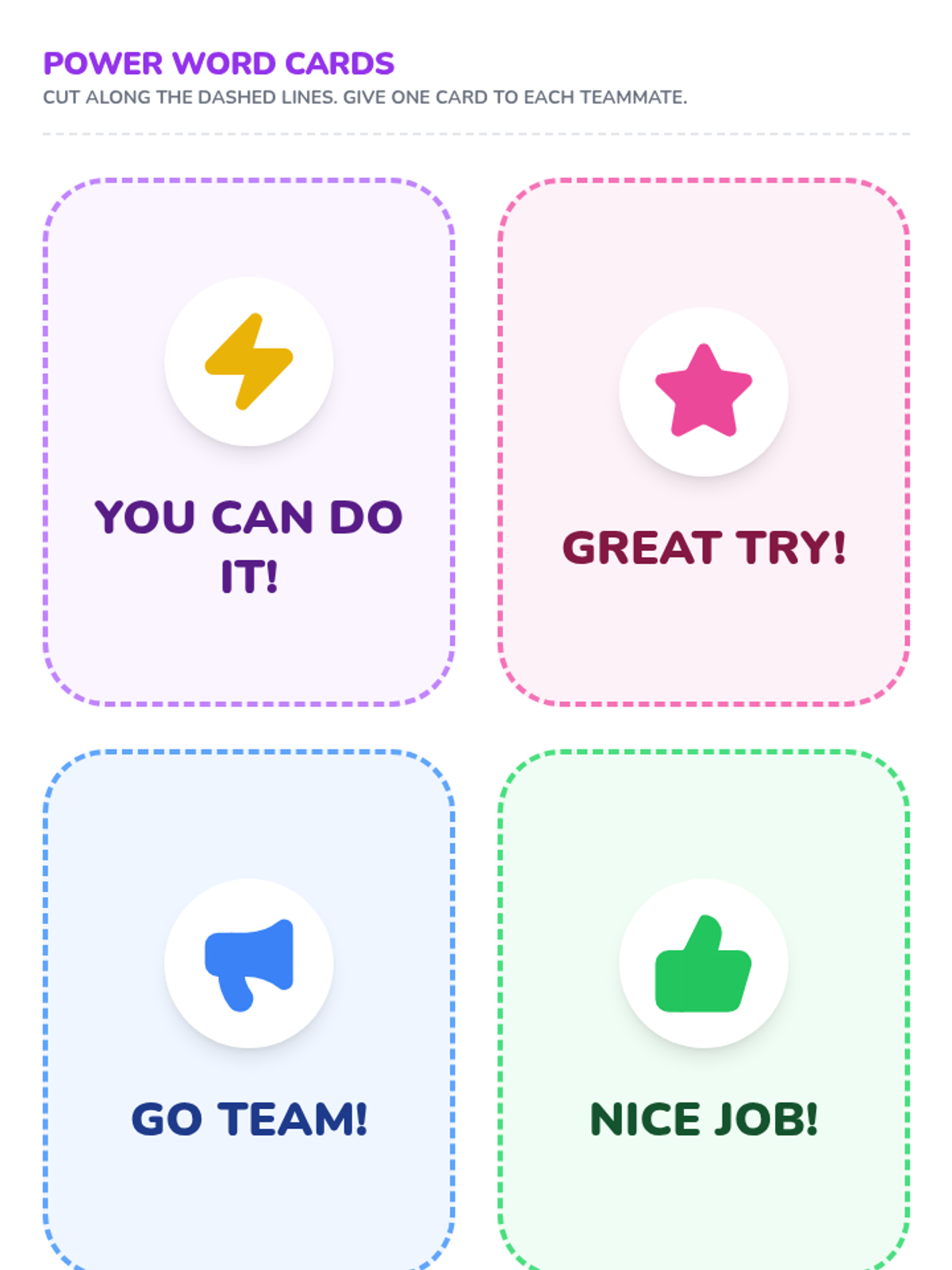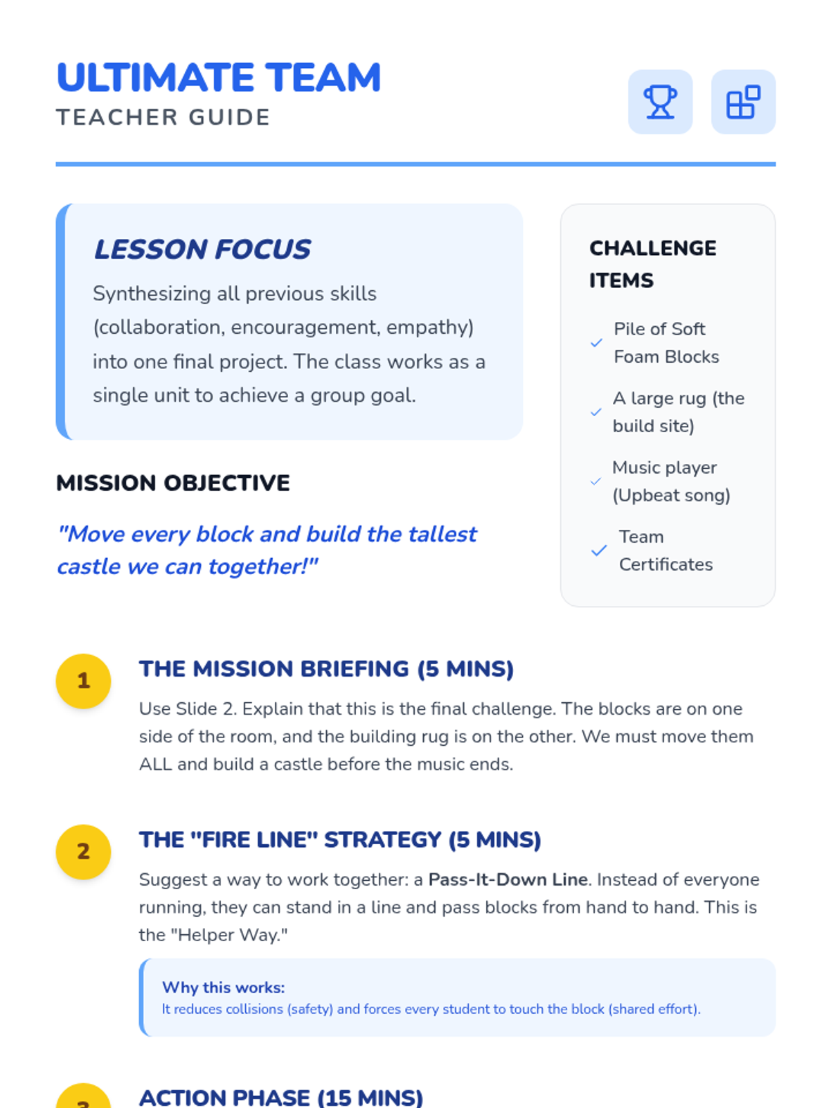 This sequence introduces Pre-K students to the concept of sportsmanship through teamwork, group cooperation, and positive encouragement. Students move from understanding what a teammate is to practicing collective goal-setting and verbal support.