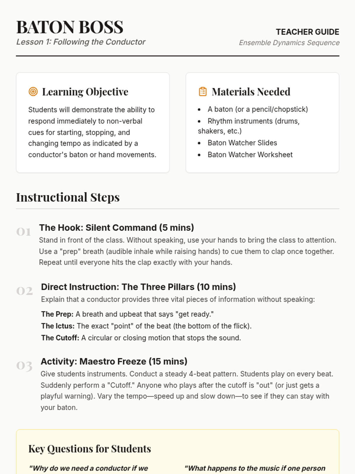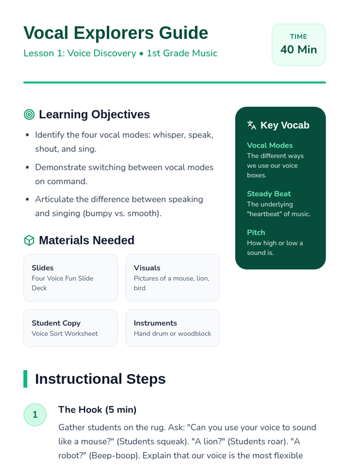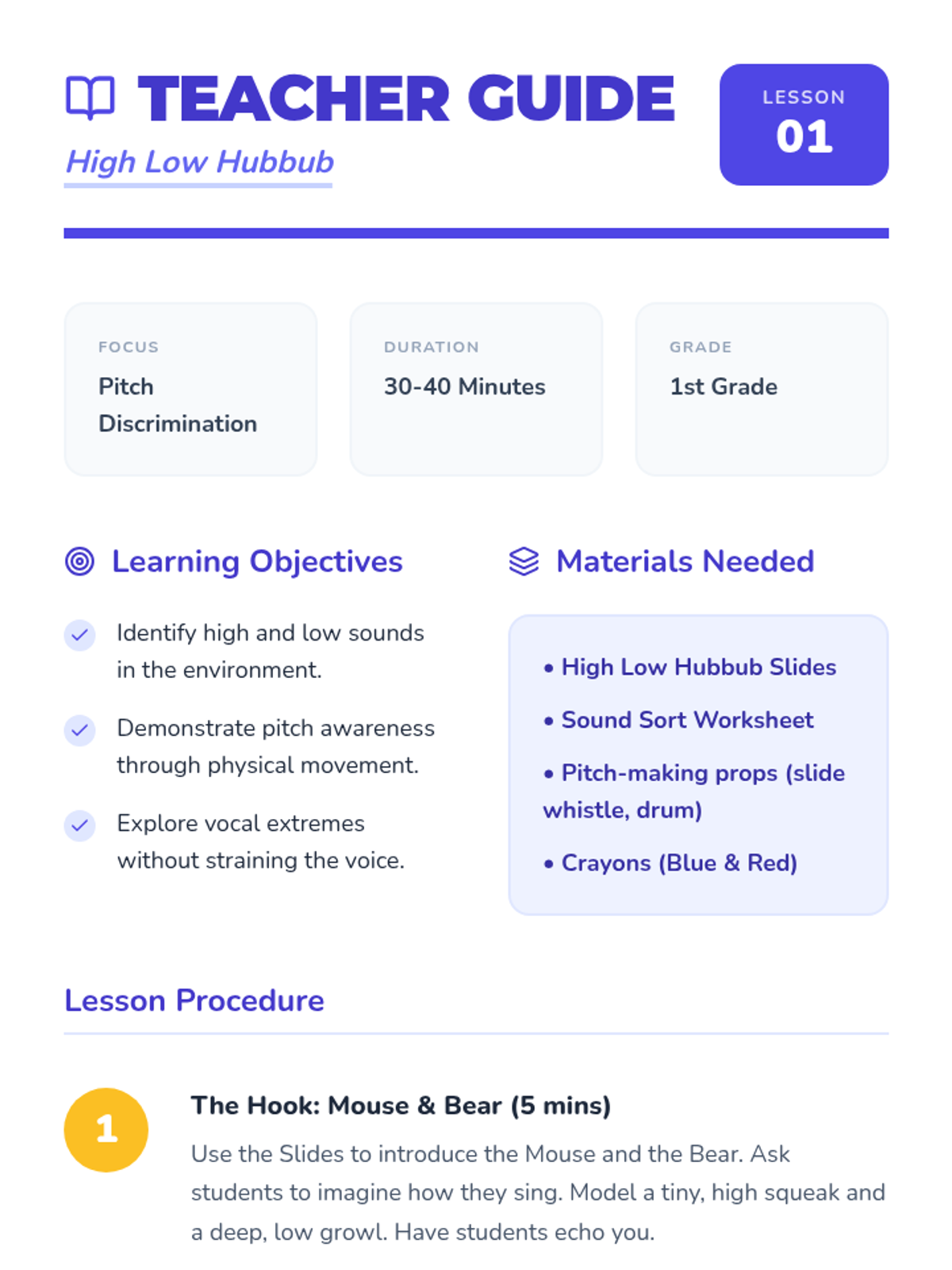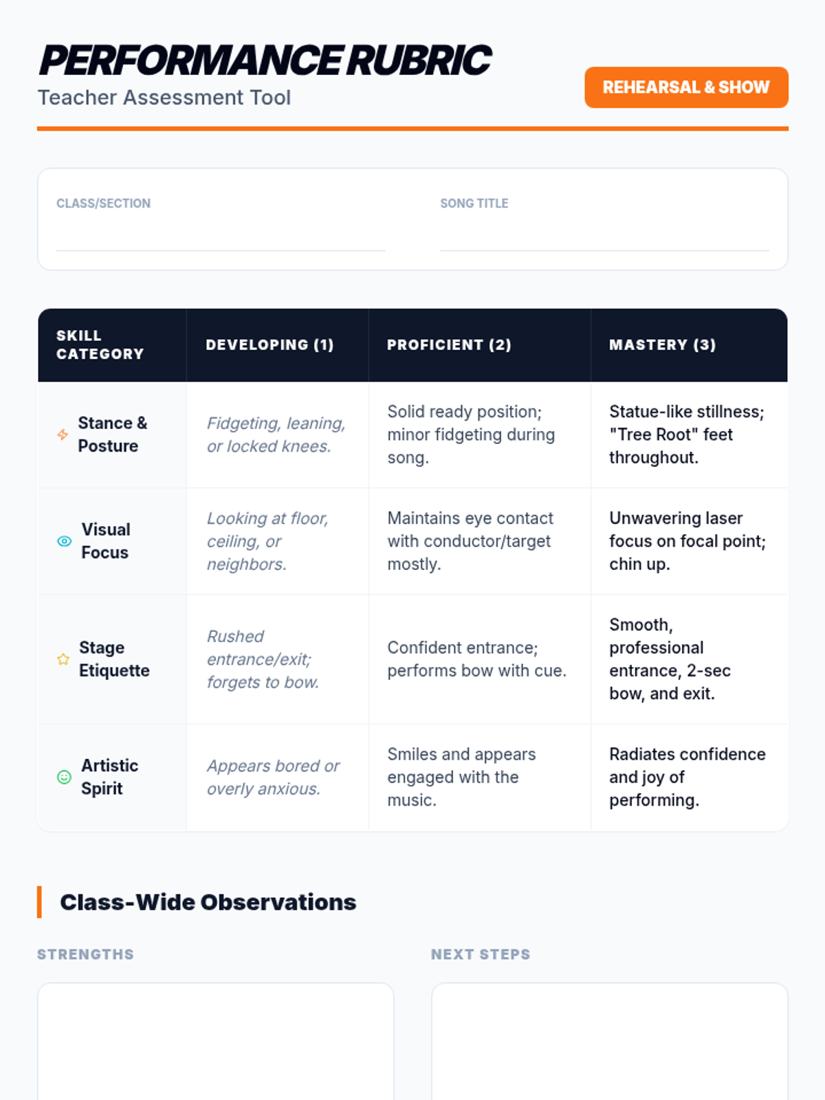 This sequence guides 1st-grade students through the transition from singers to performers. Over five lessons, students master the physical discipline of the performer's stance, visual focus, stage etiquette (entrances and bows), and the full rehearsal process, culminating in a classroom concert.