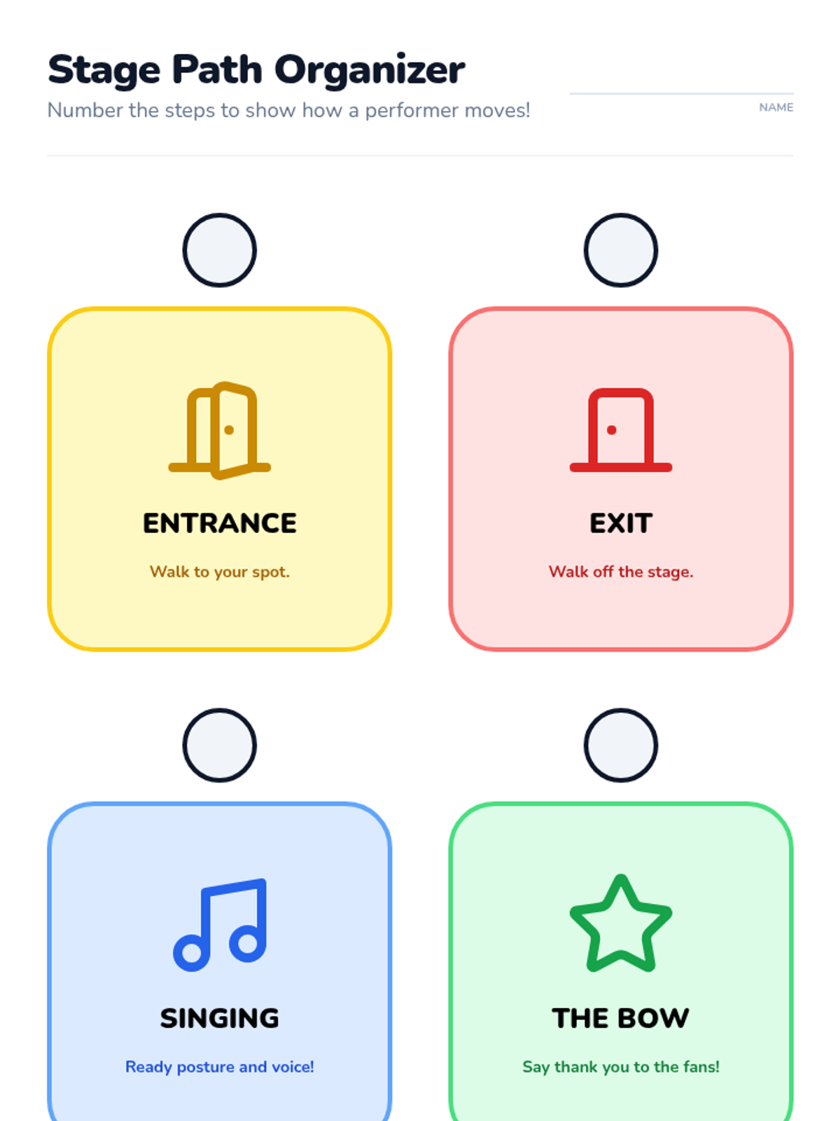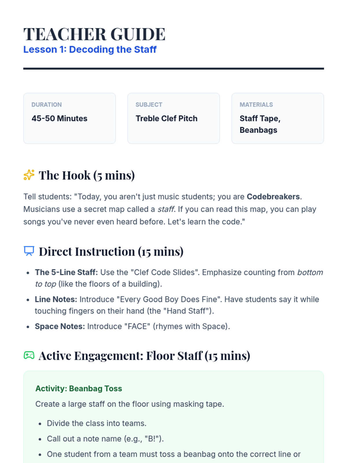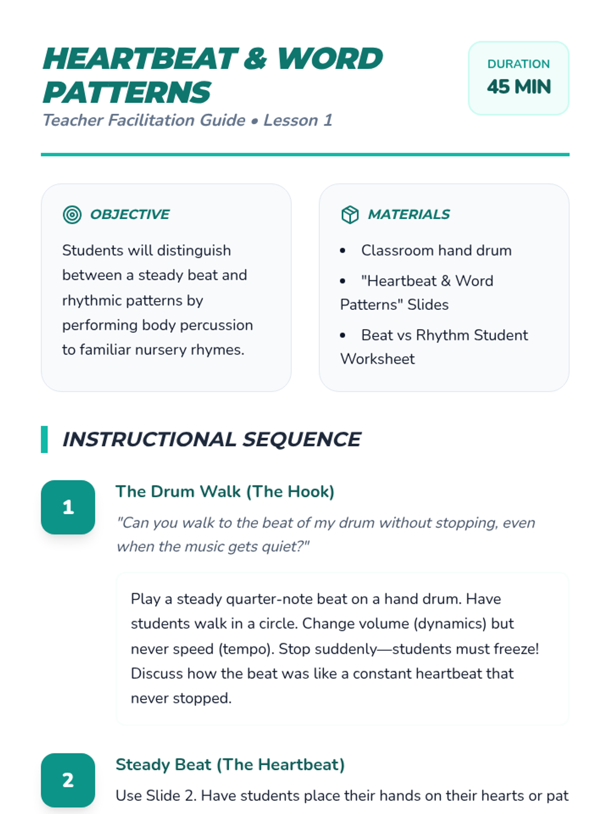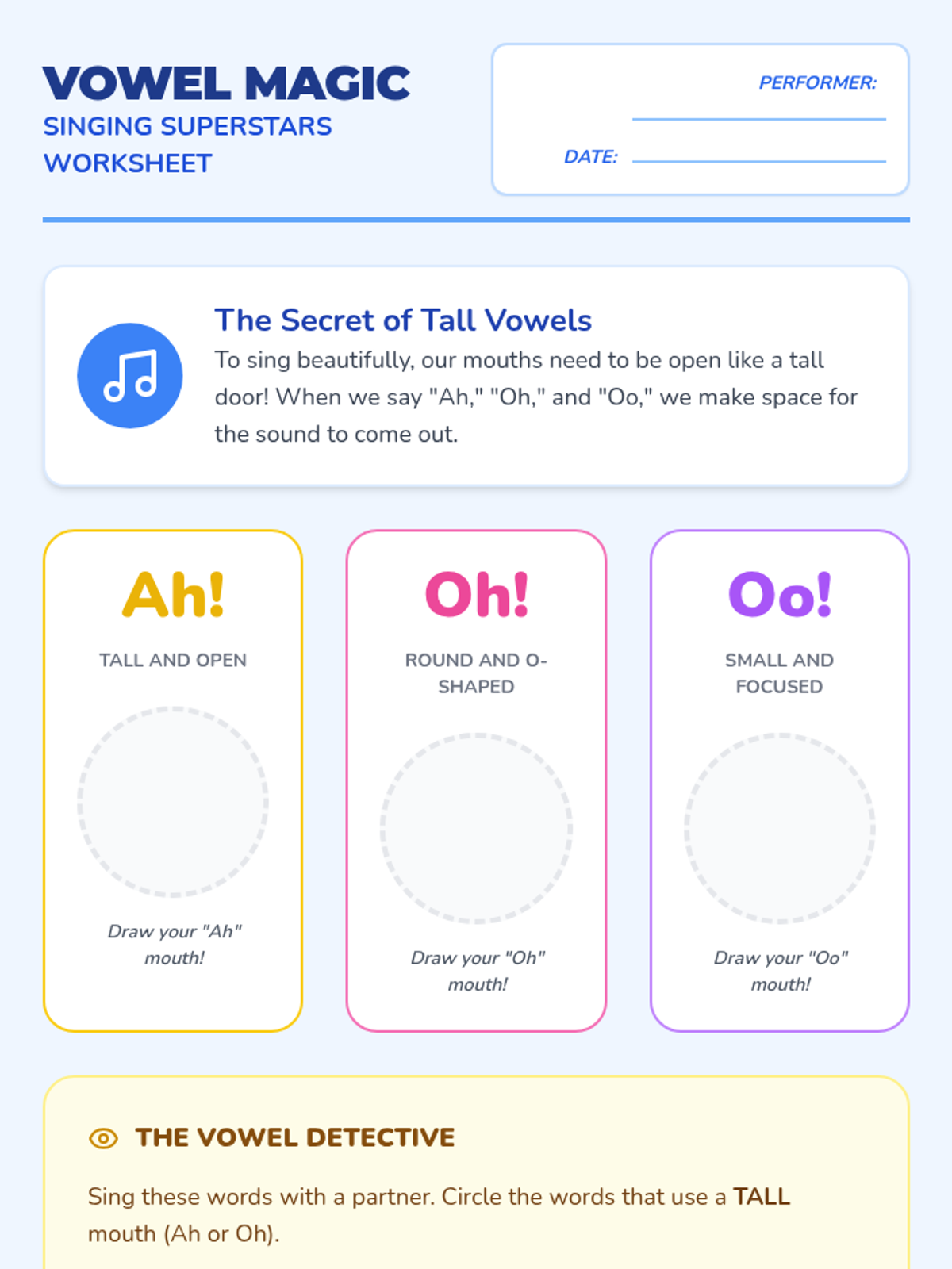This sequence guides 1st-grade students through the transition from singers to performers. Over five lessons, students master the physical discipline of the performer's stance, visual focus, stage etiquette (entrances and bows), and the full rehearsal process, culminating in a classroom concert.