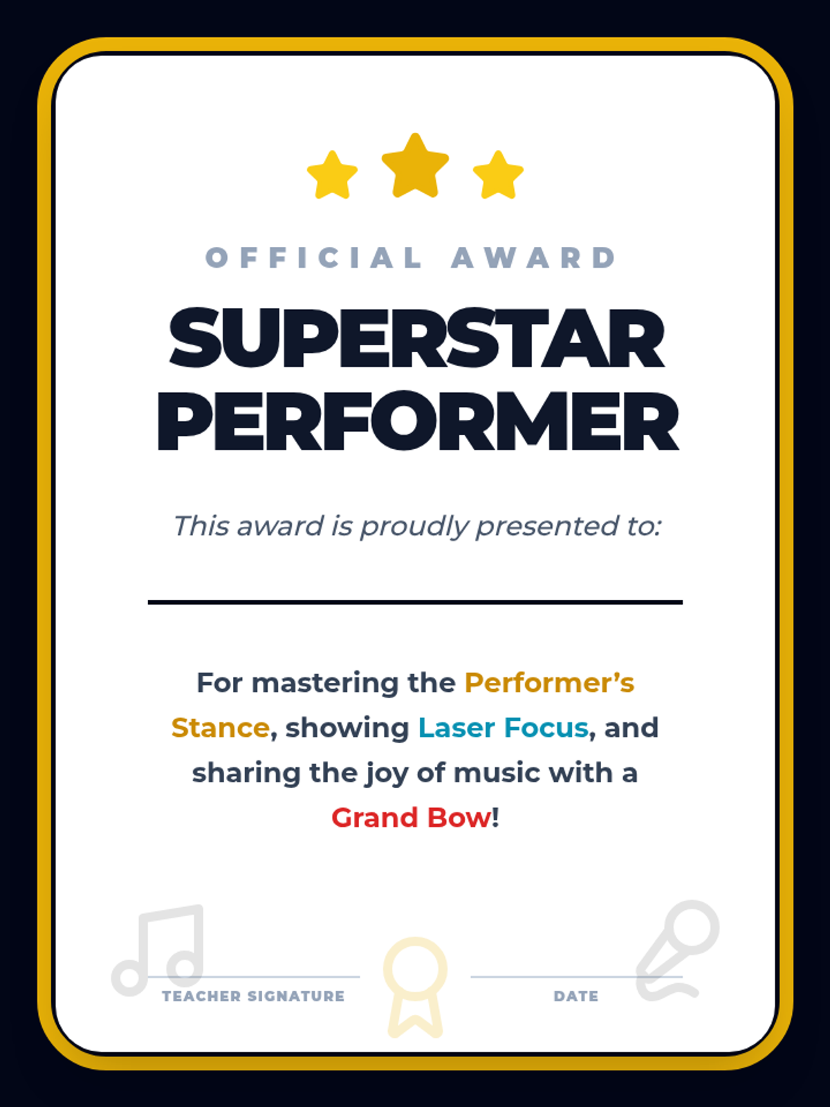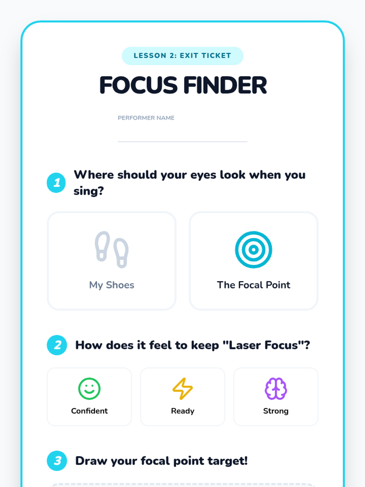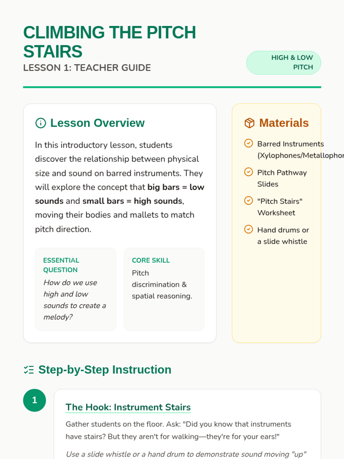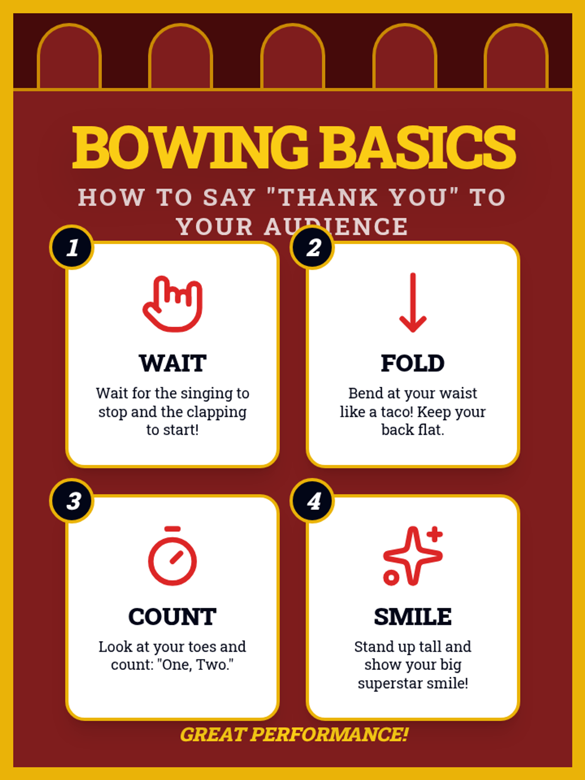 This sequence guides 1st-grade students through the transition from singers to performers. Over five lessons, students master the physical discipline of the performer's stance, visual focus, stage etiquette (entrances and bows), and the full rehearsal process, culminating in a classroom concert.
