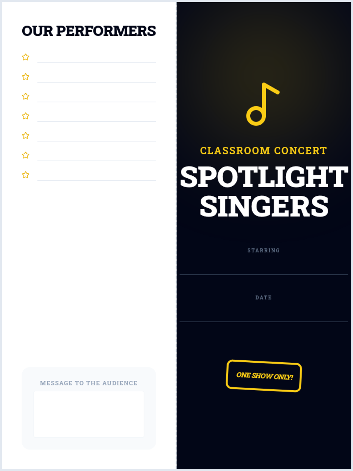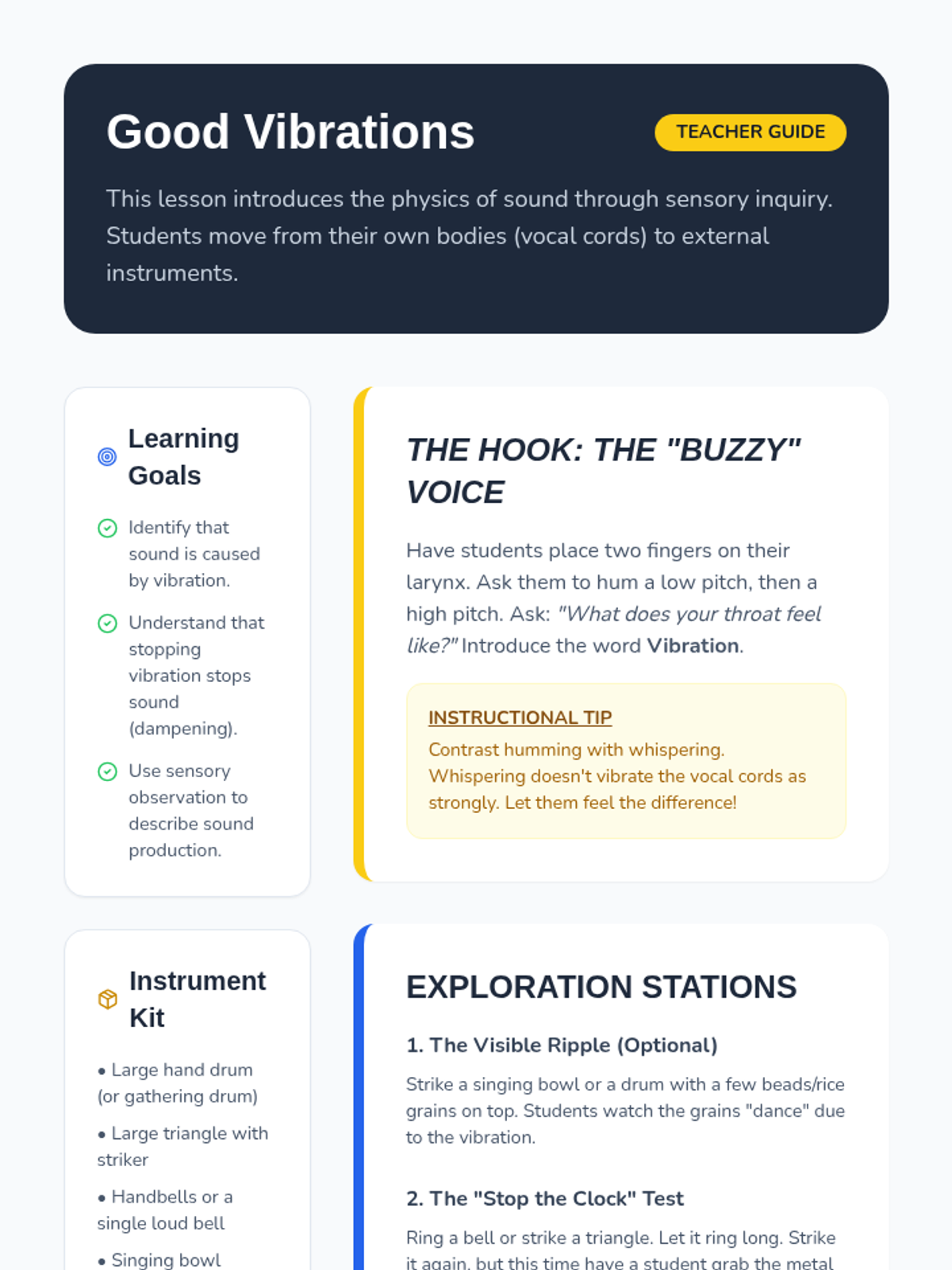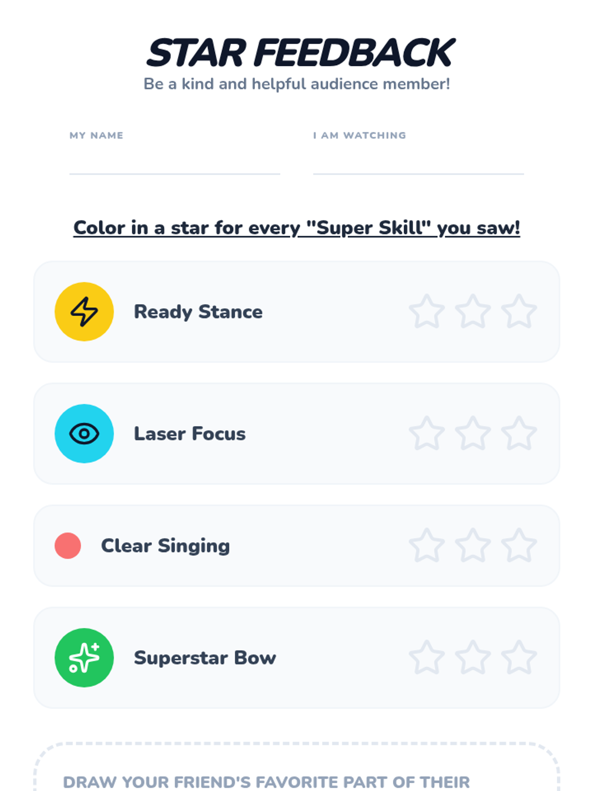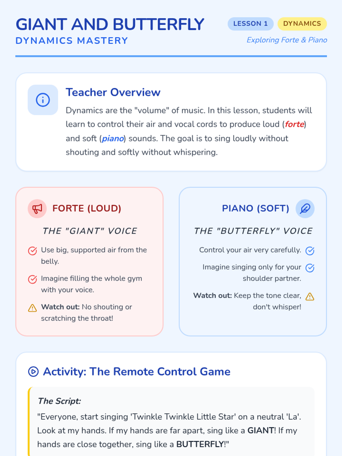 This sequence guides 1st-grade students through the transition from singers to performers. Over five lessons, students master the physical discipline of the performer's stance, visual focus, stage etiquette (entrances and bows), and the full rehearsal process, culminating in a classroom concert.