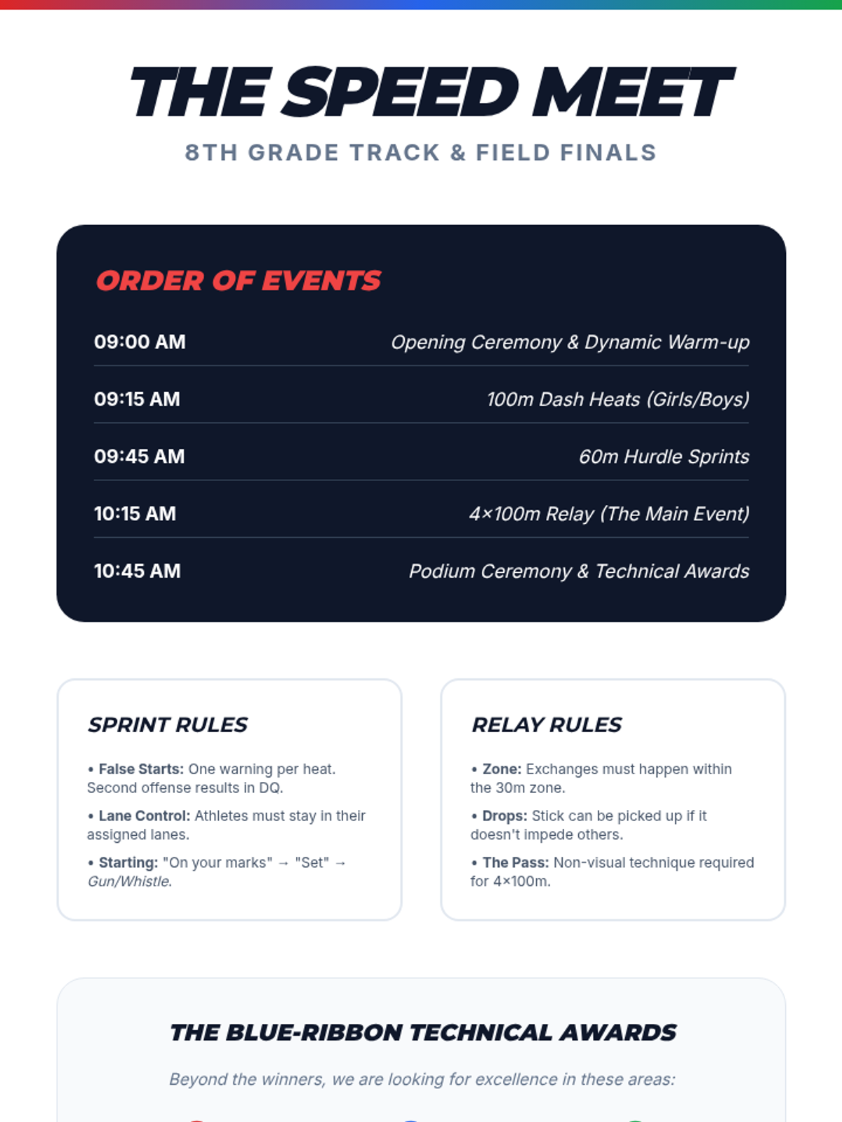 A comprehensive unit for 6th-grade PE focusing on the rules, officiating, and strategy of Track and Field. Students transition from athletes to officials, concluding with a student-led mini-meet.