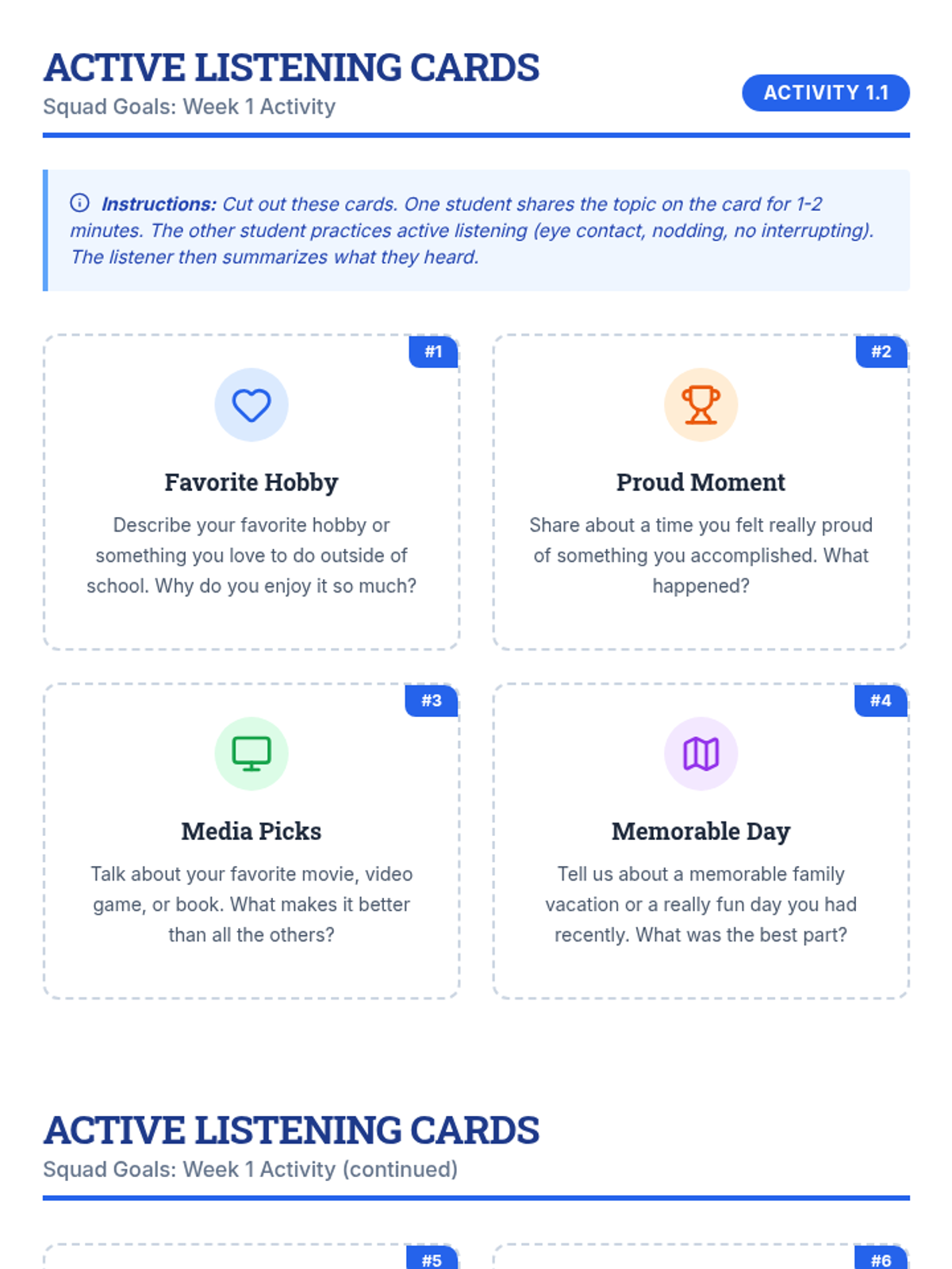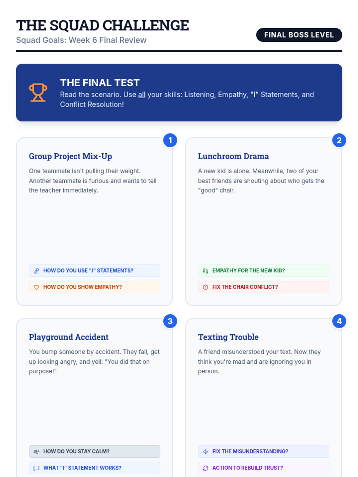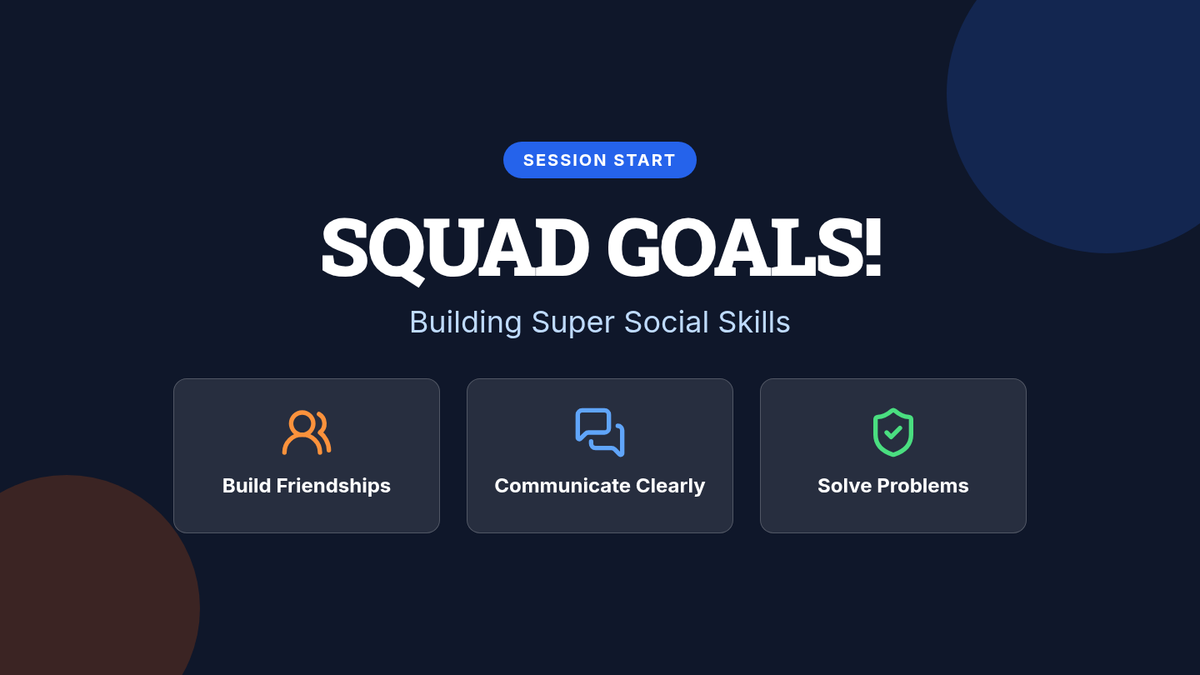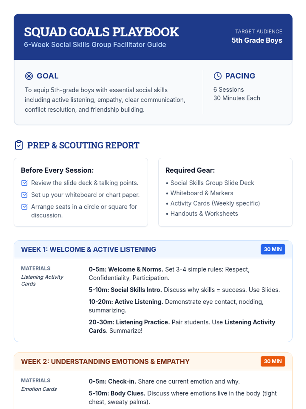 A 6-week social skills group for 5th-grade boys focused on active listening, empathy, clear communication, conflict resolution, and friendship building. The program uses a 'squad' and 'teamwork' theme to engage students in developing crucial interpersonal skills.