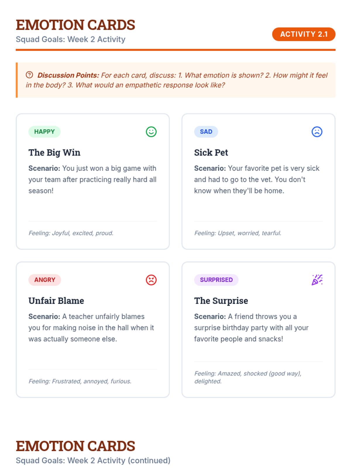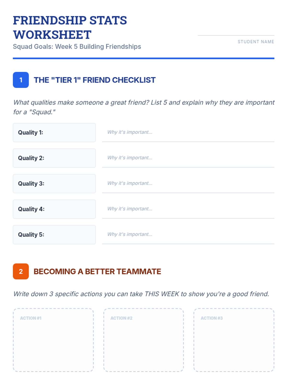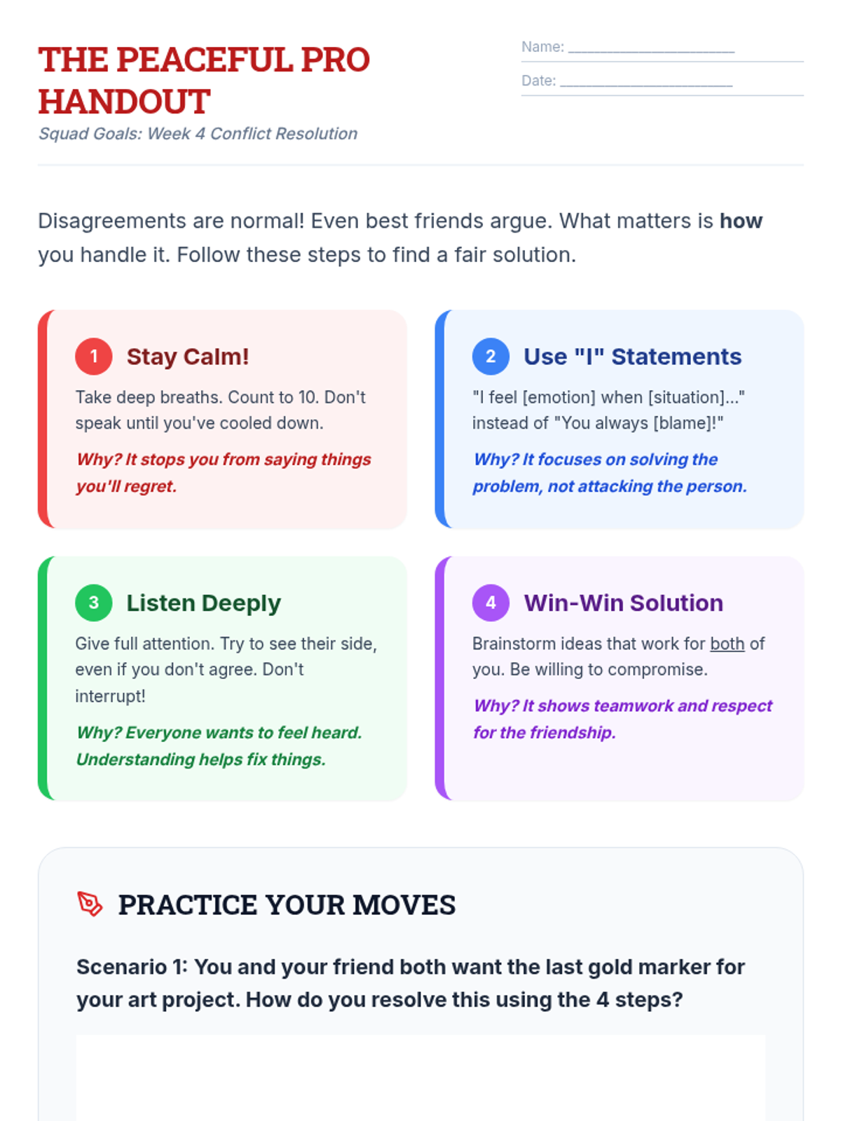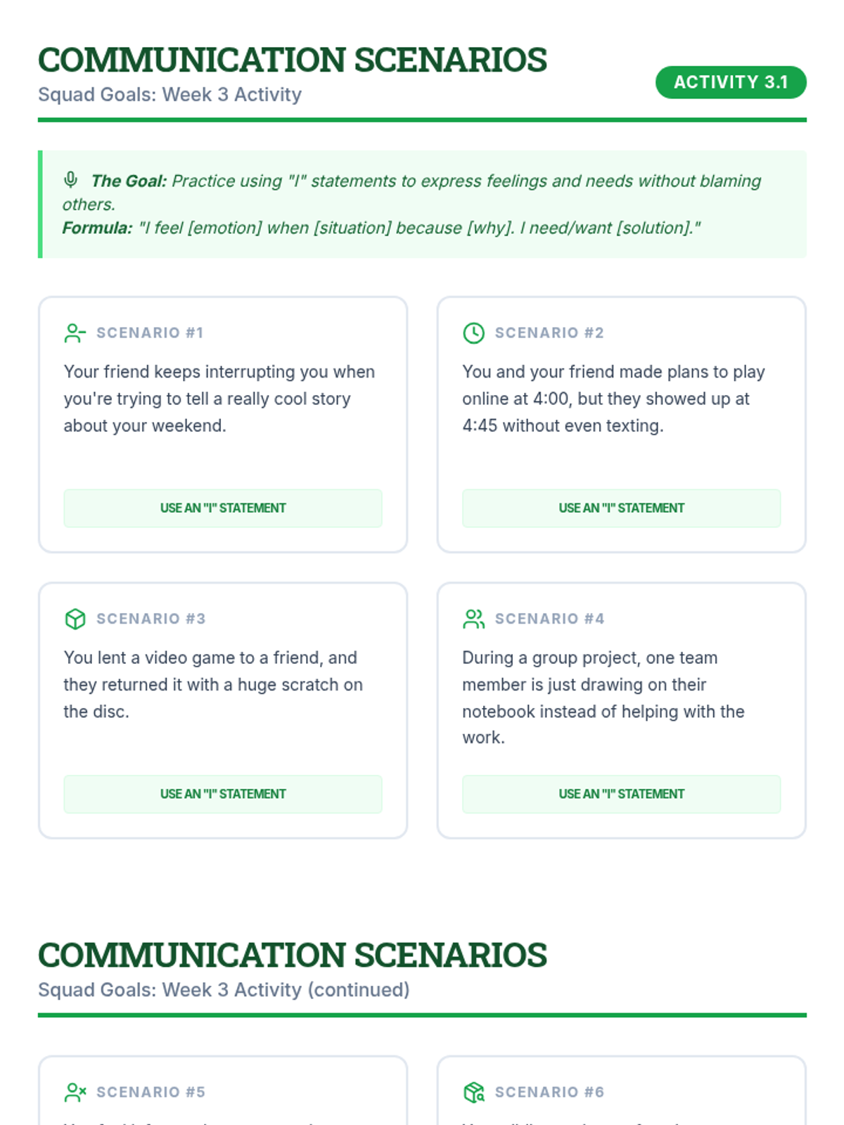 A 6-week social skills group for 5th-grade boys focused on active listening, empathy, clear communication, conflict resolution, and friendship building. The program uses a 'squad' and 'teamwork' theme to engage students in developing crucial interpersonal skills.
