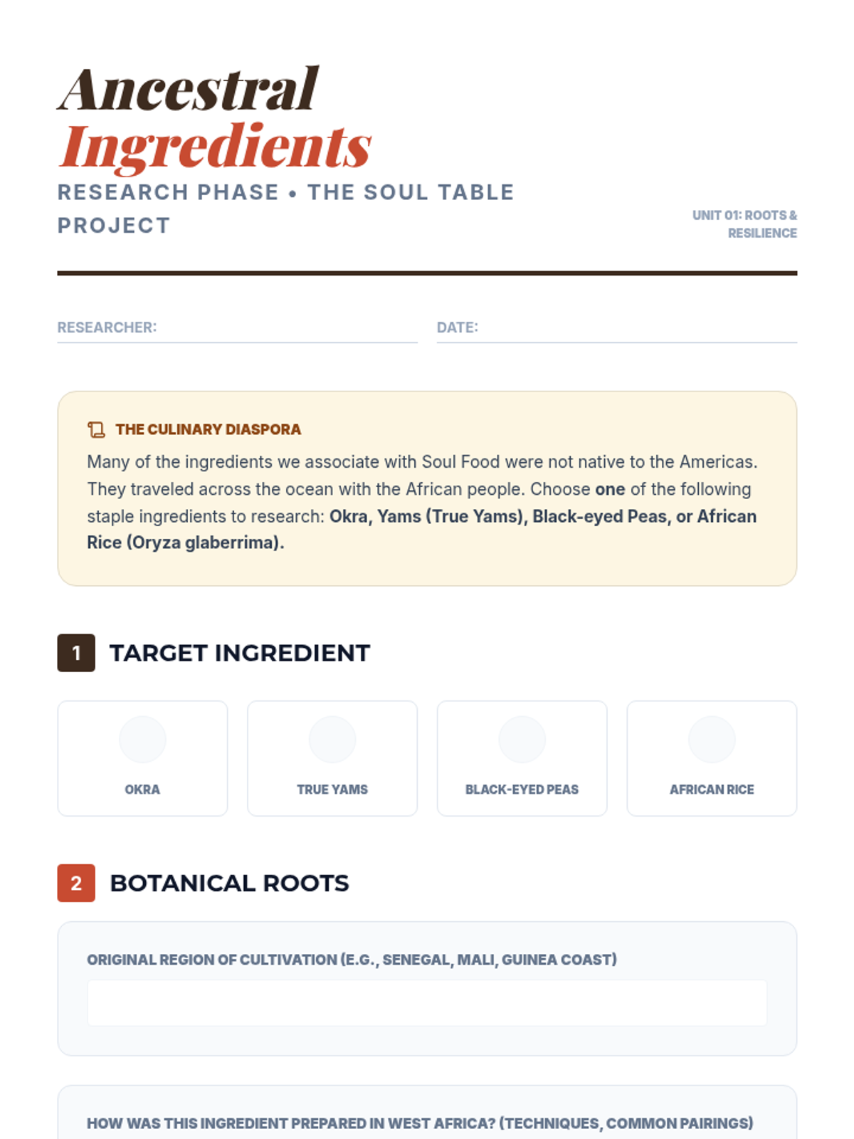 A comprehensive high school project exploring the cultural, historical, and culinary significance of Soul Food. Students research West African roots, the impact of the Great Migration, and design a modern, health-conscious Soul Food menu that honors heritage while embracing the future.