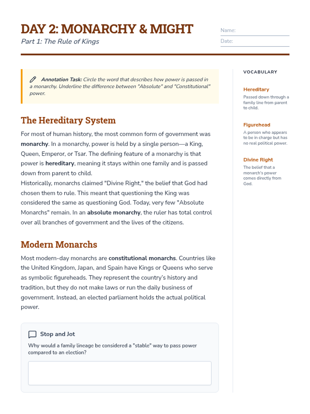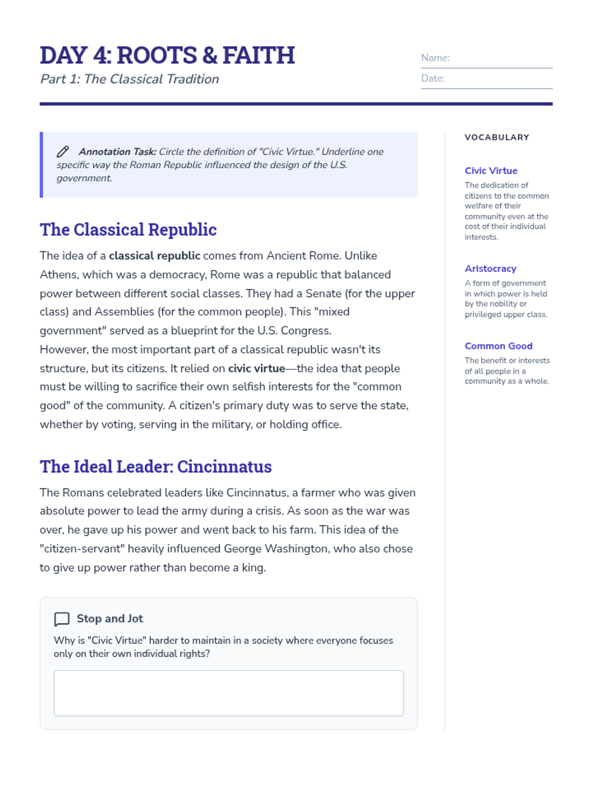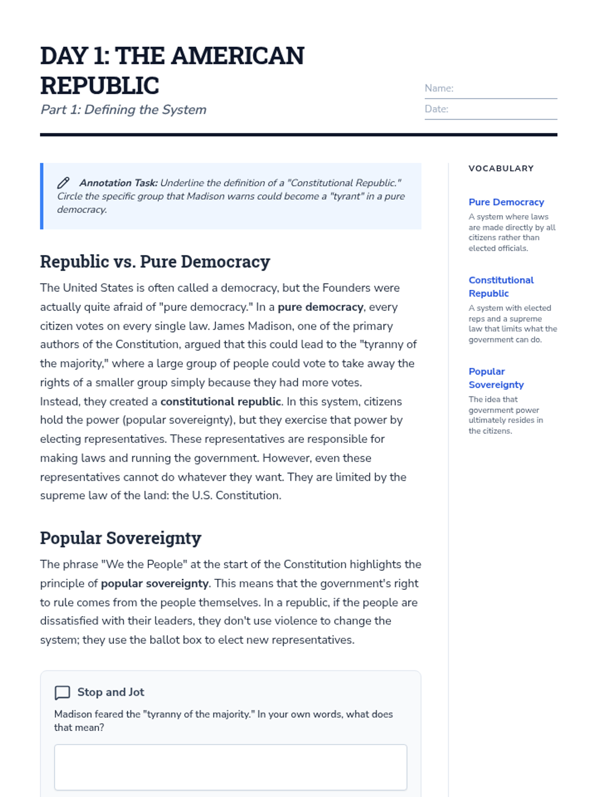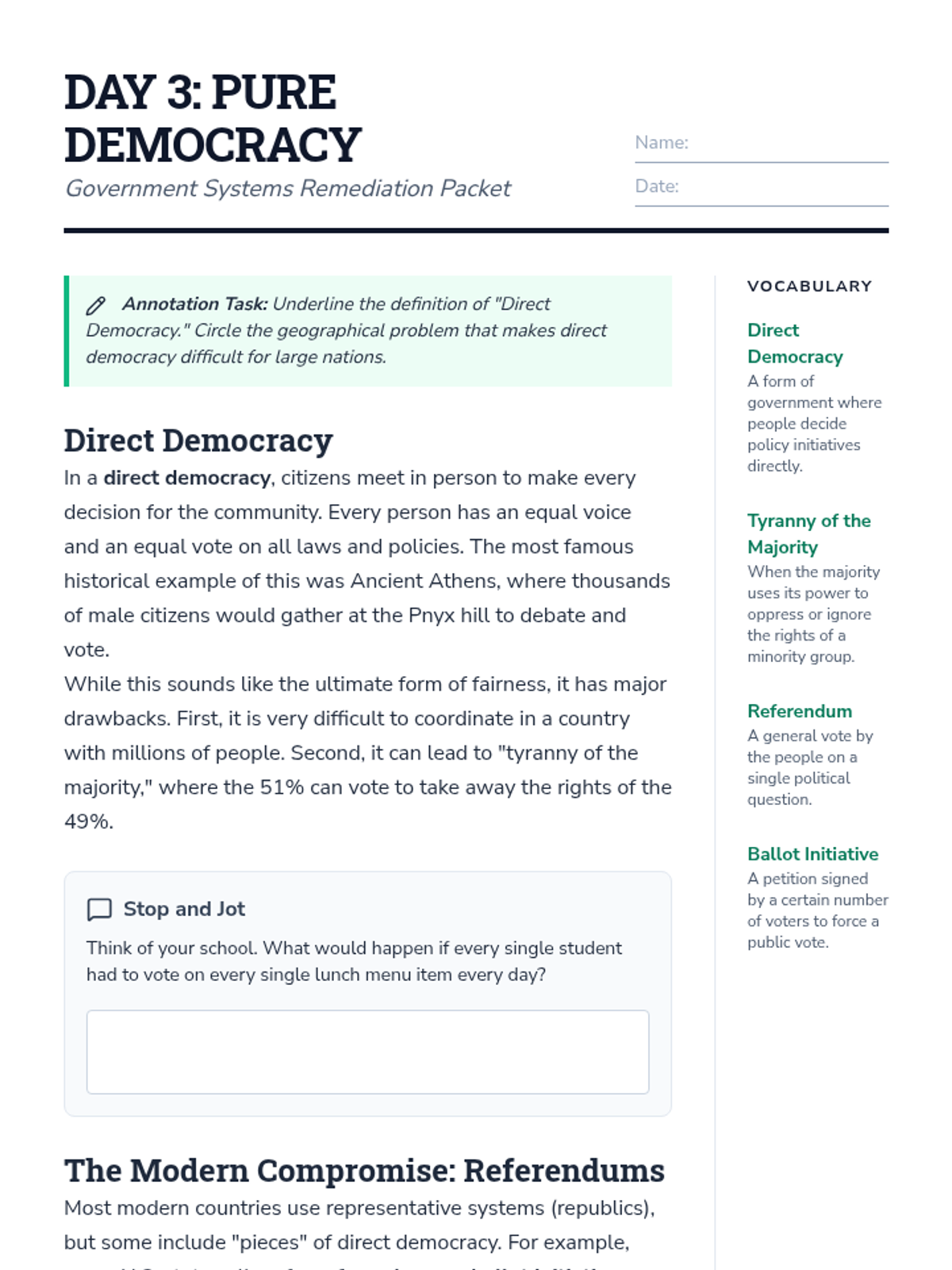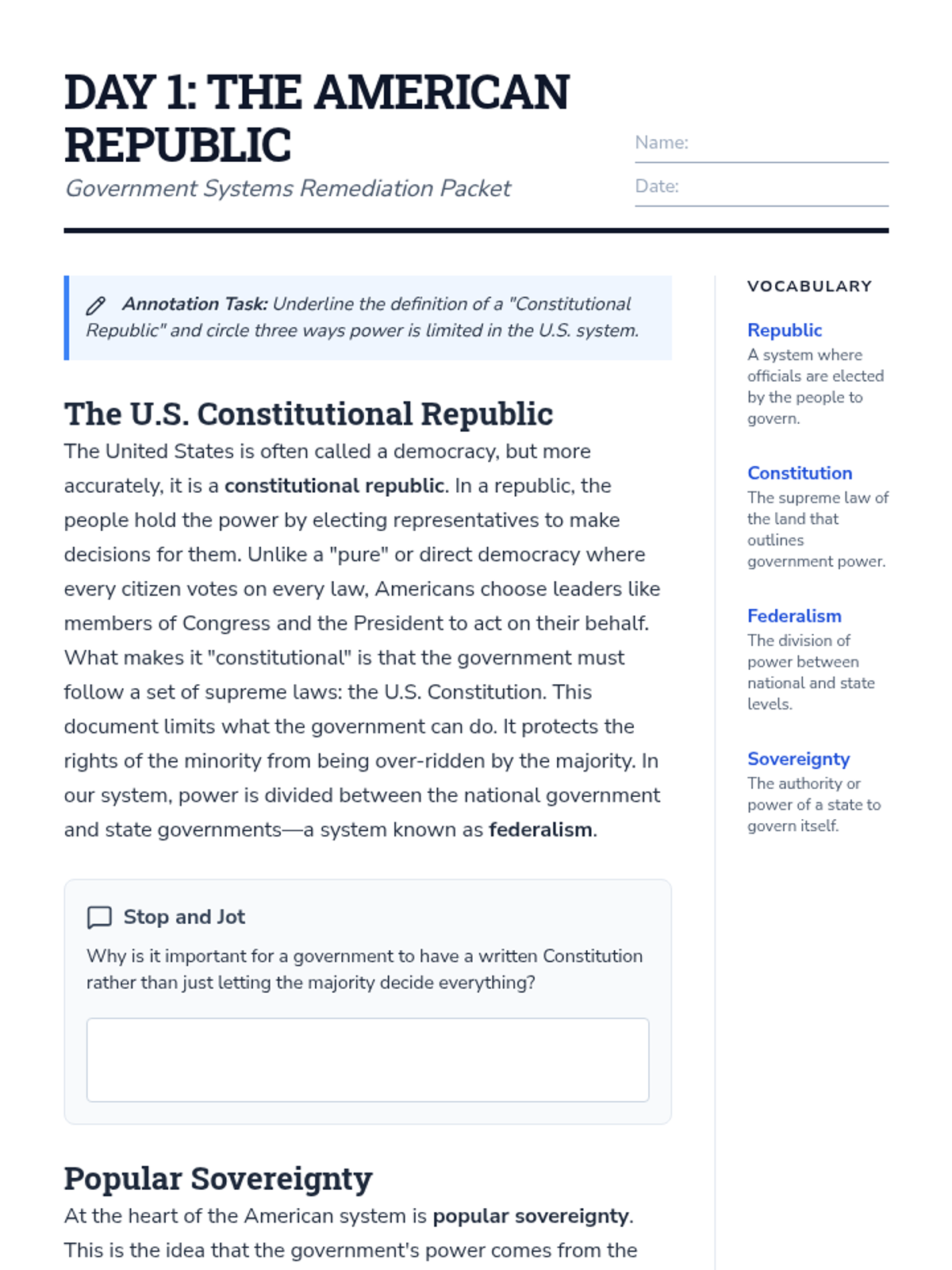 A 7-day comprehensive remediation sequence focused on the philosophical, historical, and individual foundations of American government. Designed for students needing mastery of TEKS 1 and 12B, the unit features structured readers, skill-building worksheets, and a cumulative assessment.