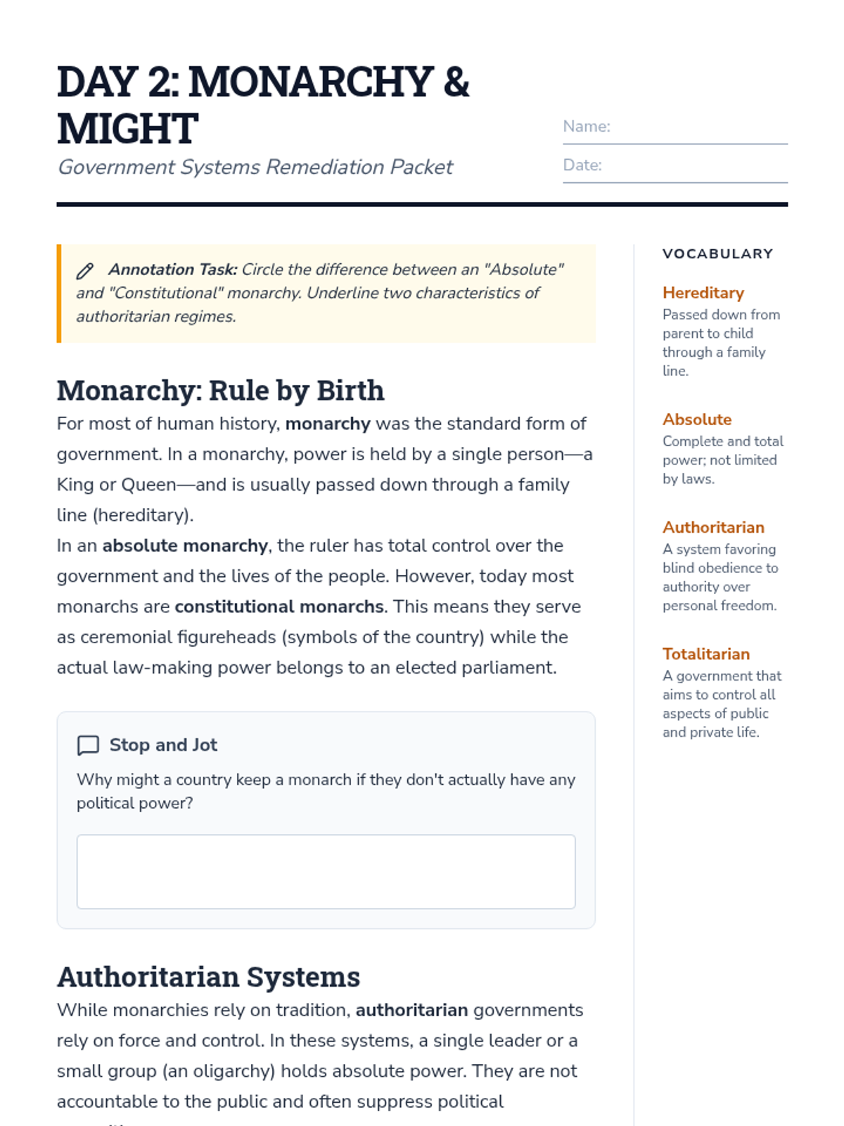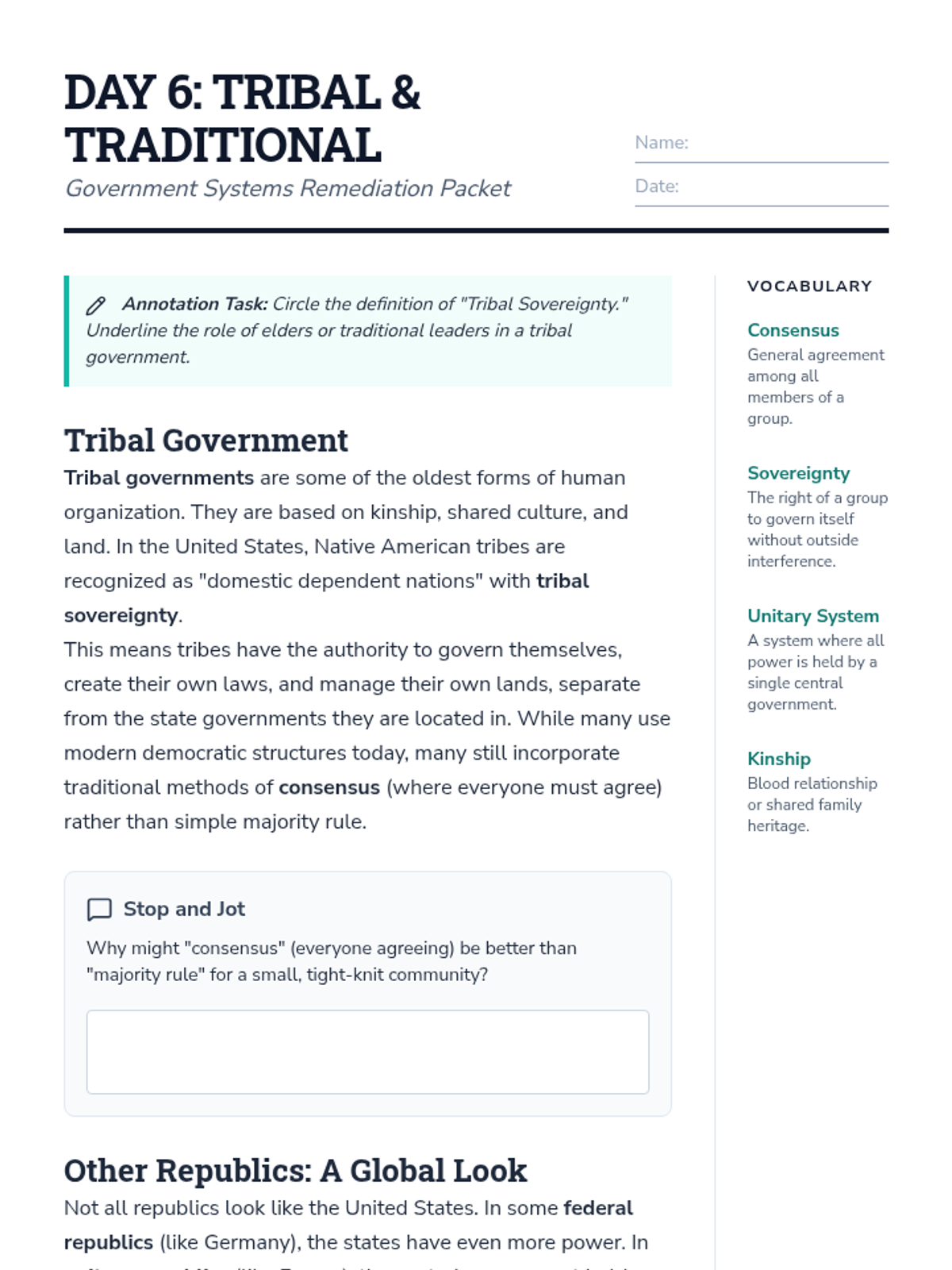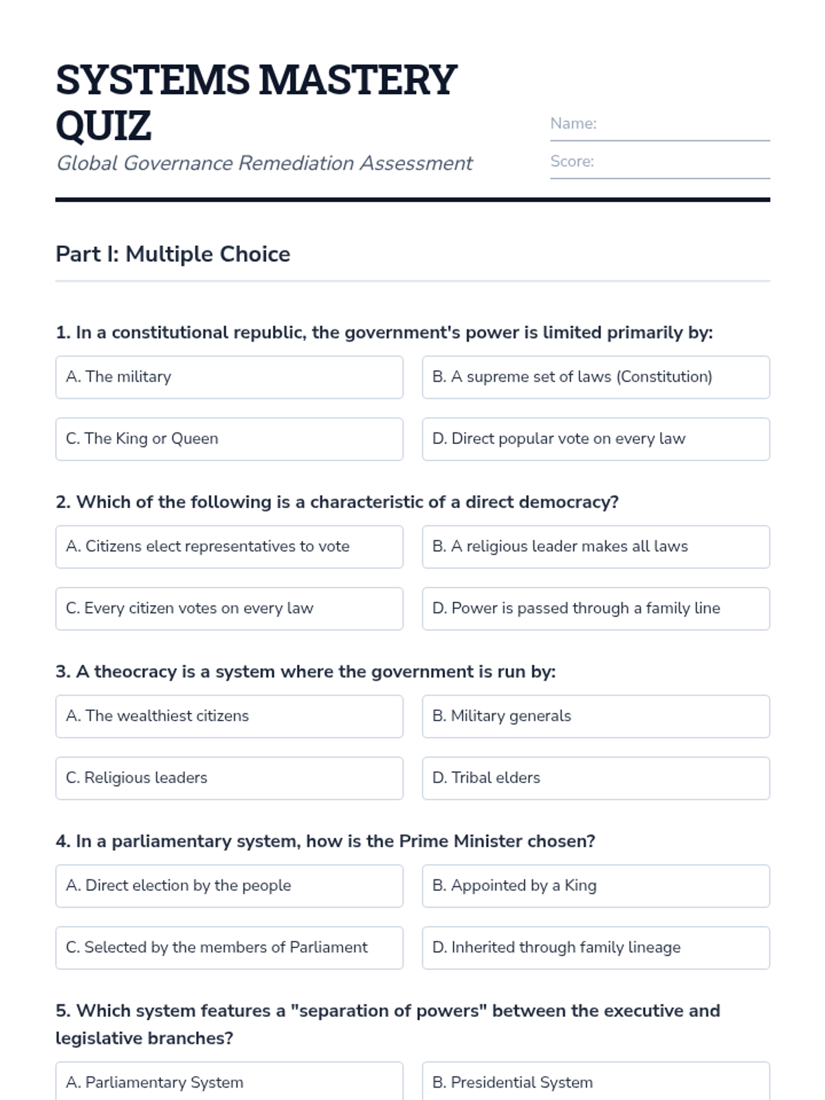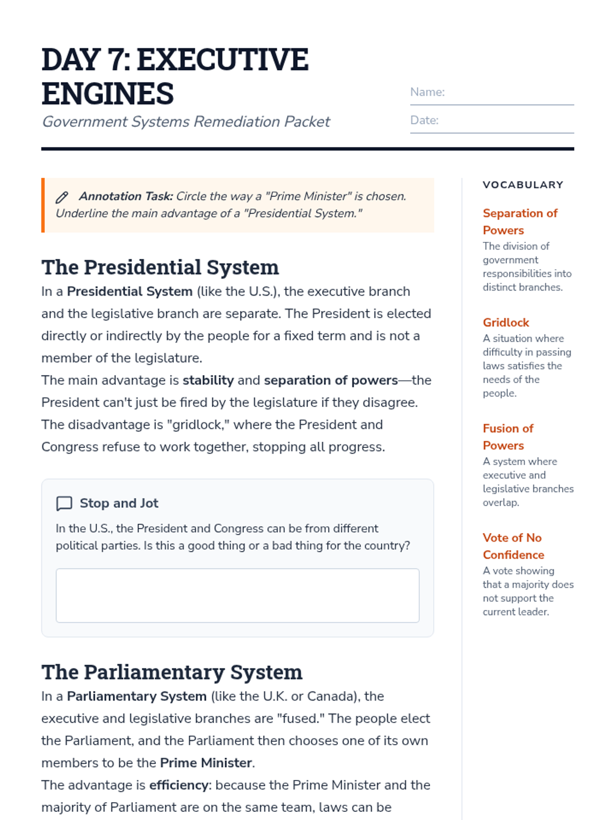 A comprehensive 7-day remediation unit covering various forms of government, comparing the U.S. constitutional republic to historical and contemporary systems, and analyzing executive structures.