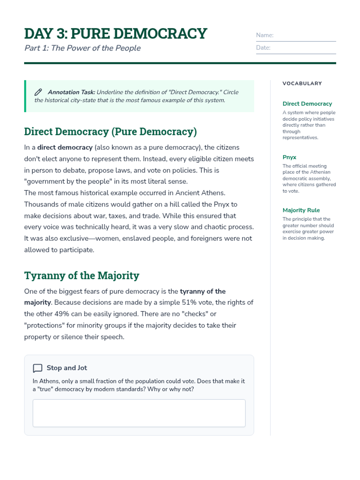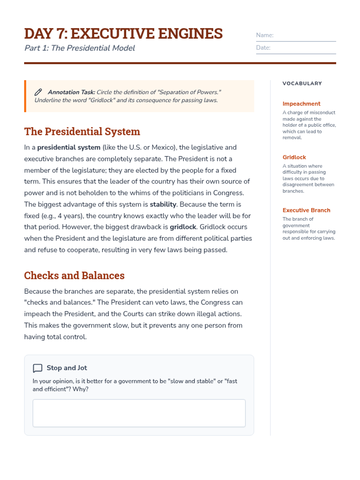 A comprehensive exploration of the United States government structure, focusing on the three branches, checks and balances, and the legislative process. Students engage in active simulations to understand how power is distributed and exercised.