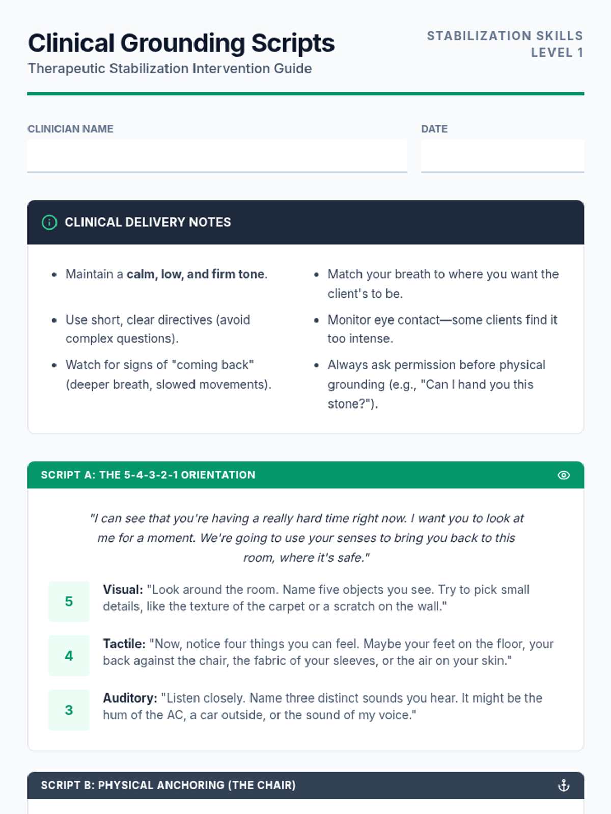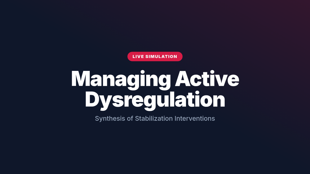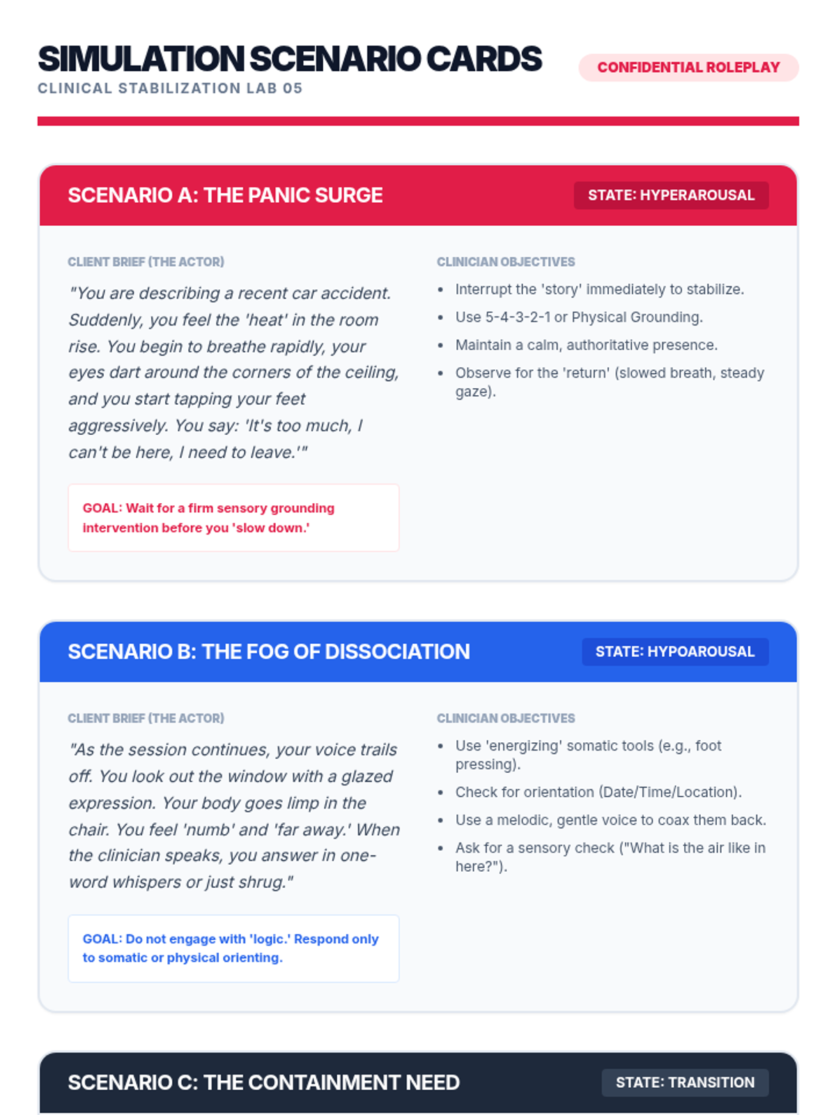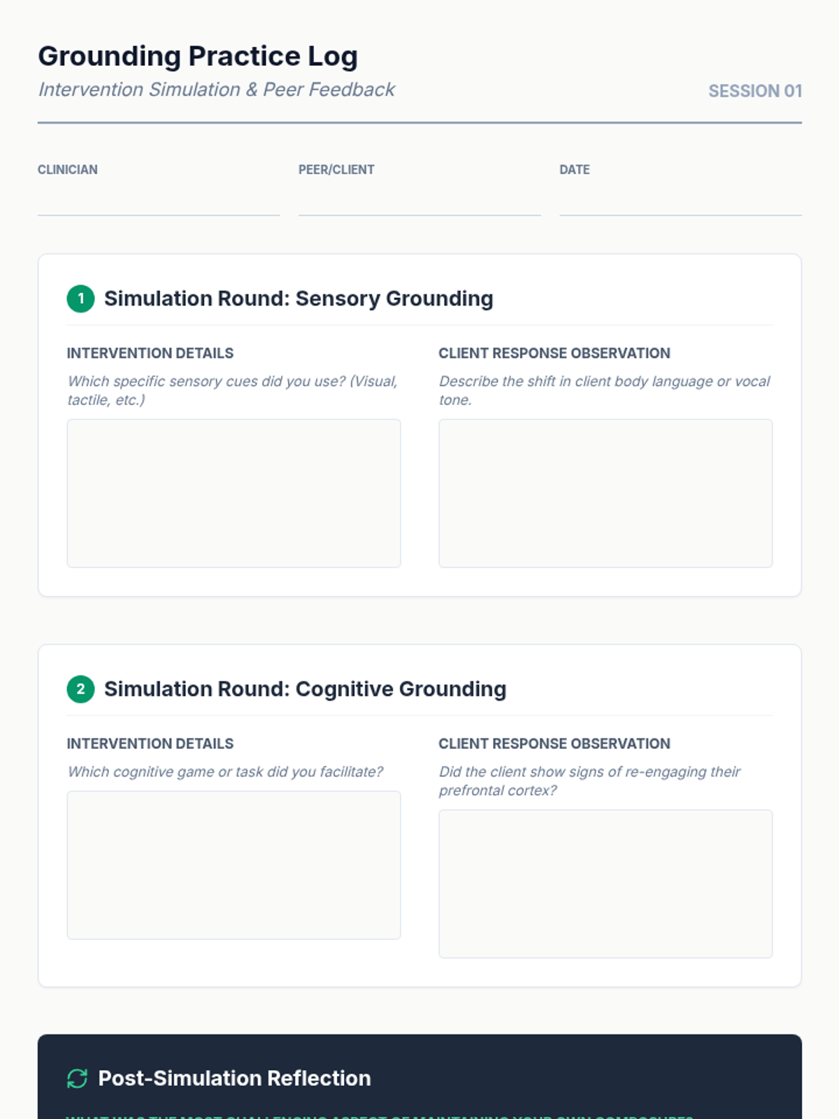 This sequence trains undergraduate counseling students in active intervention skills to manage client dysregulation and facilitate stabilization. Moving from immediate sensory grounding to somatic interventions and cognitive containment, students build the 'in-the-room' muscle memory required to restore a client's window of tolerance.