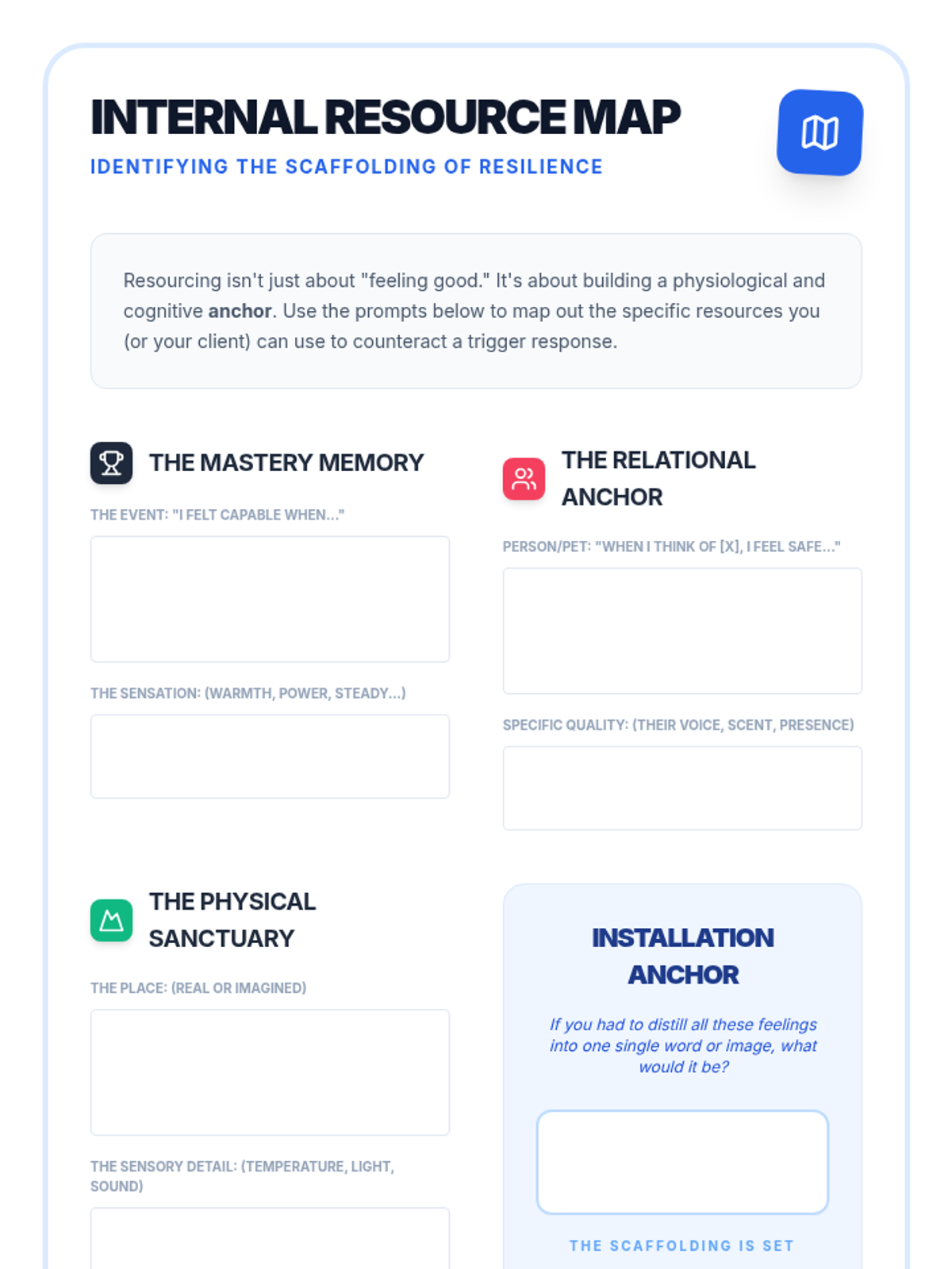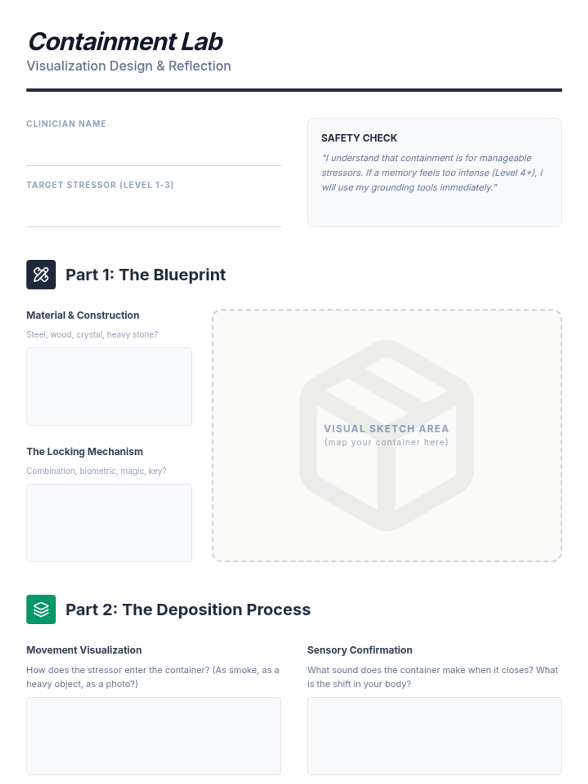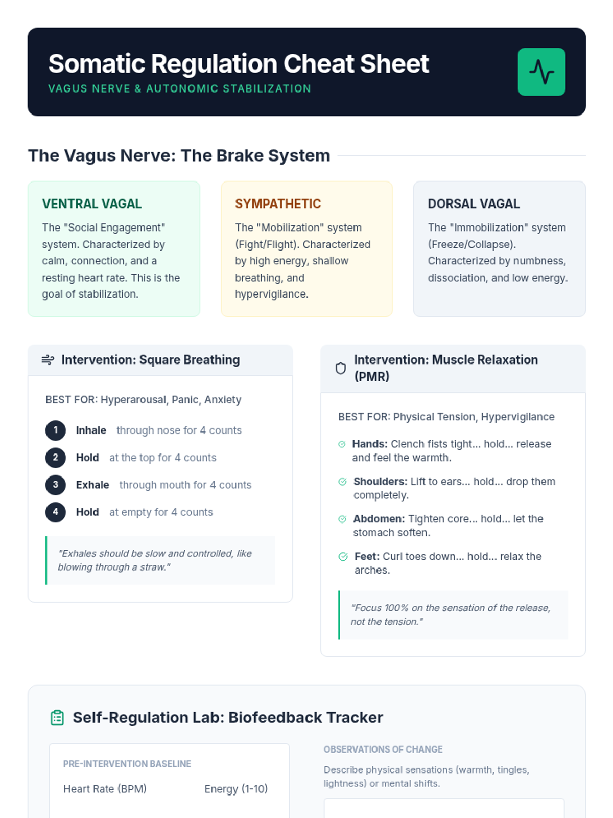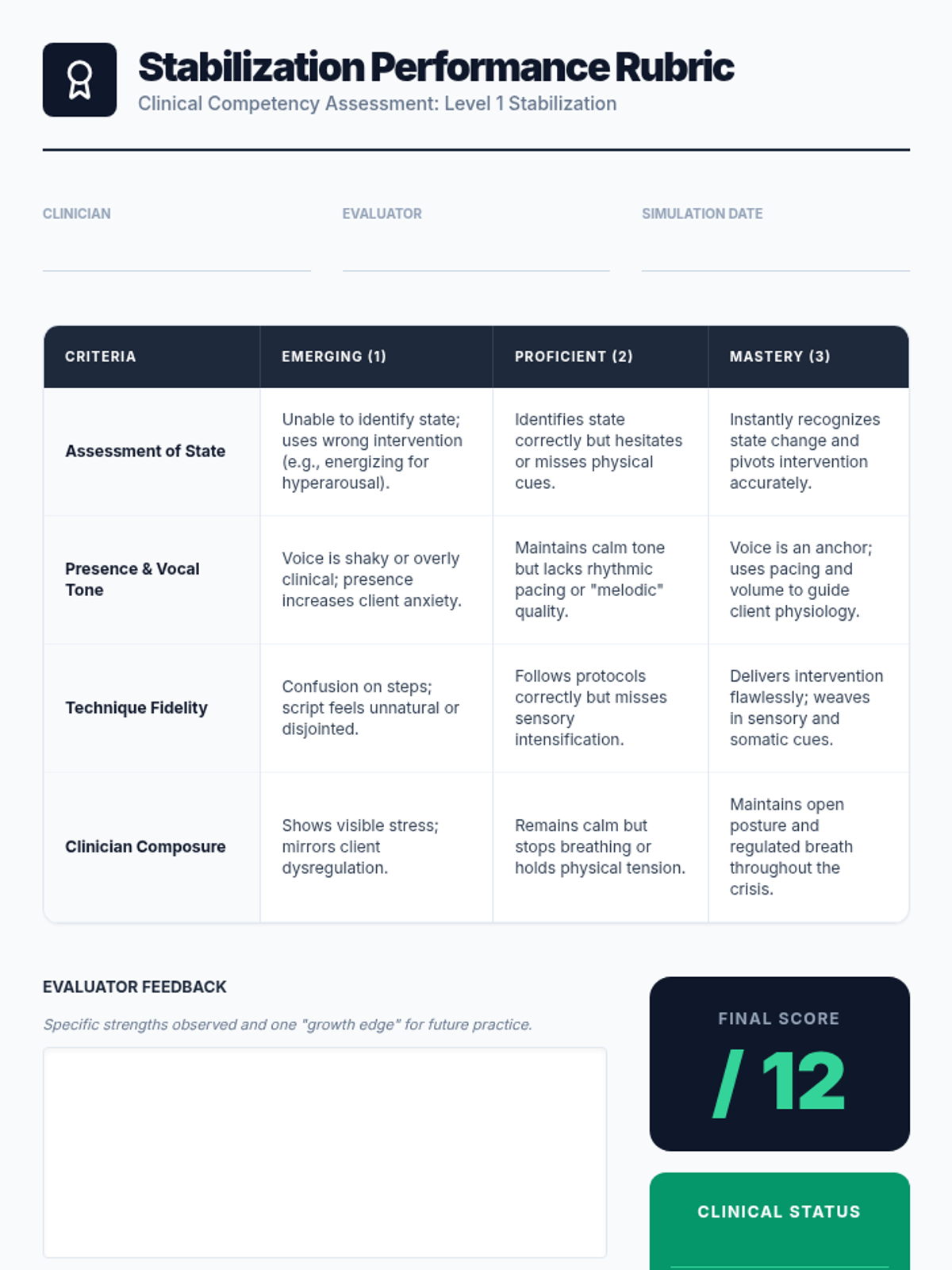 This sequence trains undergraduate counseling students in active intervention skills to manage client dysregulation and facilitate stabilization. Moving from immediate sensory grounding to somatic interventions and cognitive containment, students build the 'in-the-room' muscle memory required to restore a client's window of tolerance.