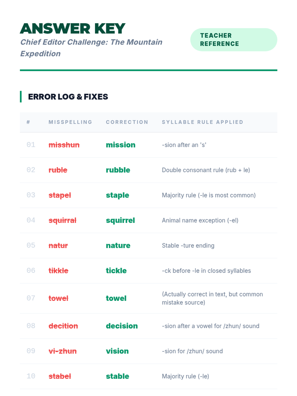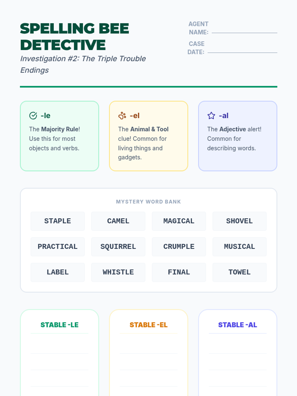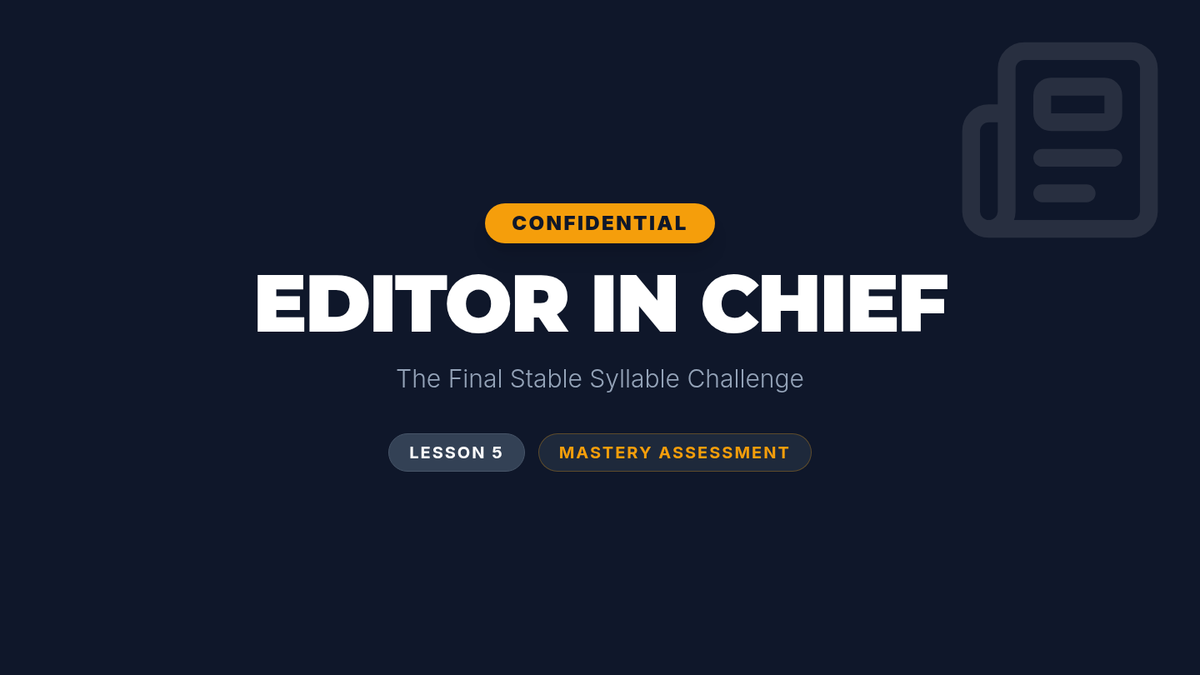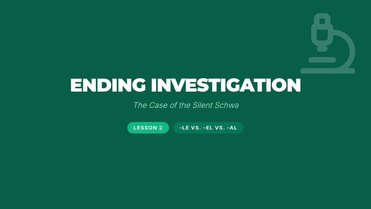 A 5-lesson sequence for 4th graders to master final stable syllables, focusing on the Consonant-le pattern, schwa sounds in endings (-le, -el, -al), complex suffixes like -tion and -ture, and morphological connections. Students progress from mechanical syllabication to expert-level editing and word analysis.