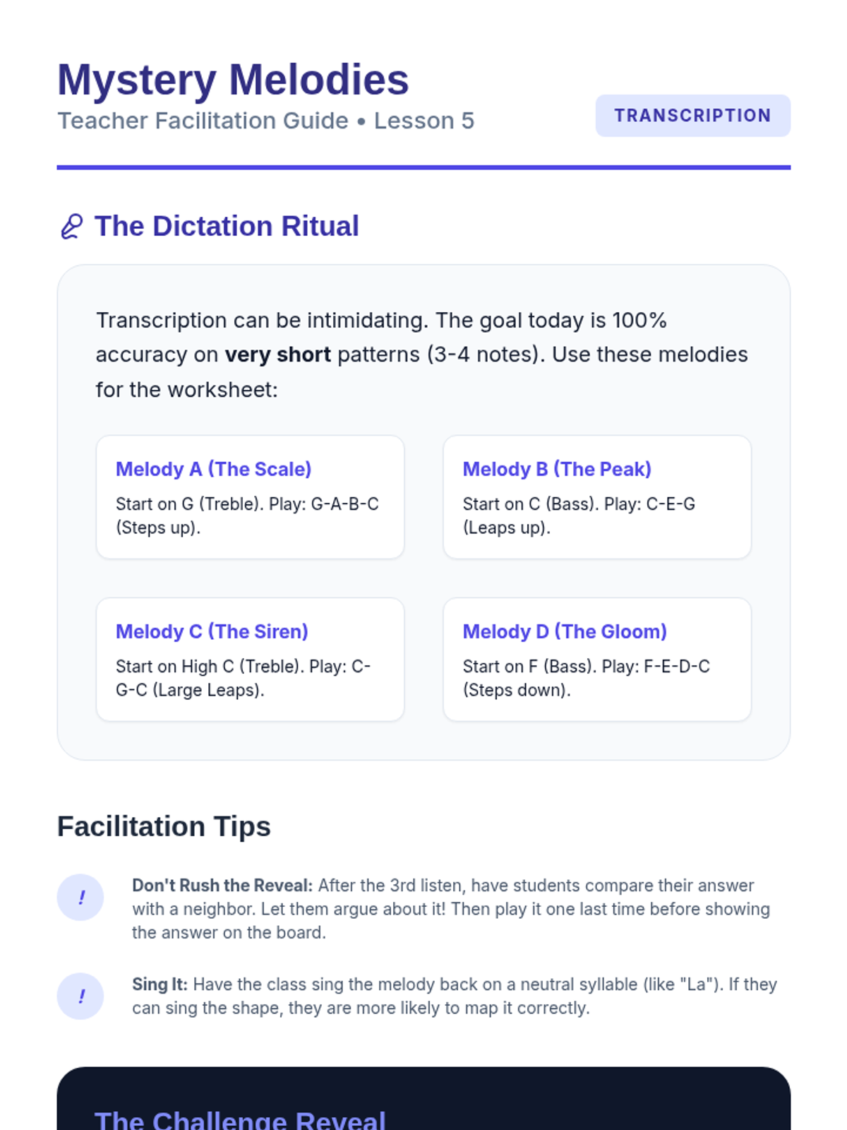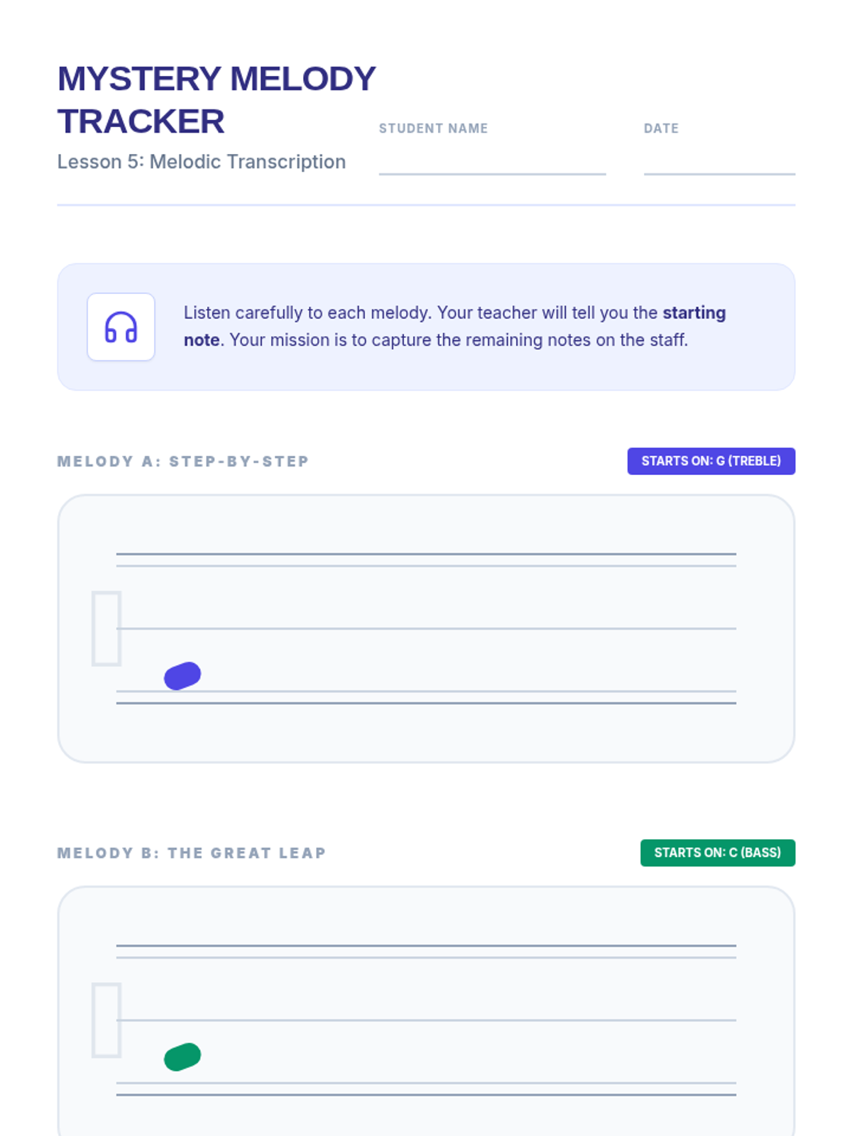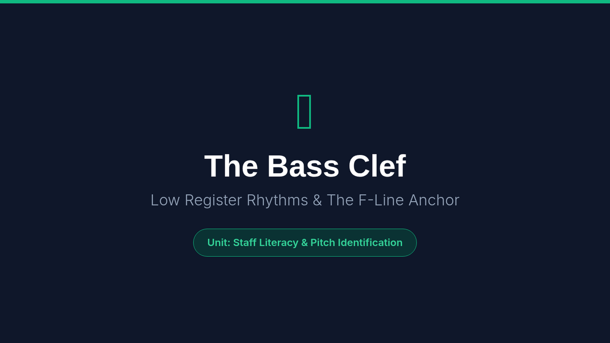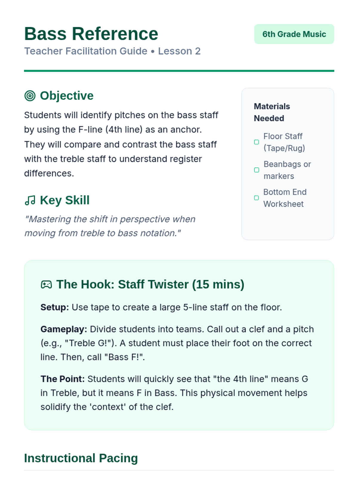 A comprehensive sequence for 6th-grade students to master the Grand Staff, covering treble and bass clefs, ledger lines, accidentals, and basic melodic transcription through a mastery-based approach.