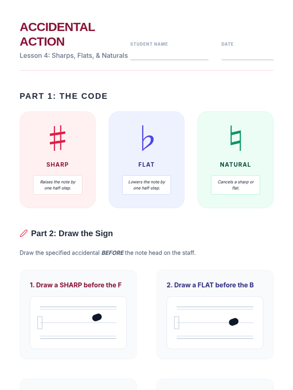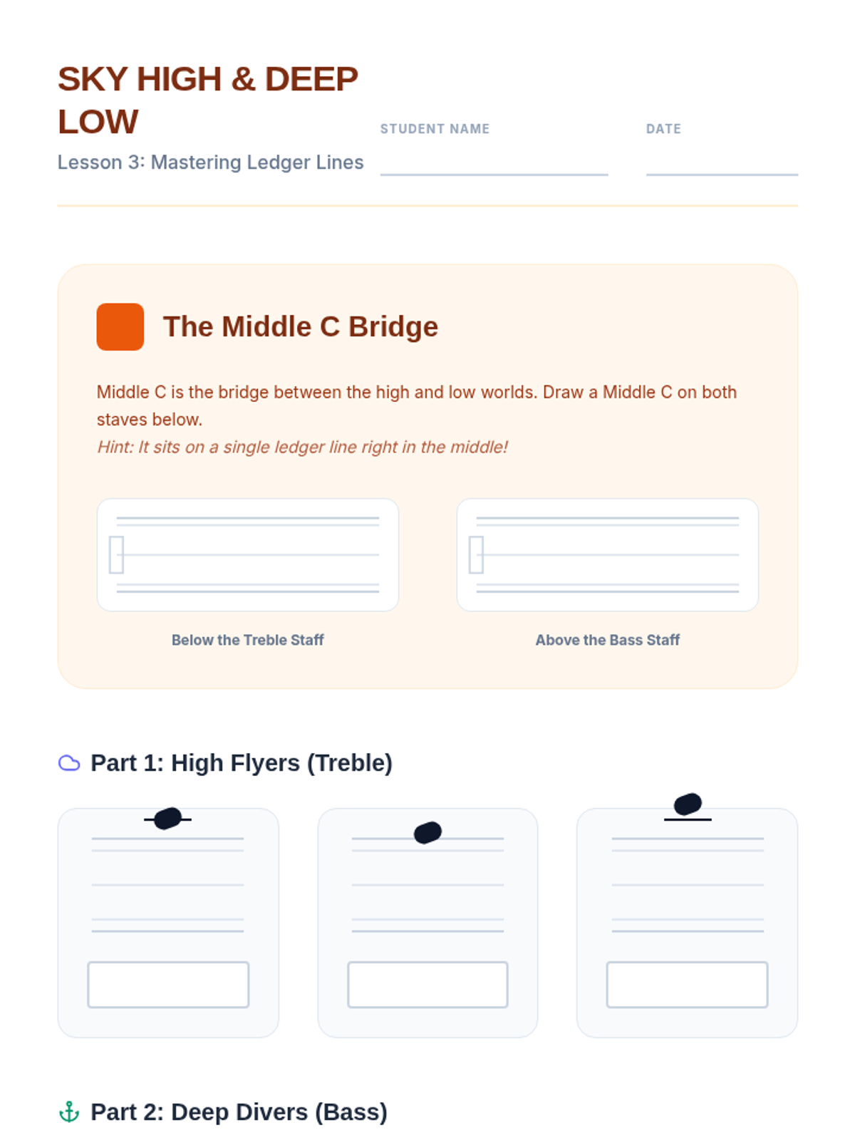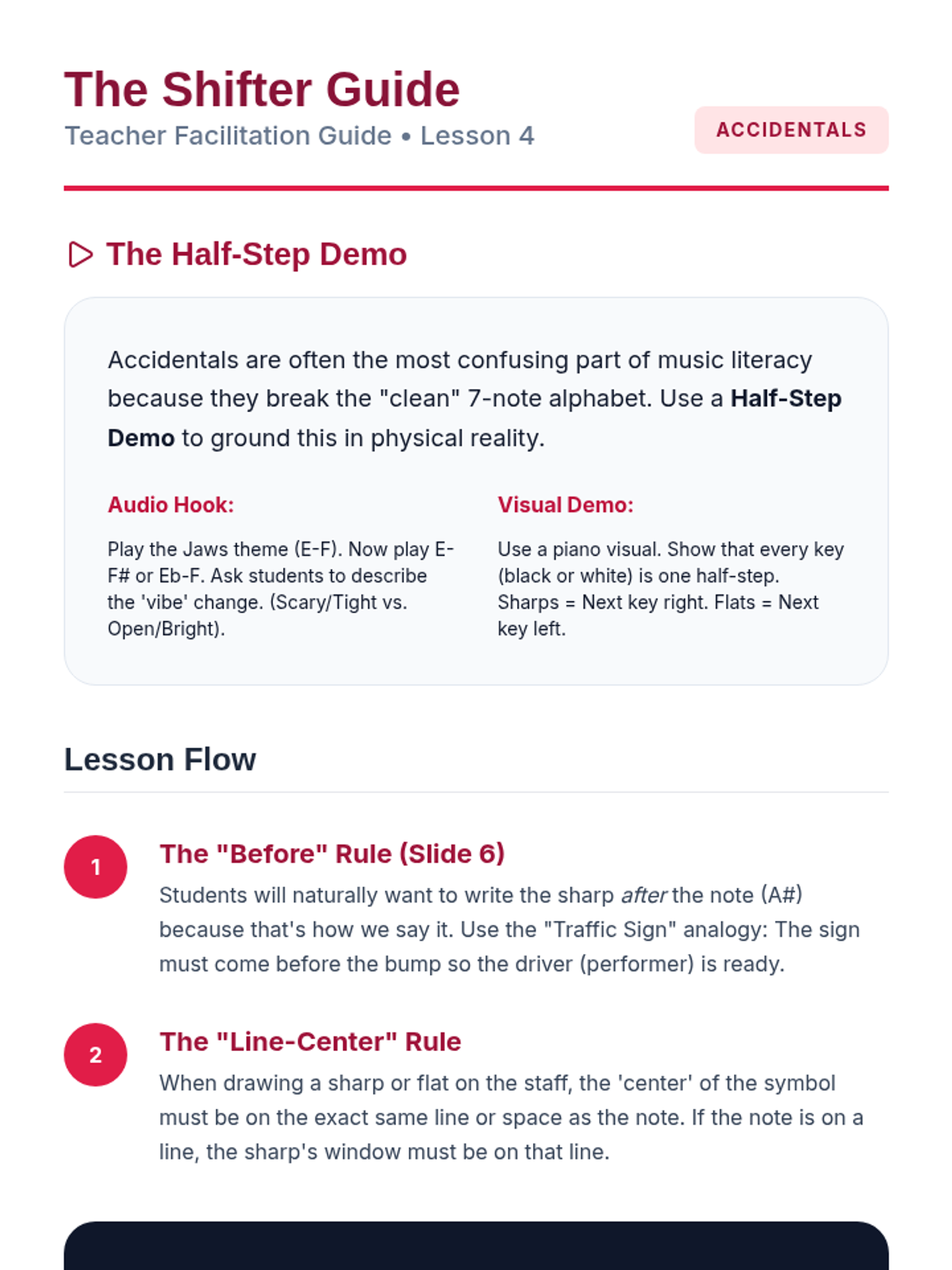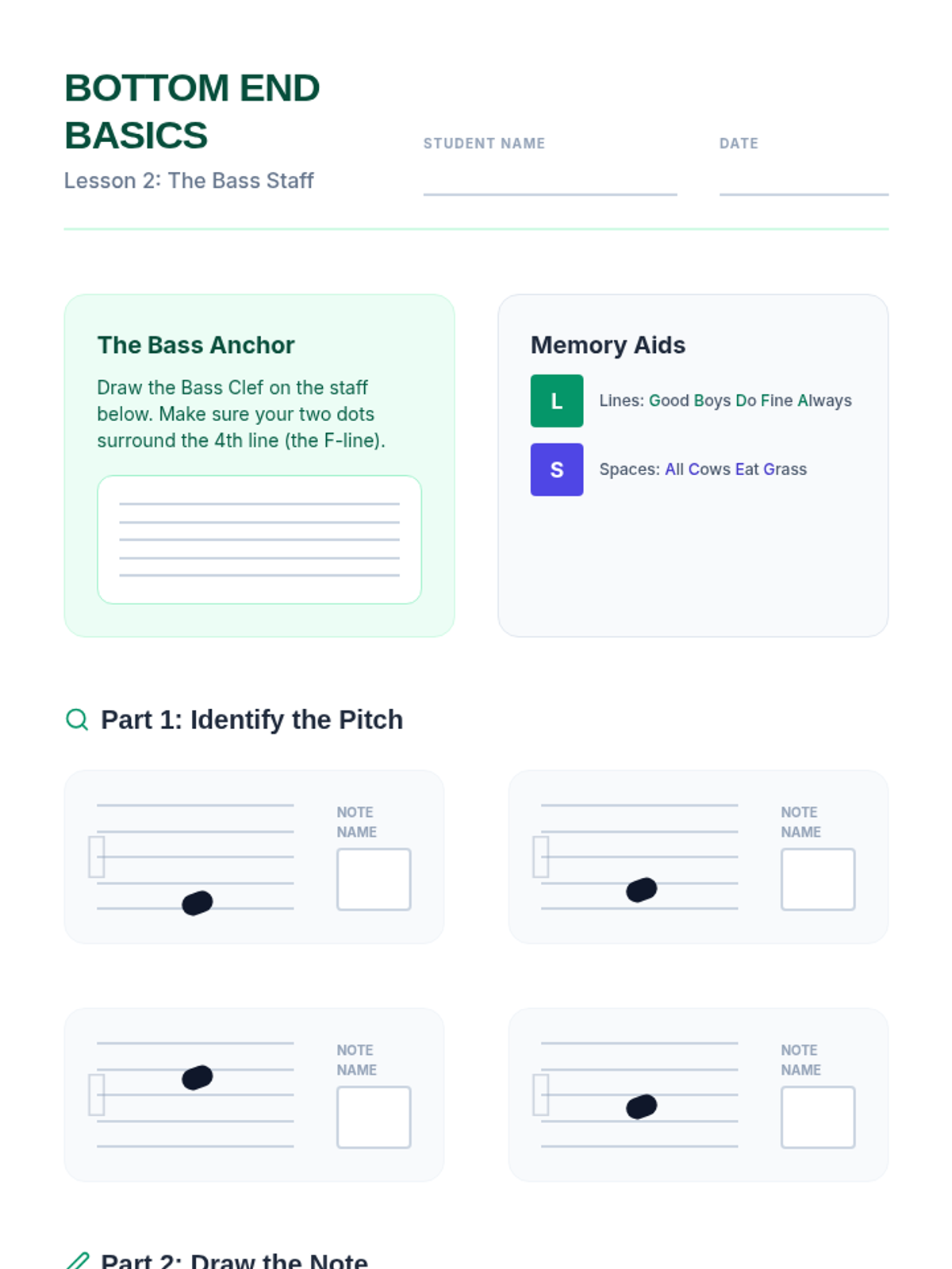 A comprehensive sequence for 6th-grade students to master the Grand Staff, covering treble and bass clefs, ledger lines, accidentals, and basic melodic transcription through a mastery-based approach.