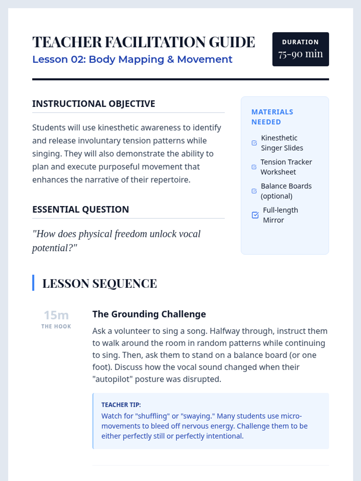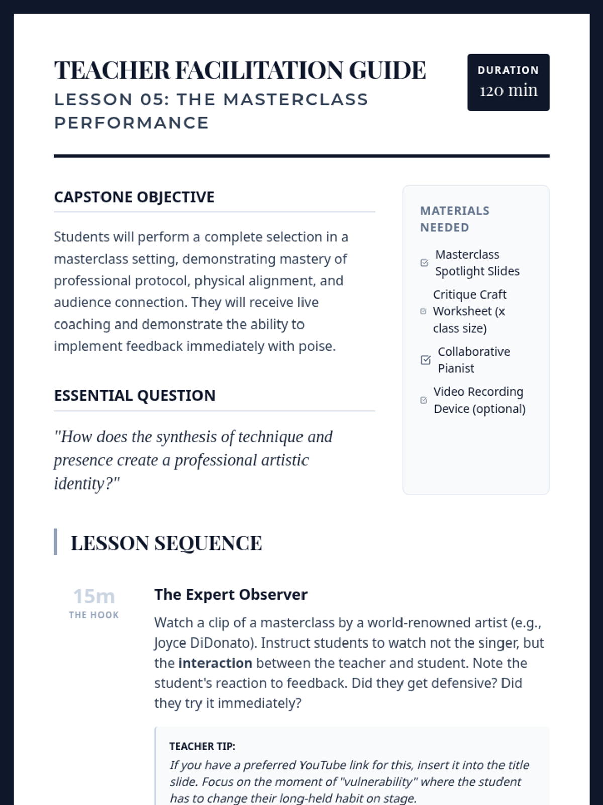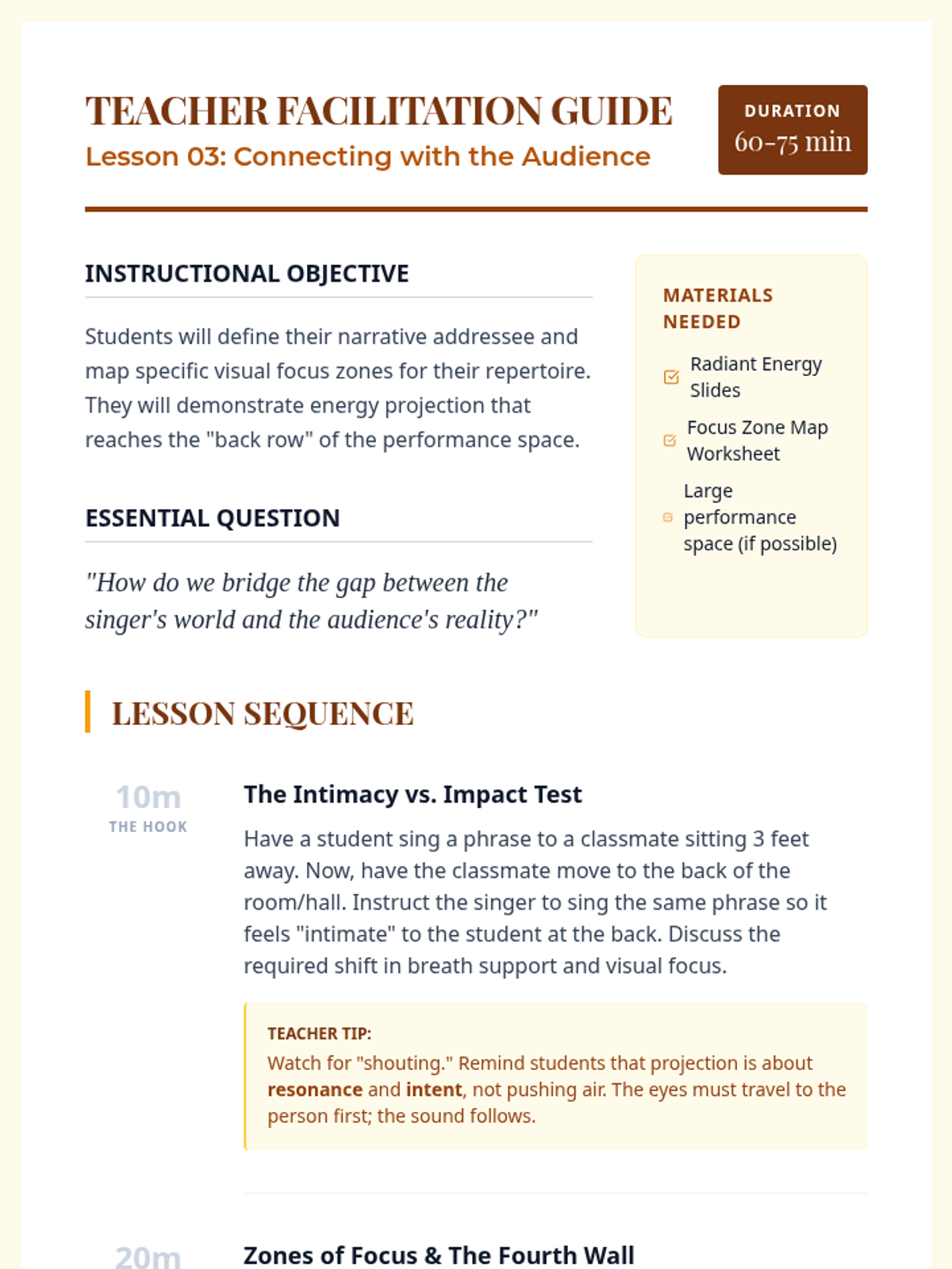 A comprehensive sequence for undergraduate vocalists focused on performance psychology, physical stage presence, audience engagement, and professional audition protocols. Students transition from managing internal anxiety to mastering the external logistics of the professional music industry.