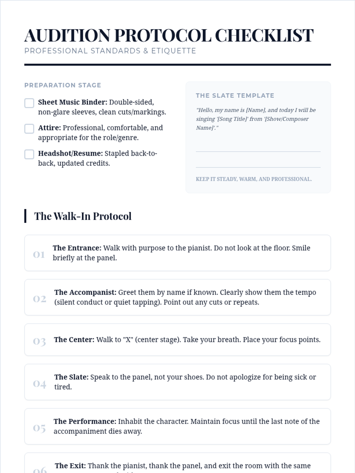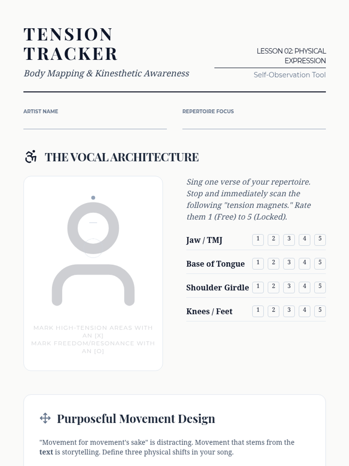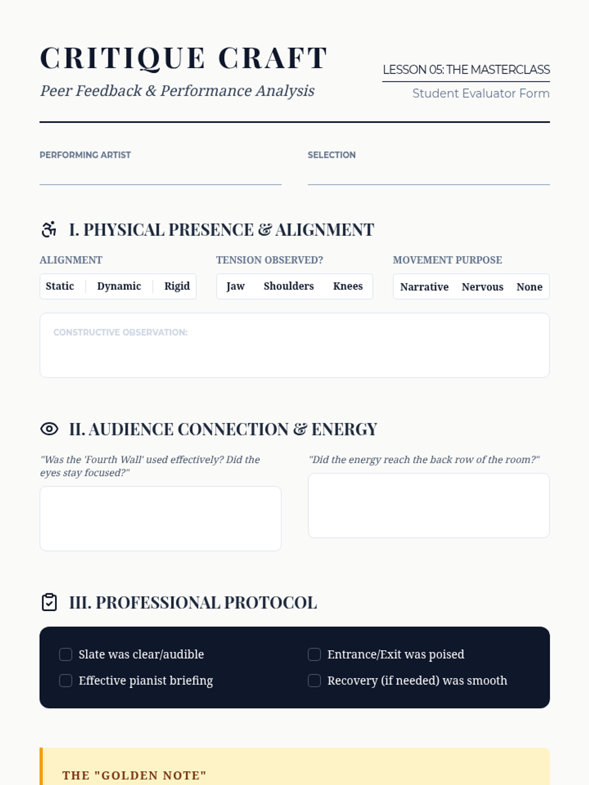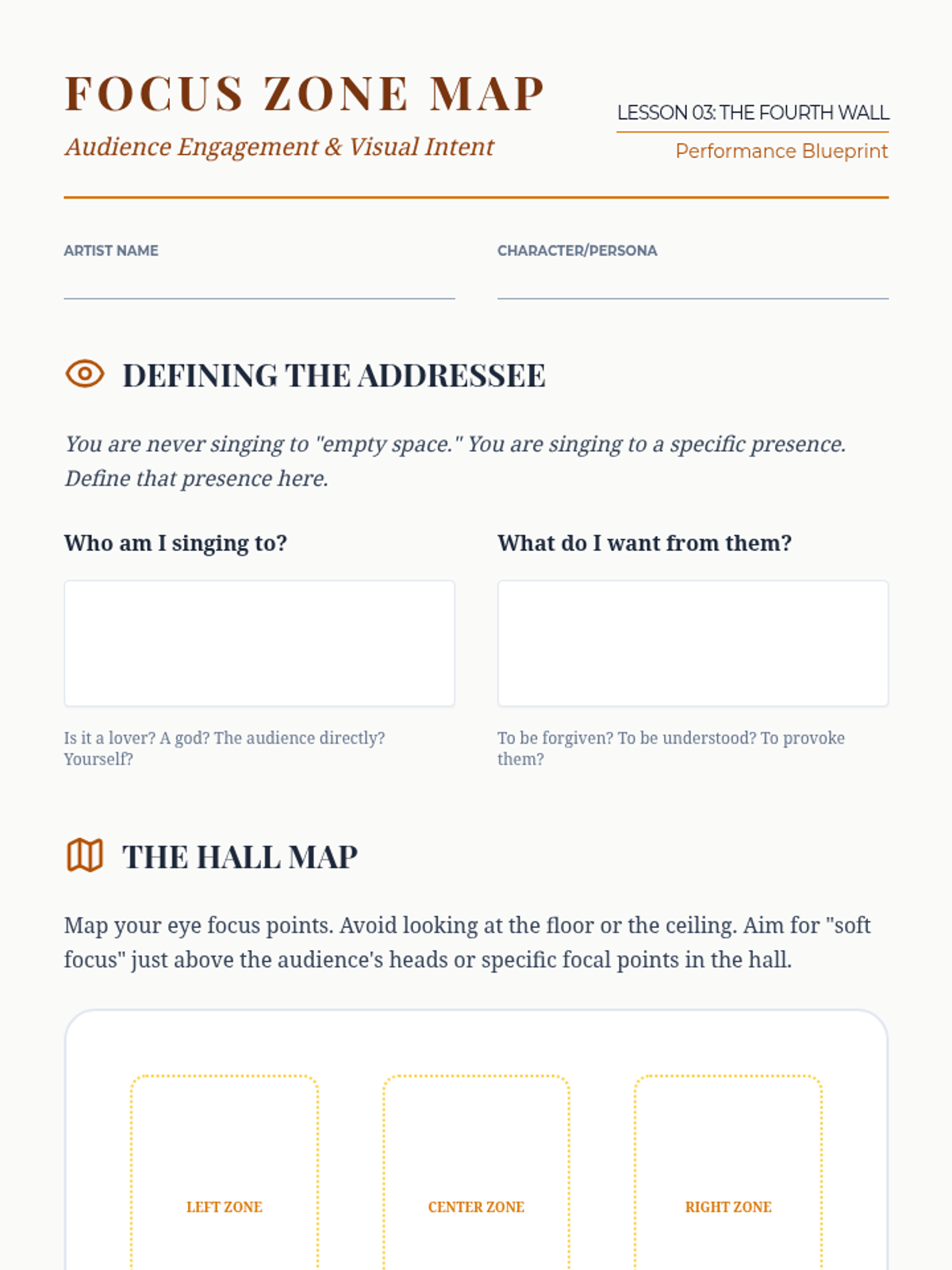 A comprehensive sequence for undergraduate vocalists focused on performance psychology, physical stage presence, audience engagement, and professional audition protocols. Students transition from managing internal anxiety to mastering the external logistics of the professional music industry.