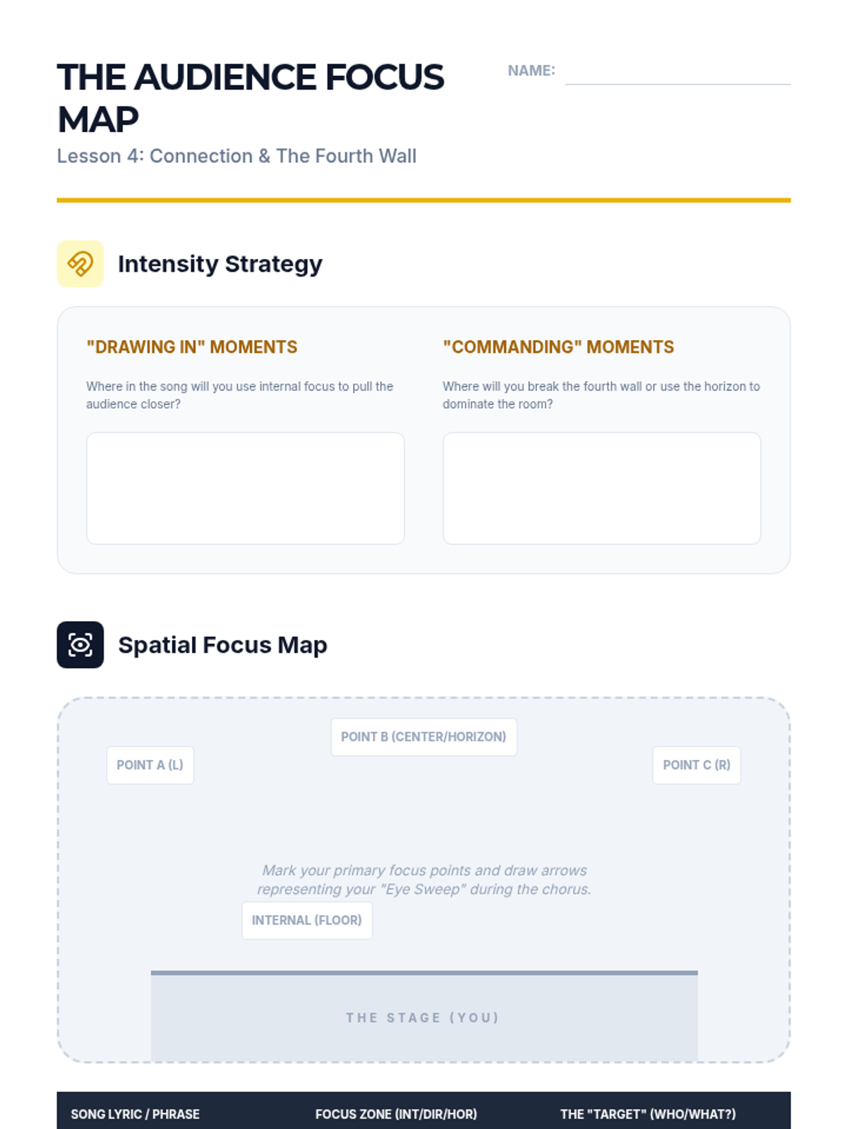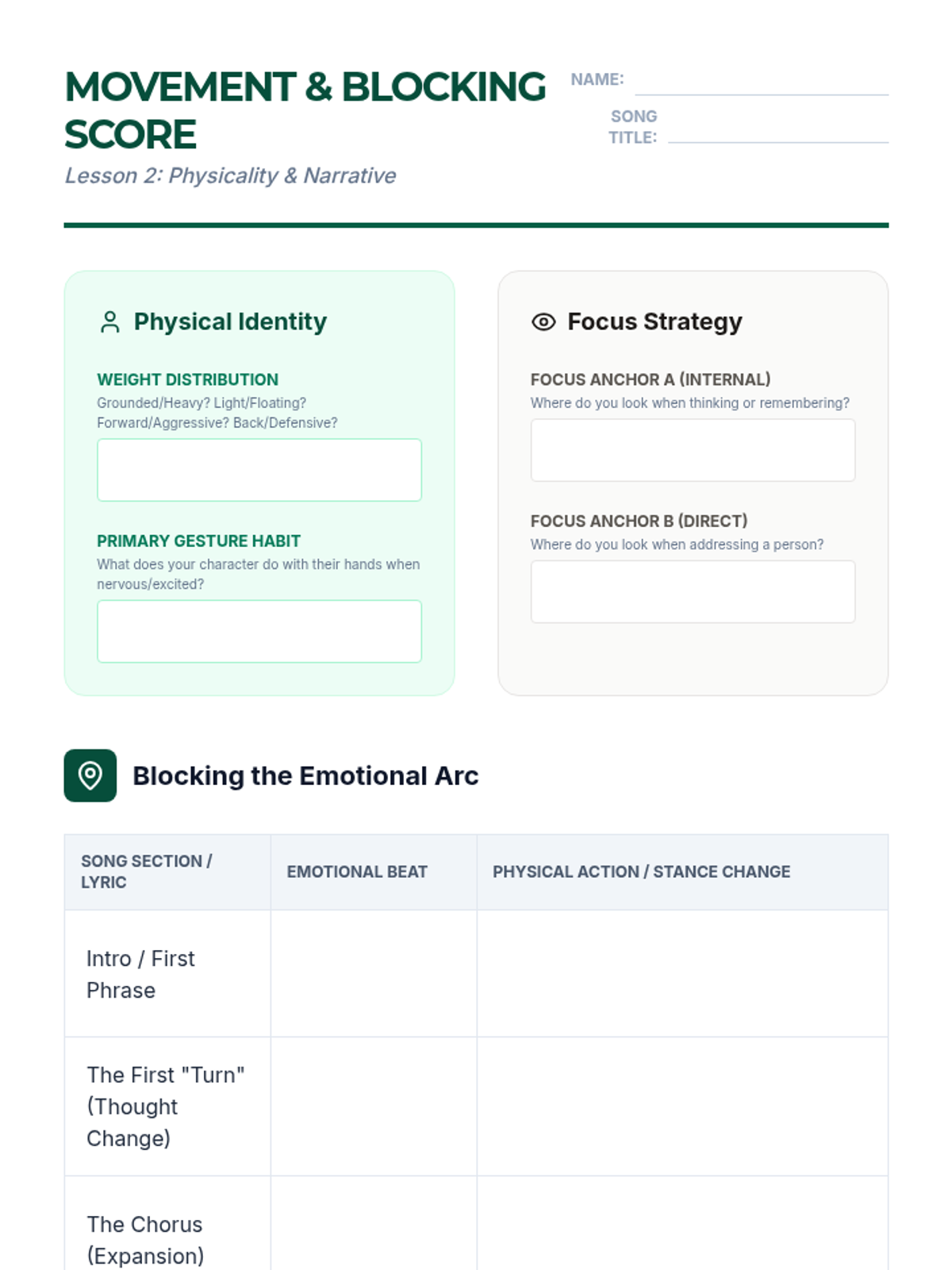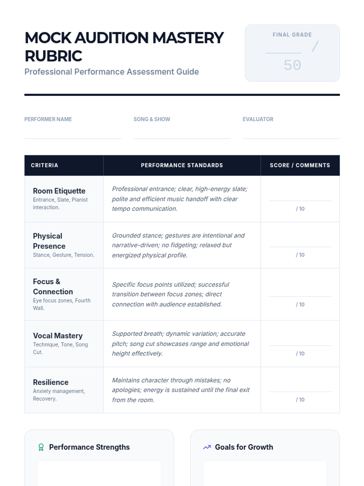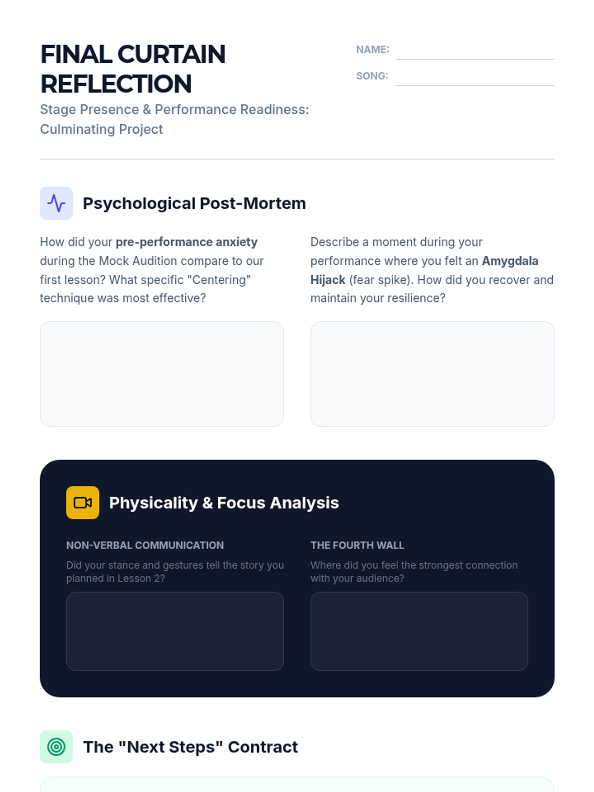 A comprehensive 11th-grade sequence focusing on the psychological and physical aspects of vocal performance. Students learn to manage stage fright, master non-verbal communication, and navigate professional audition environments.