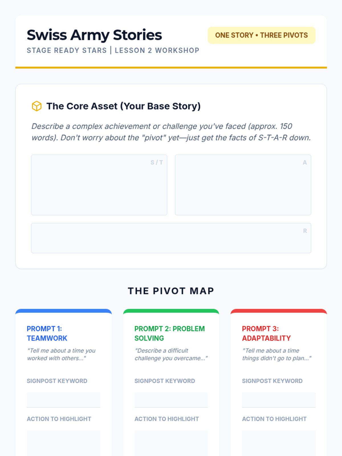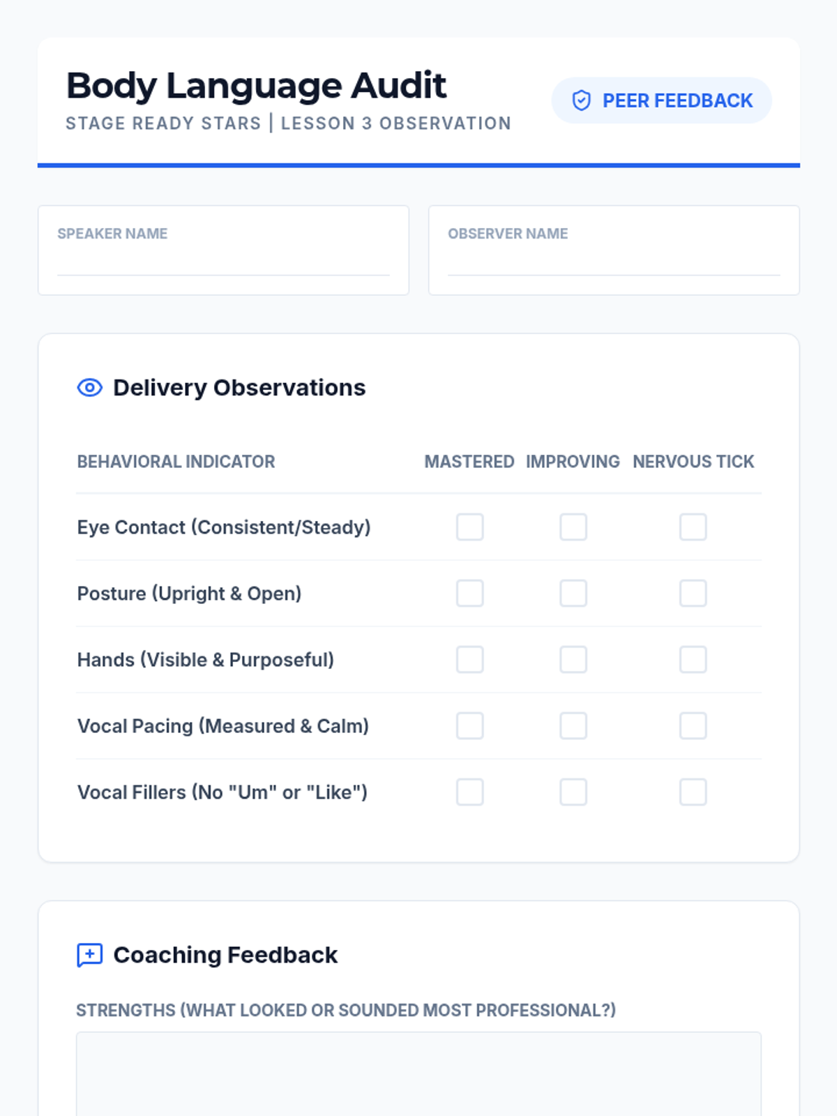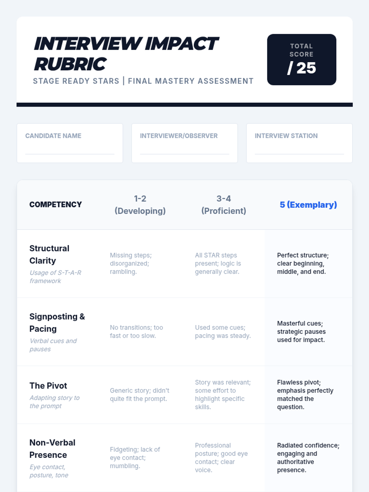A comprehensive 11th-grade sequence focused on the oral delivery, adaptability, and professional presence required for successful STAR method interview responses. Students move from basic verbal structure to high-stakes simulation and real-time adaptation.