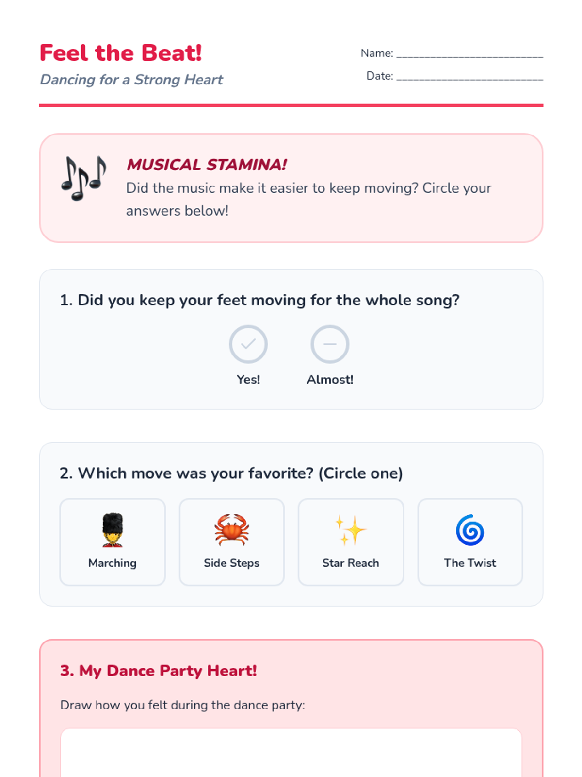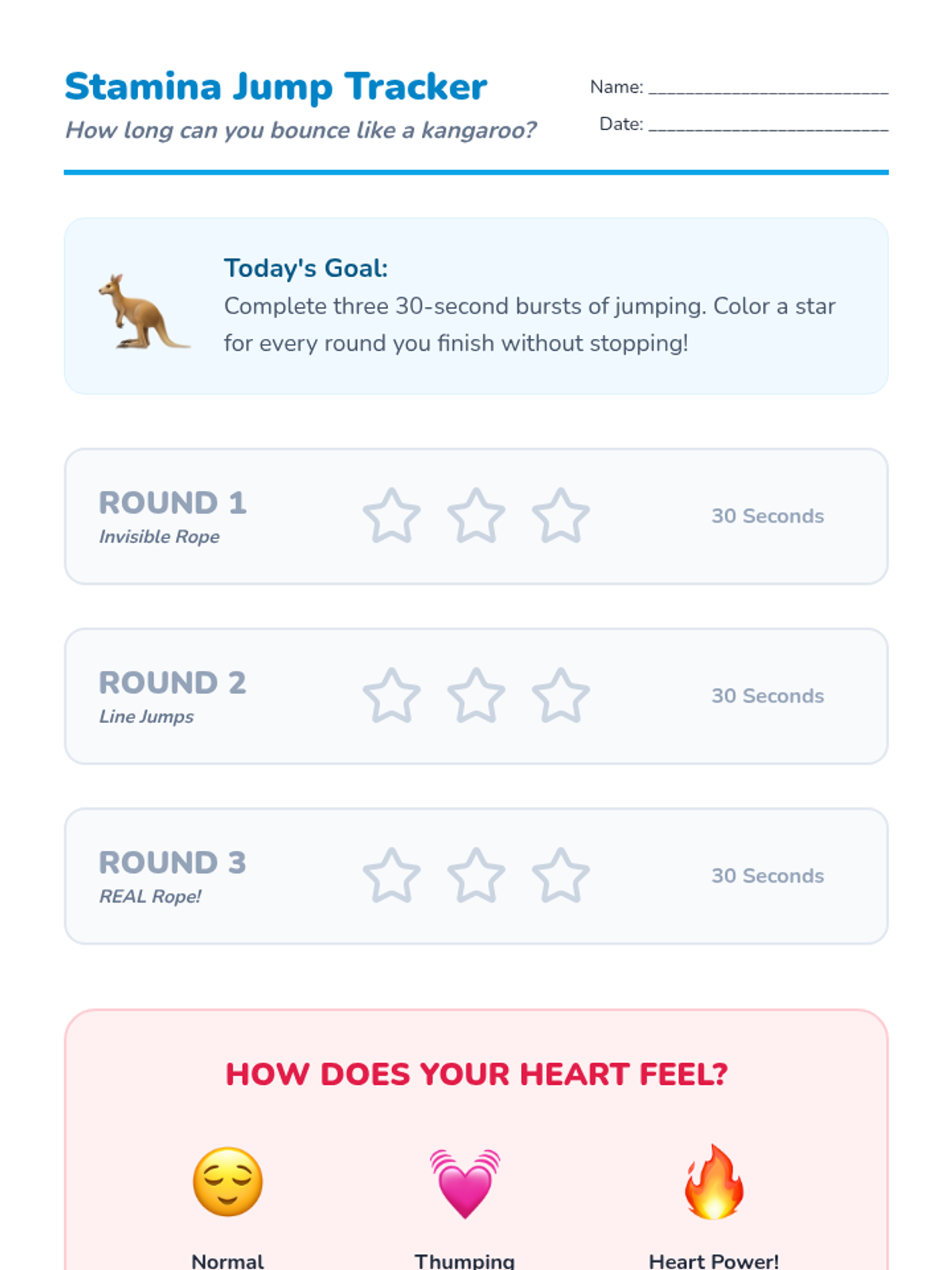 A 5-lesson sequence for 1st graders to understand heart rate changes through movement, sensory exploration, and play. Students learn to locate their heartbeat, compare resting vs. active rates, and identify exercise as a way to make their 'heart engine' stronger.