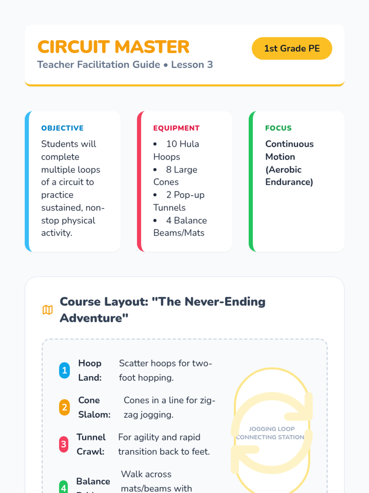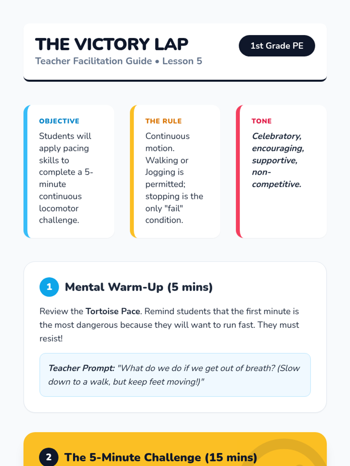 This sequence introduces 1st Grade students to cardiovascular fitness and the concept of pacing. Students learn to sustain movement through jogging, jumping rope, obstacle courses, and aerobic dance, culminating in a five-minute endurance challenge.