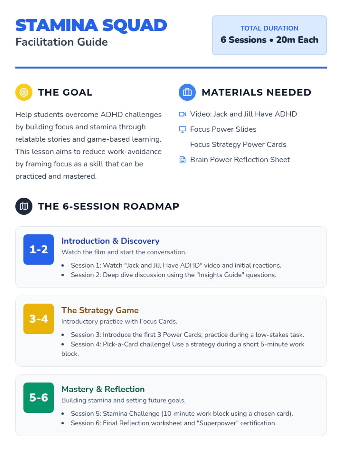 A series of 6 targeted sessions focused on building focus and stamina for students with diverse learning needs, using the 'Jack and Jill' story as a central anchor.