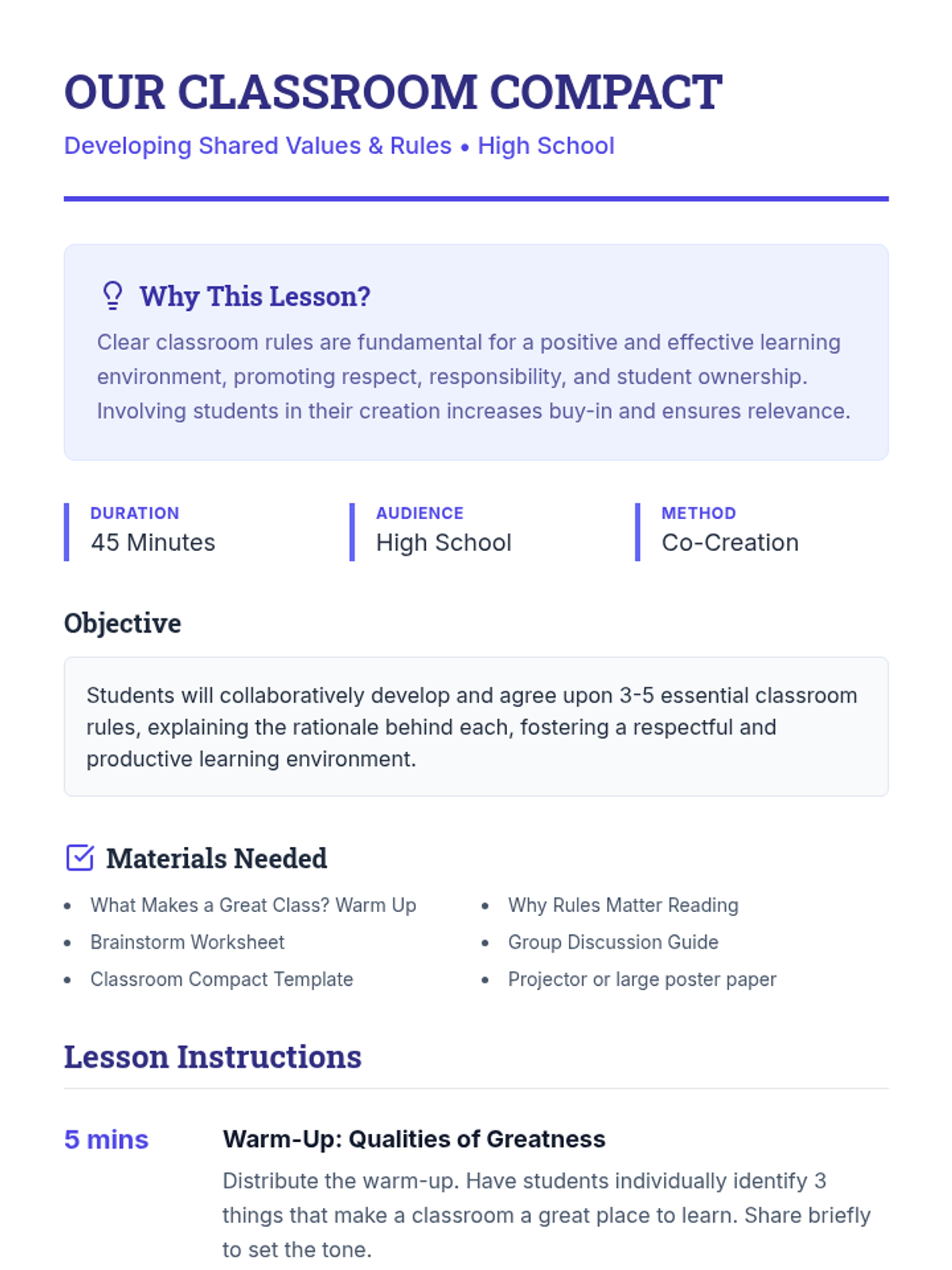 A comprehensive 3-part sequence for middle and high school students focused on bullying prevention, collaborative classroom management, and emotional literacy. Students will develop empathy, establish shared values, and learn to identify and express their emotions effectively.
