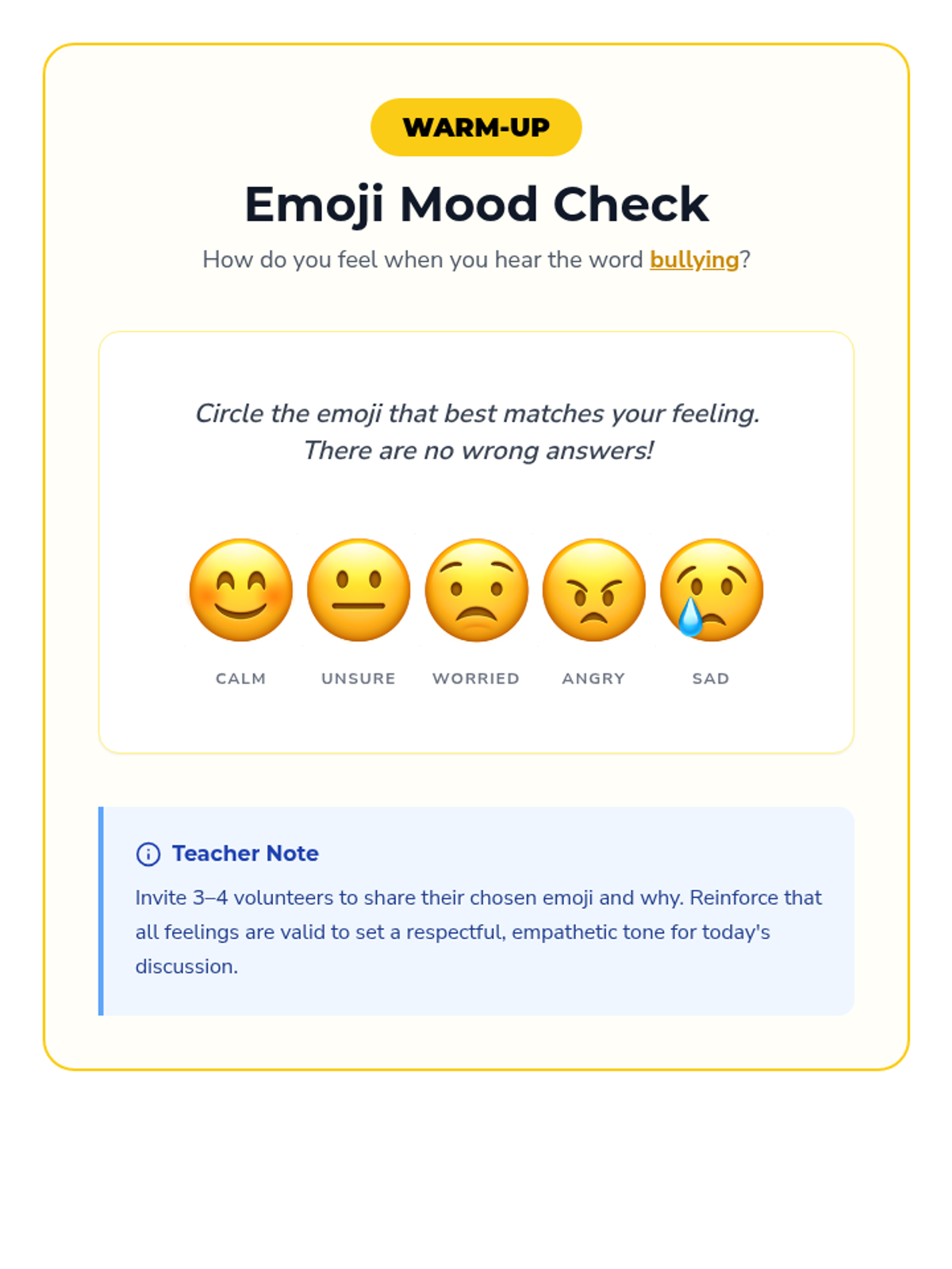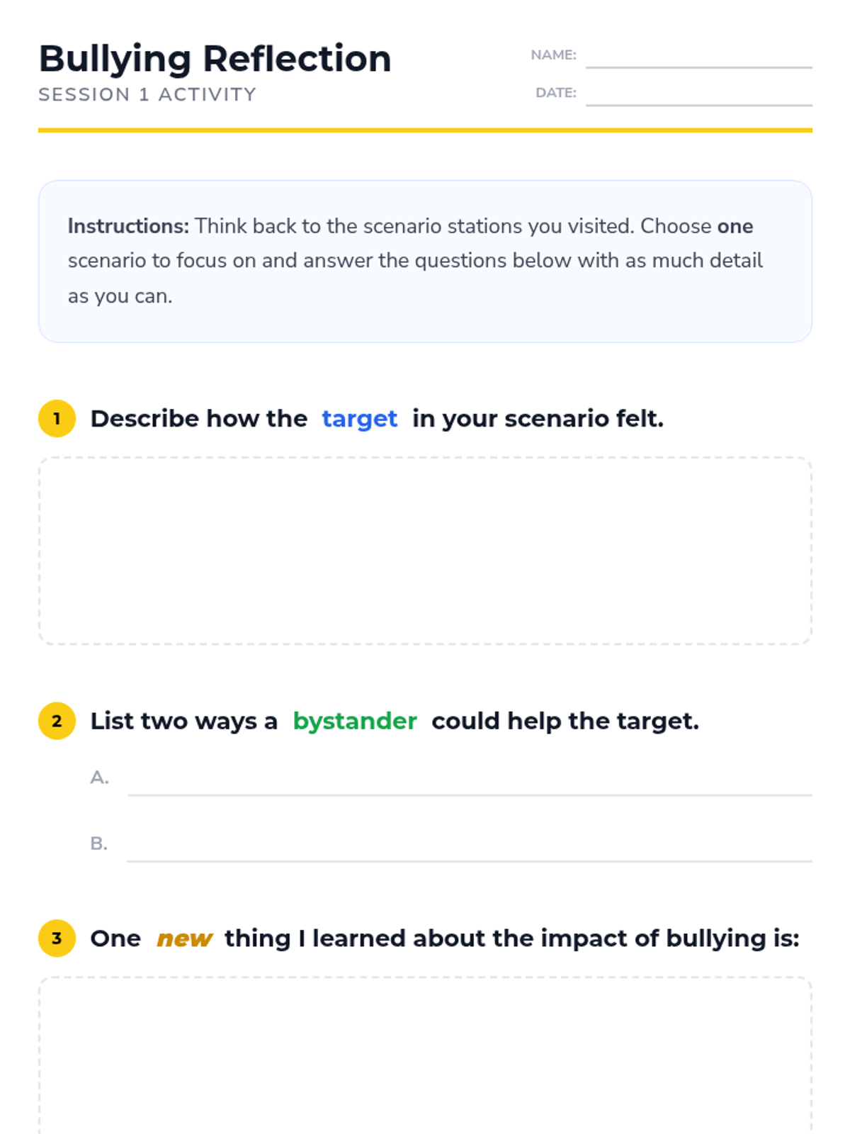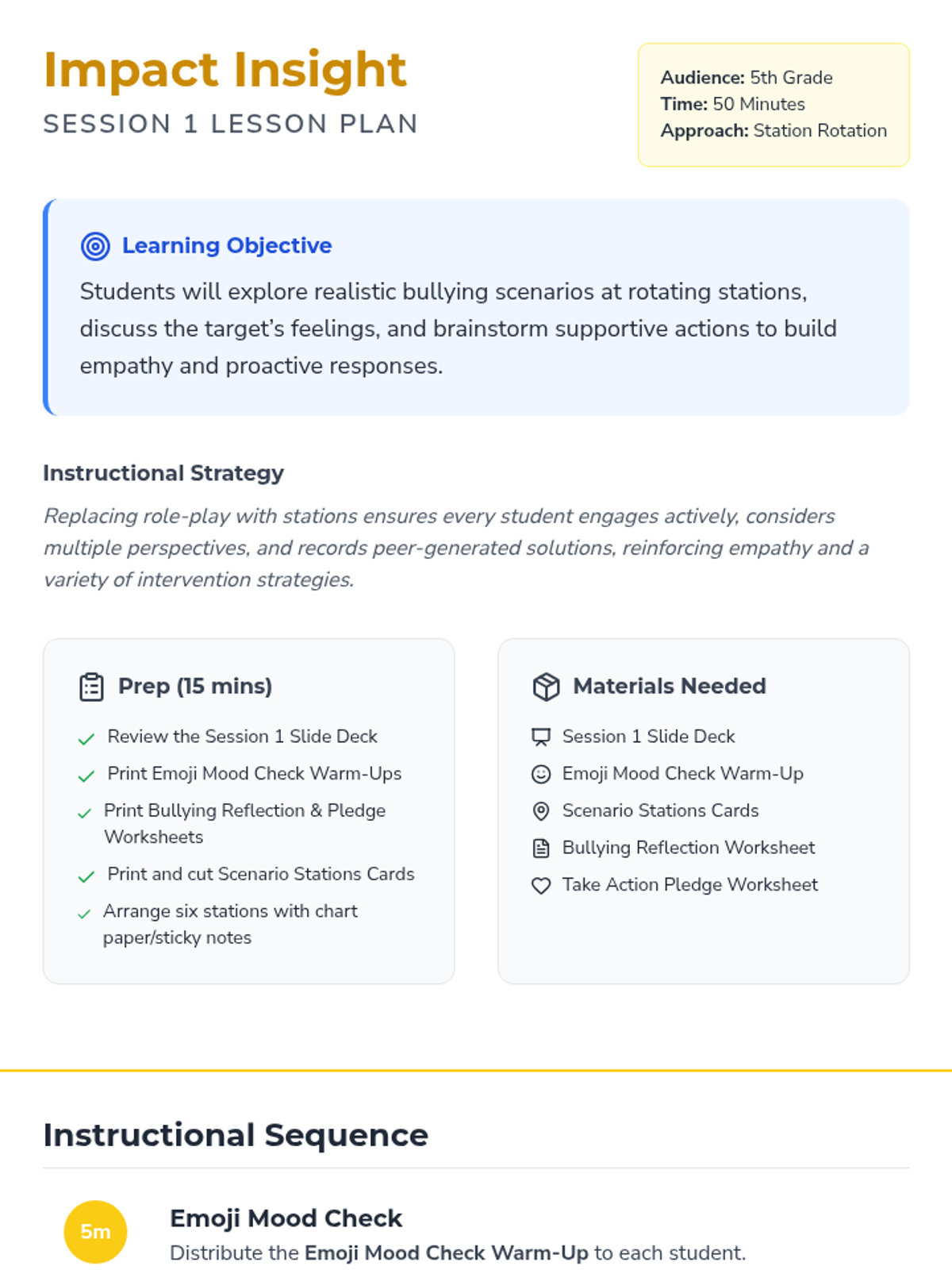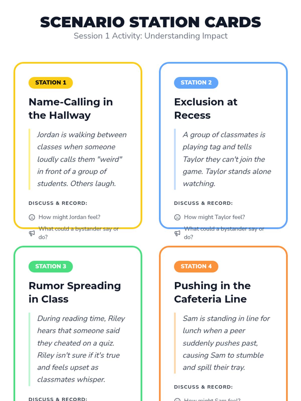 A 2-session sequence for 5th graders designed to build empathy, define bullying types, and empower students with safe intervention strategies. through rotating stations, relay games, and role-plays, students move from understanding impact to taking proactive action.