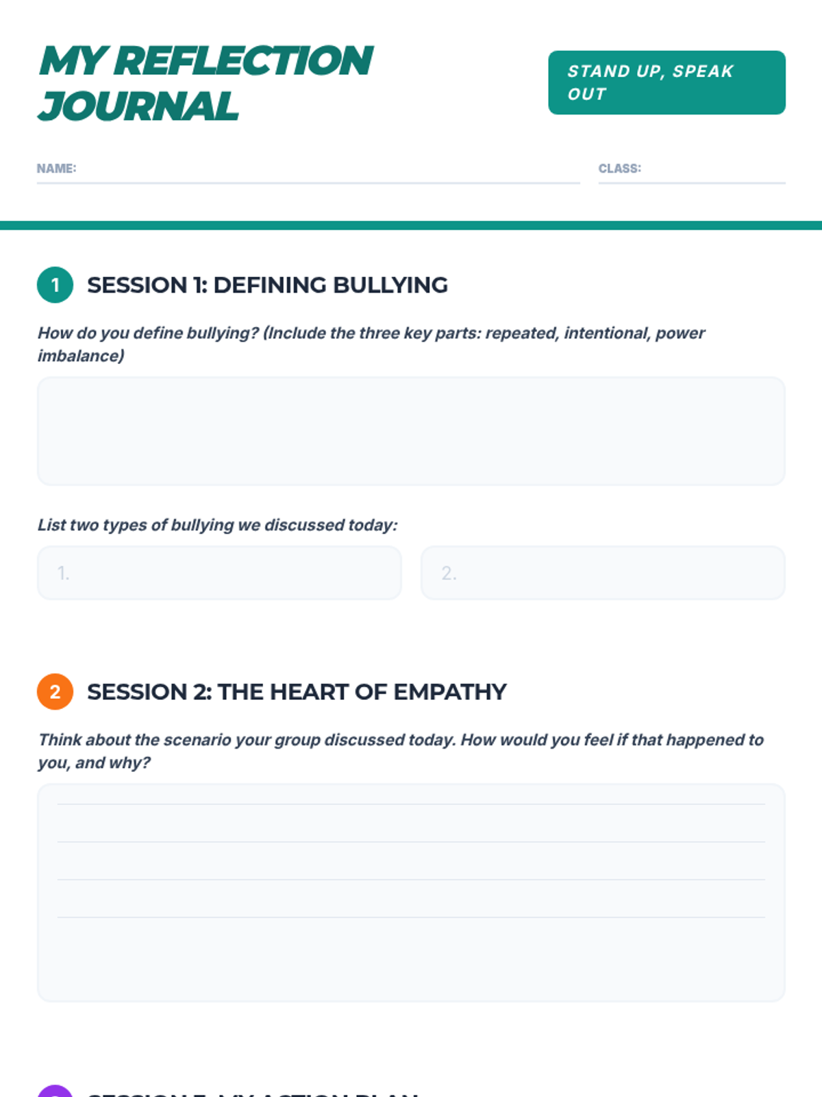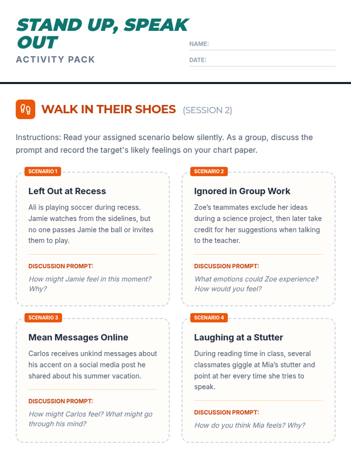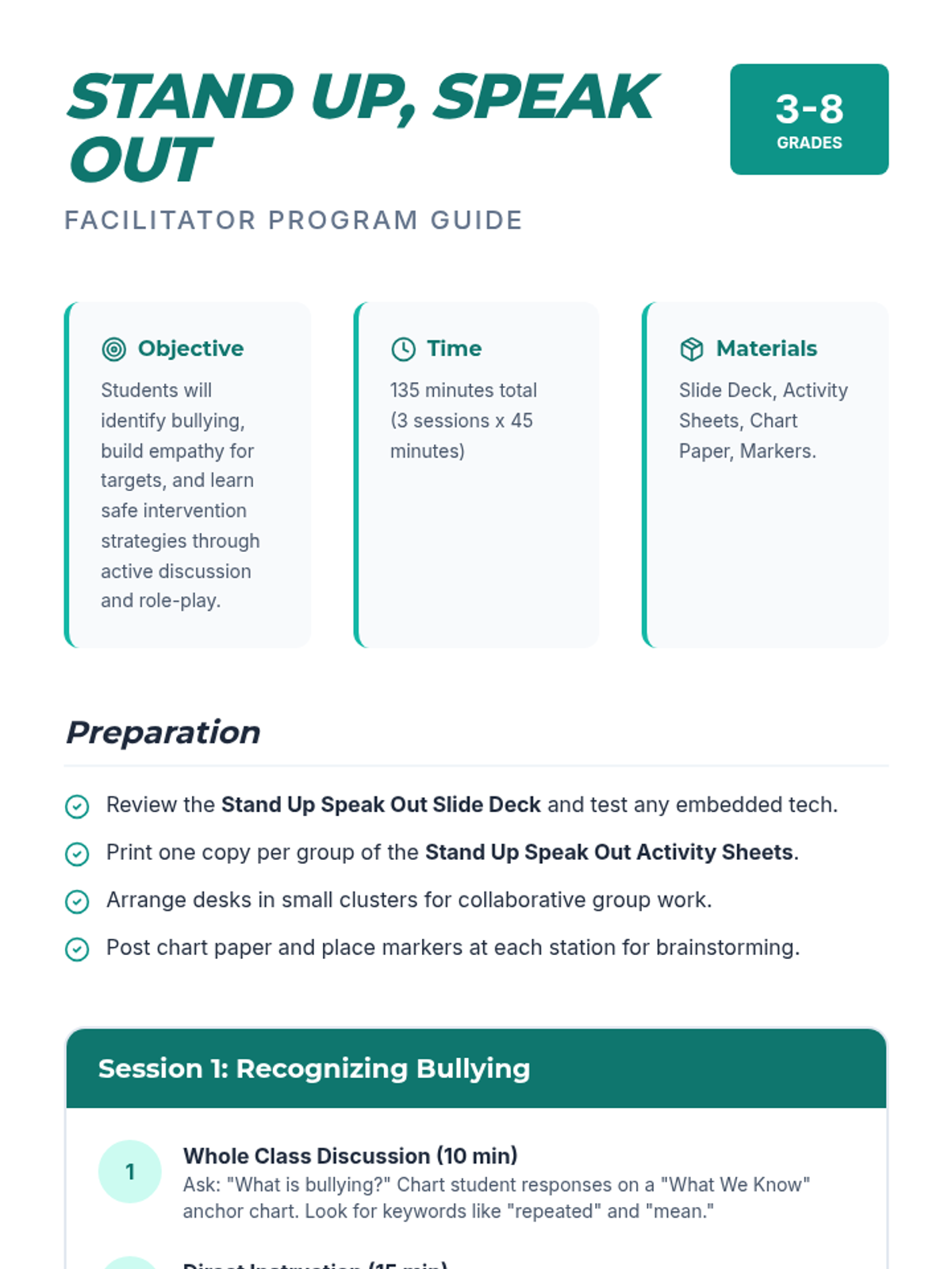 A comprehensive 3-session bullying prevention program for grades 3-8 that focuses on identifying bullying behaviors, fostering empathy, and practicing safe intervention strategies.