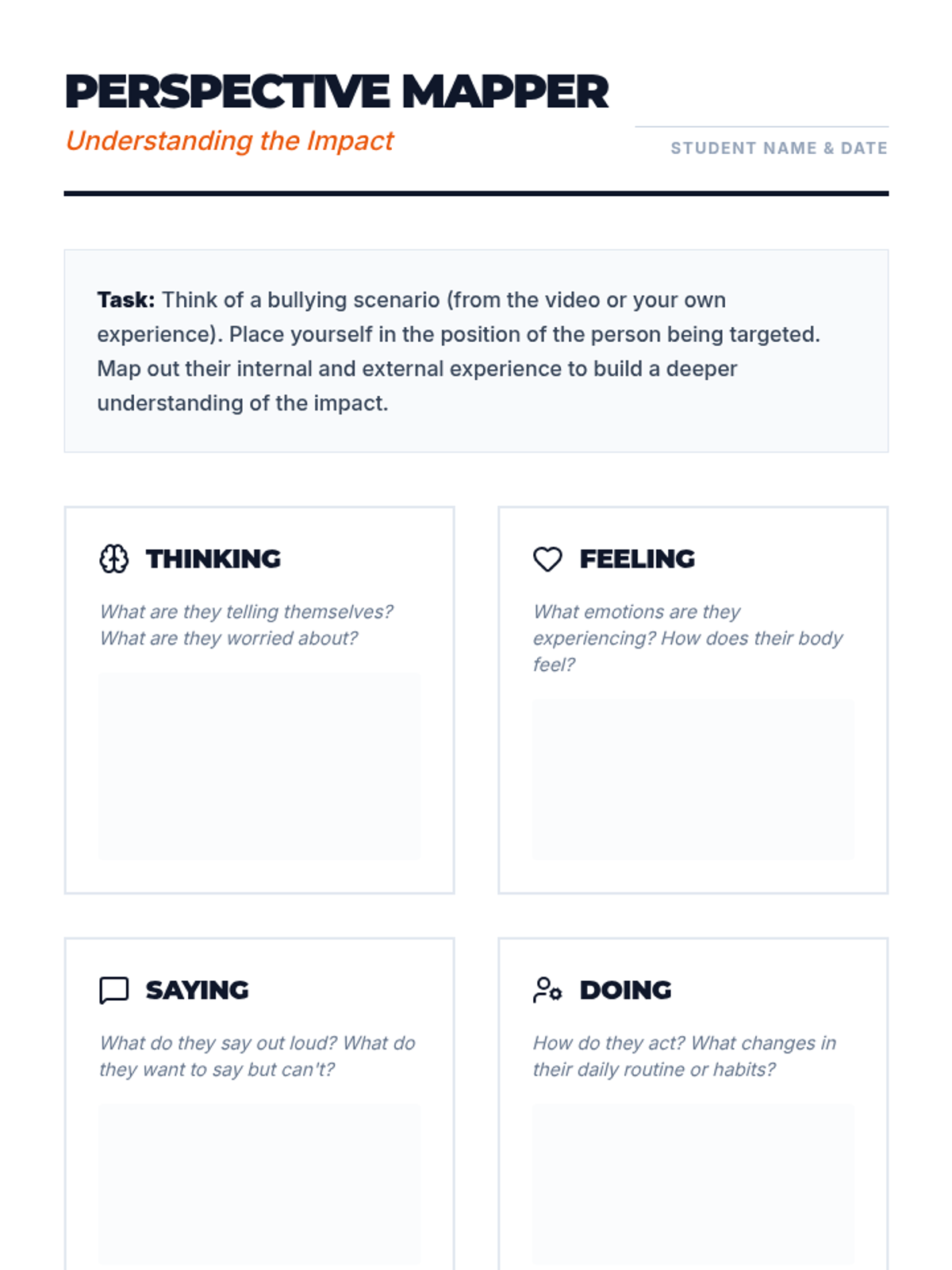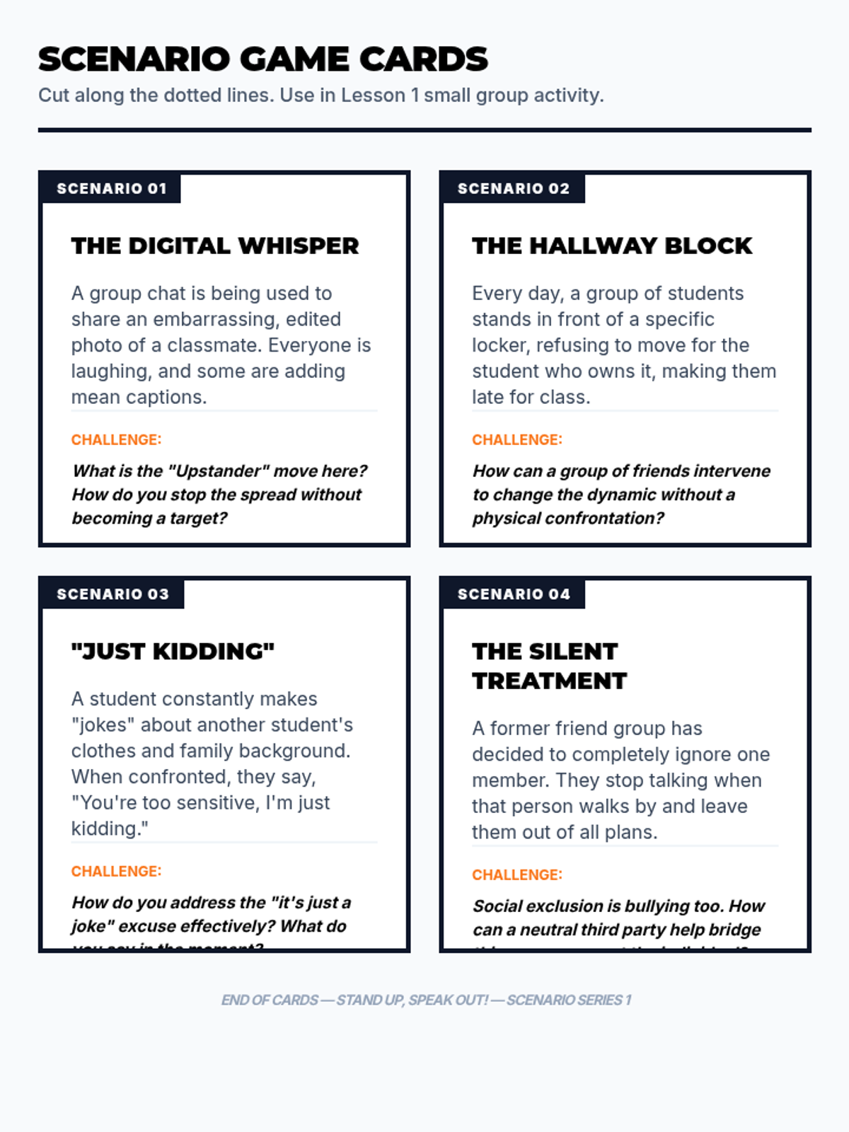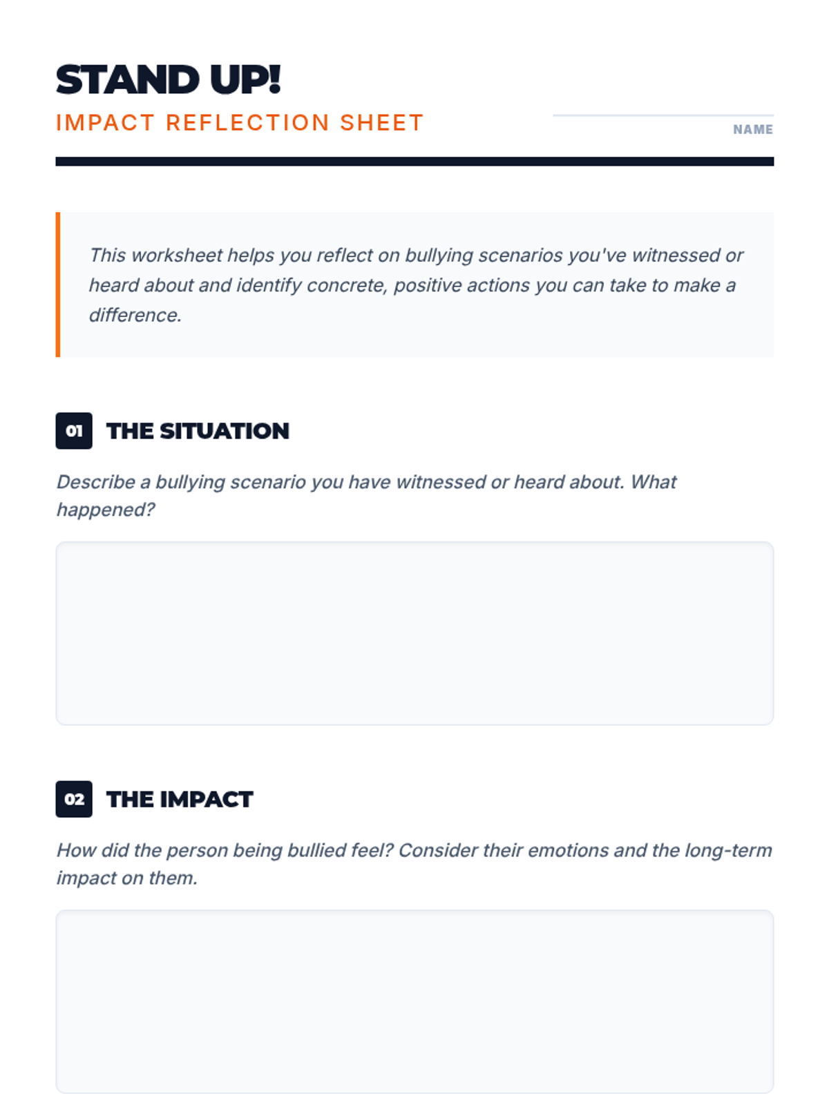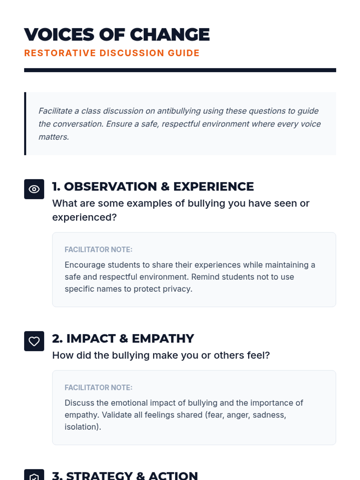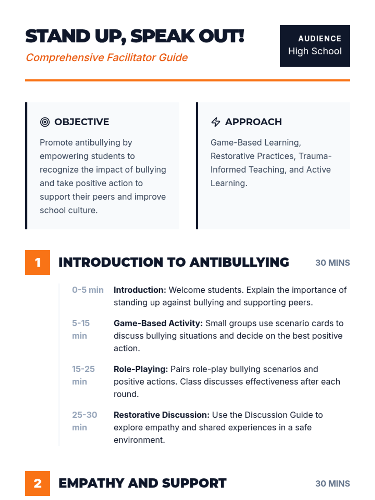 A three-part high school program designed to empower students to recognize, address, and prevent bullying through restorative practices and active participation.