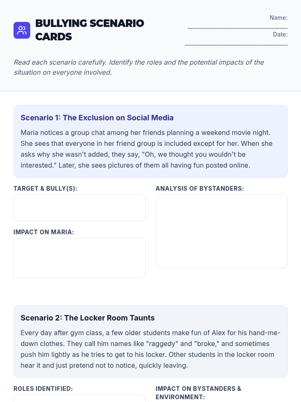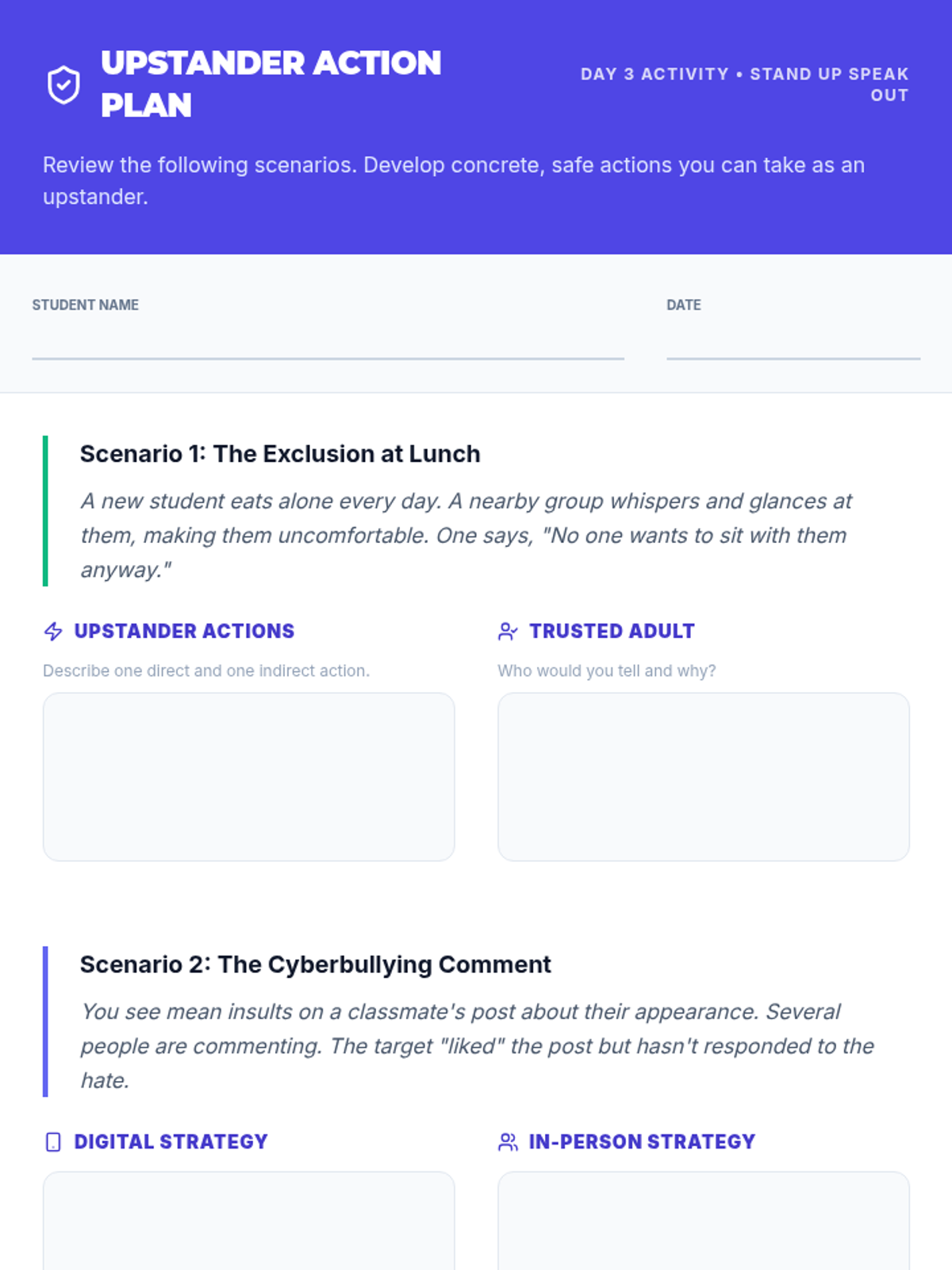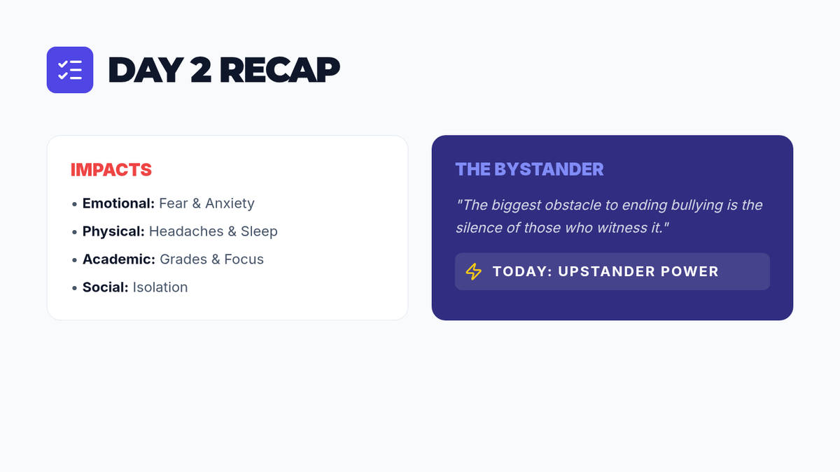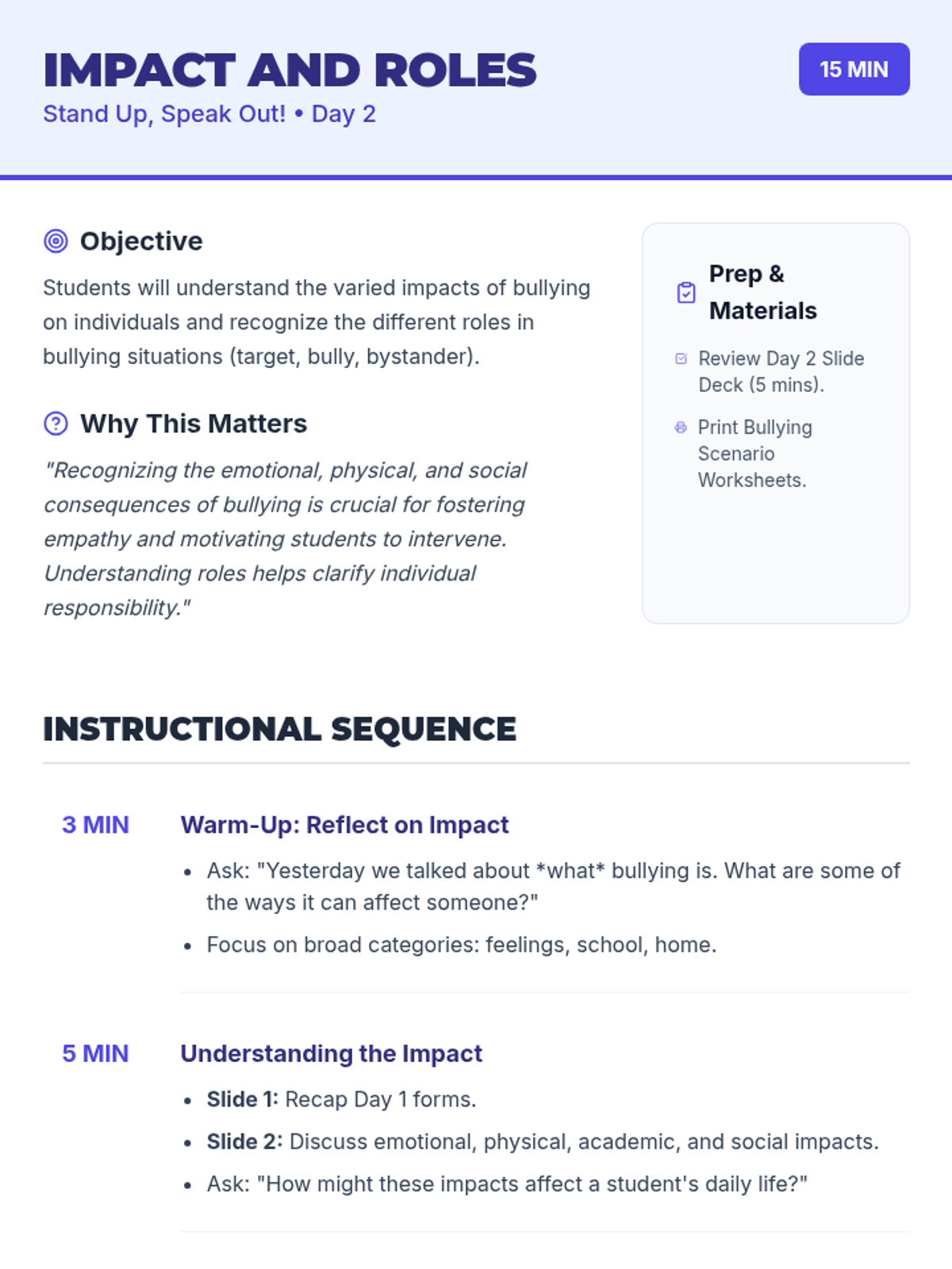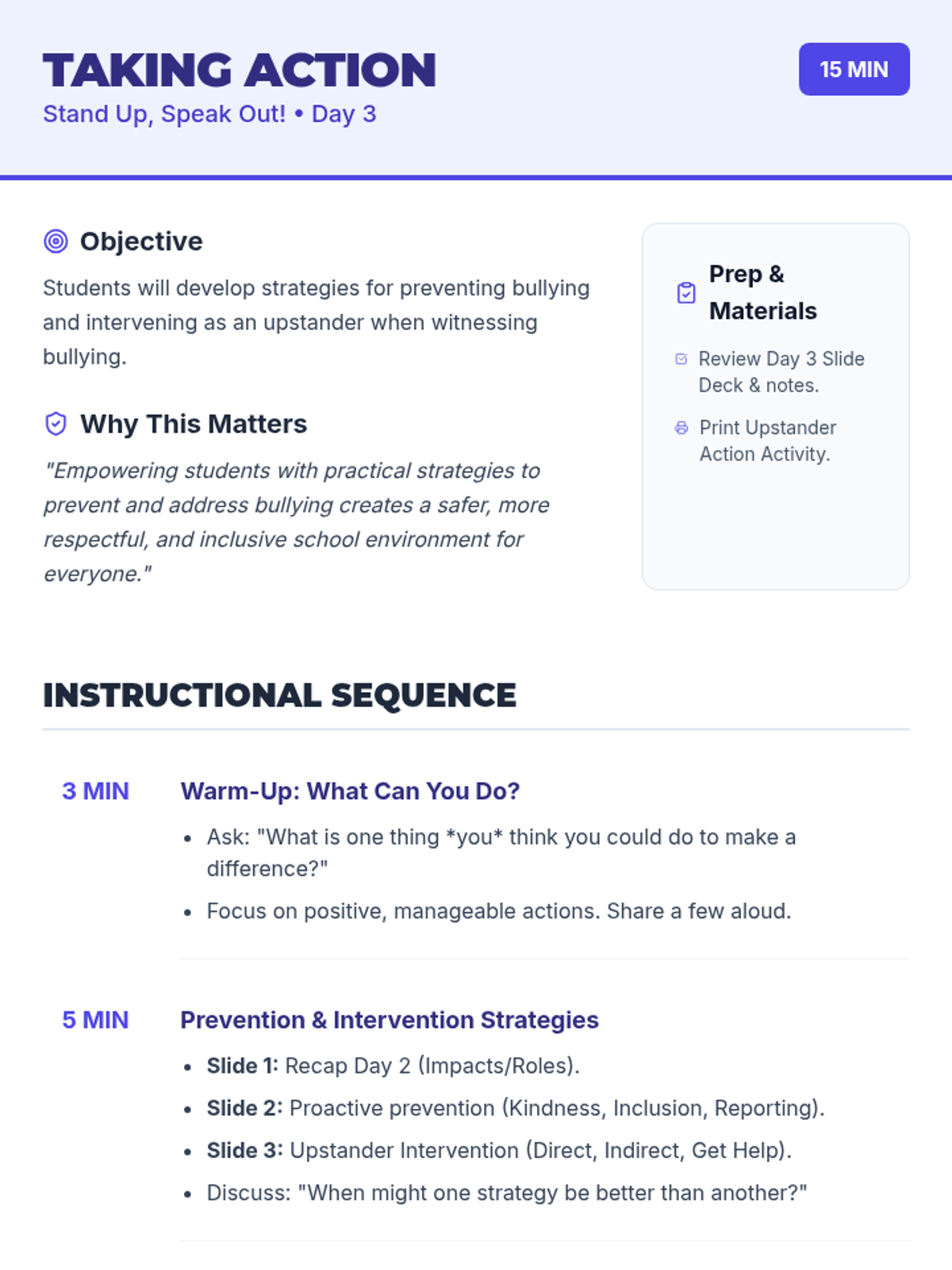A 3-day sequence for 9th-grade students to identify bullying, understand its impact, and develop intervention strategies for National Bullying Prevention Month.