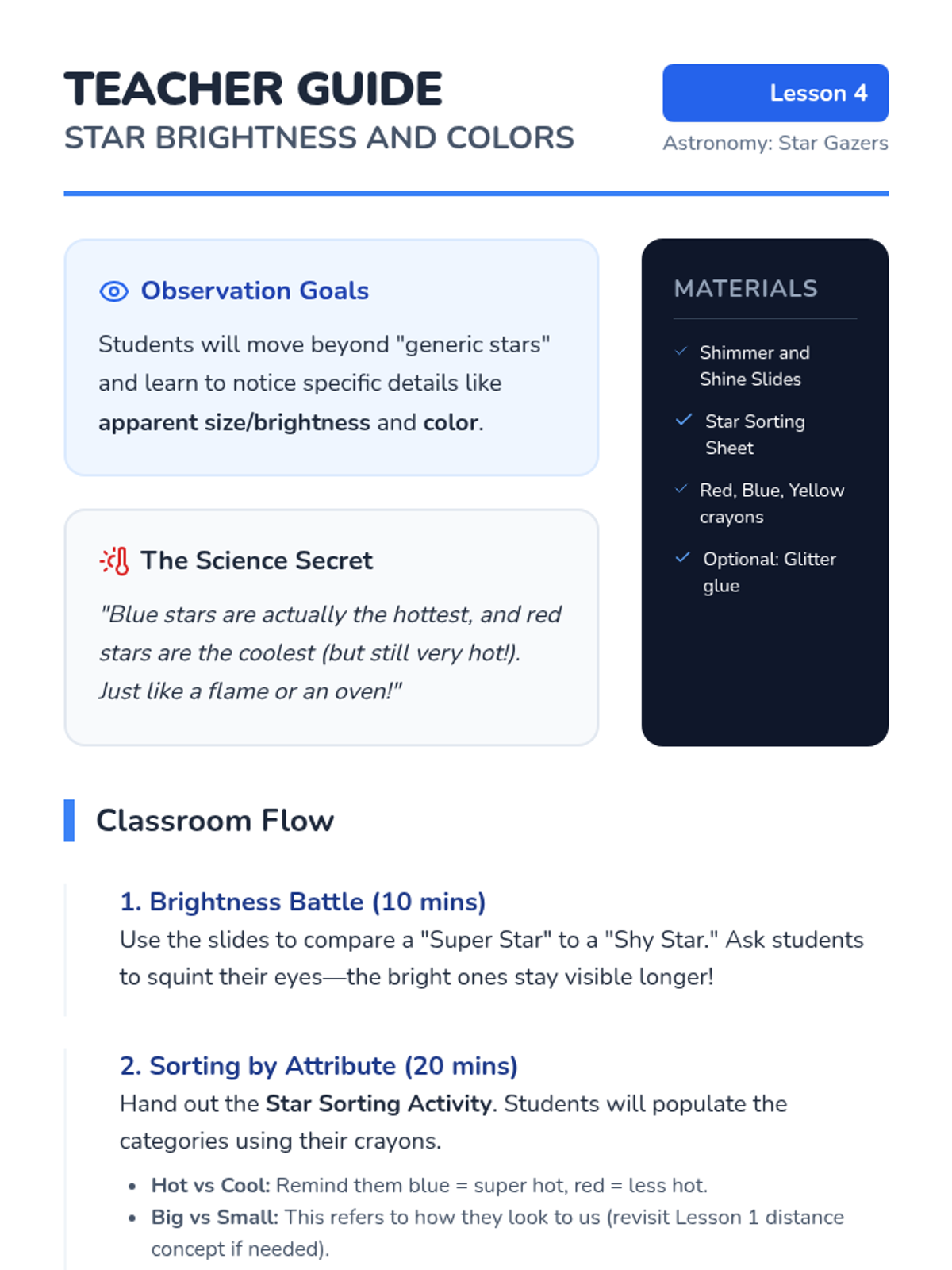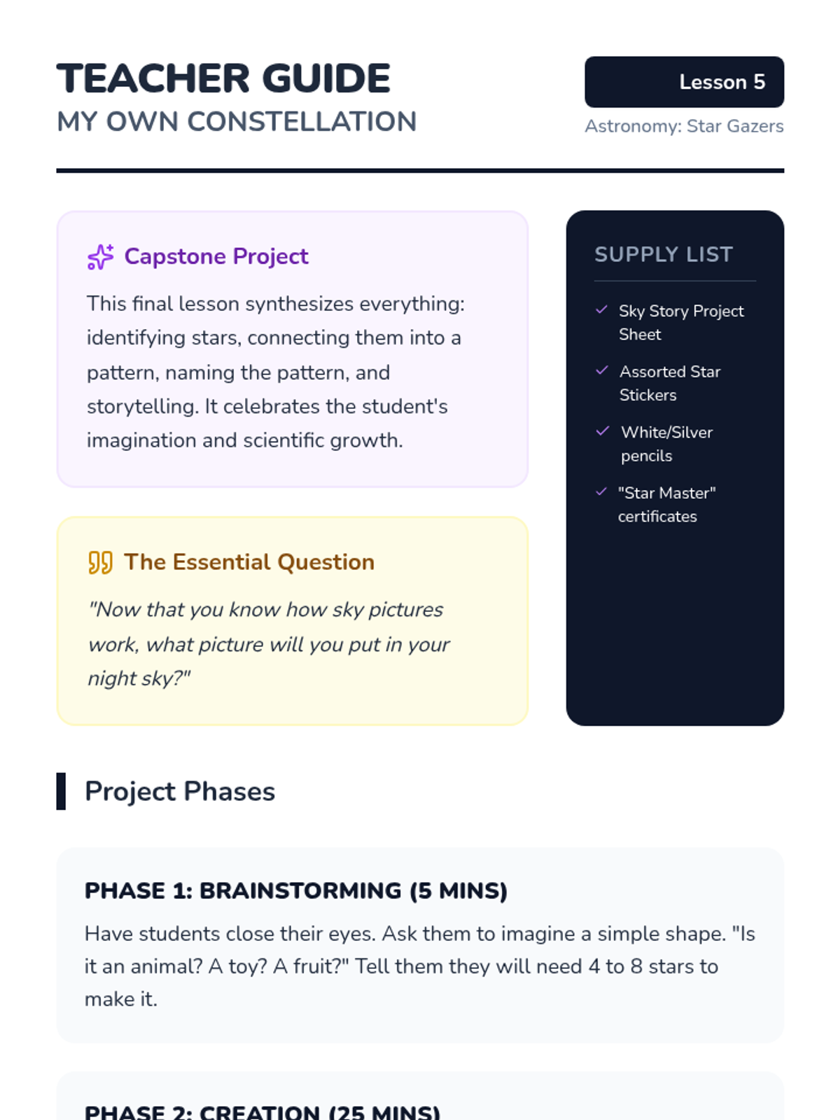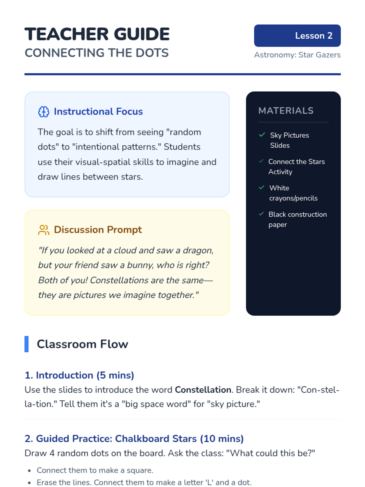 This sequence introduces Kindergarten students to stars and constellations, exploring why stars look small, how to connect them into patterns, and the diversity of their brightness and color.