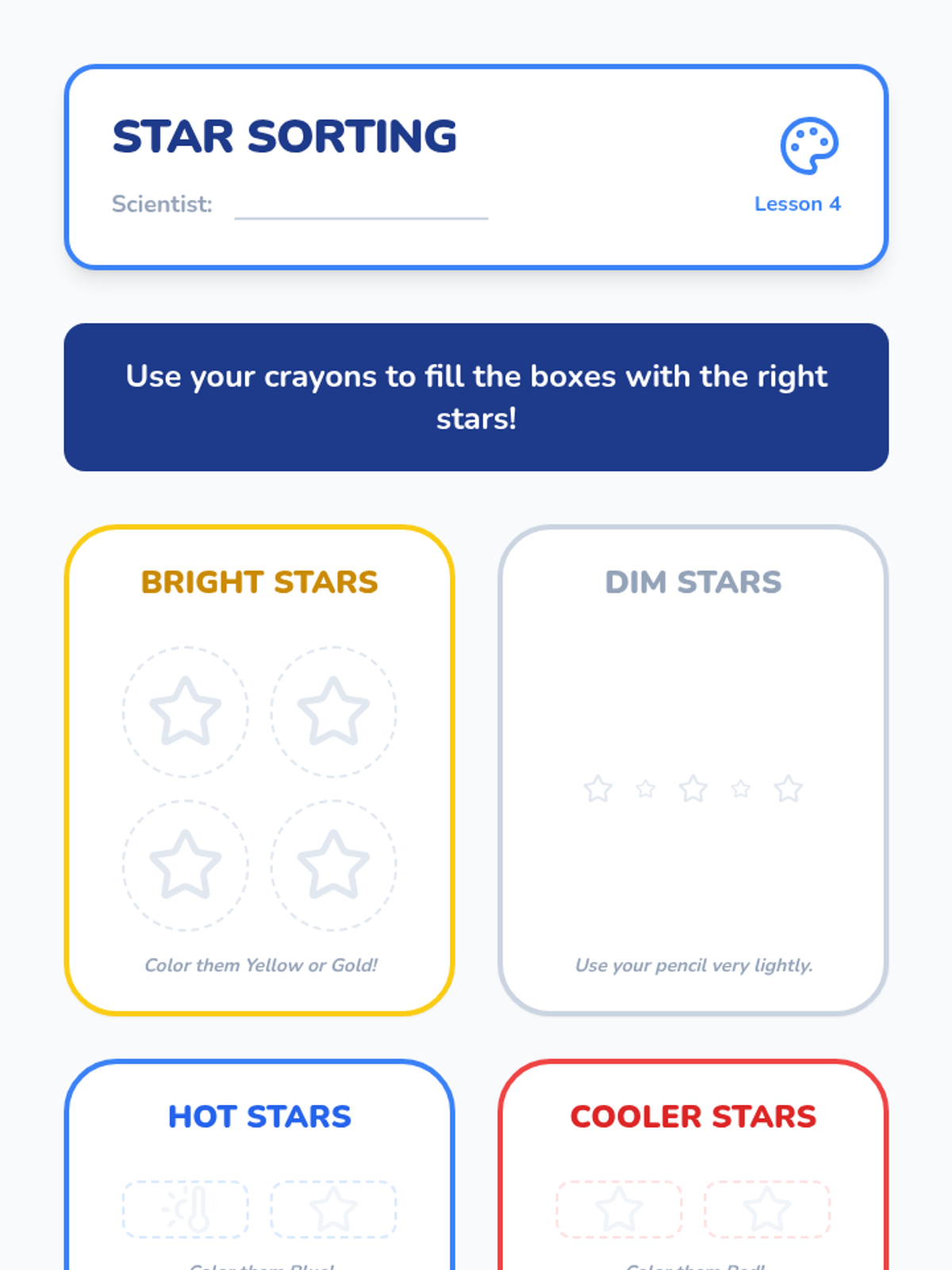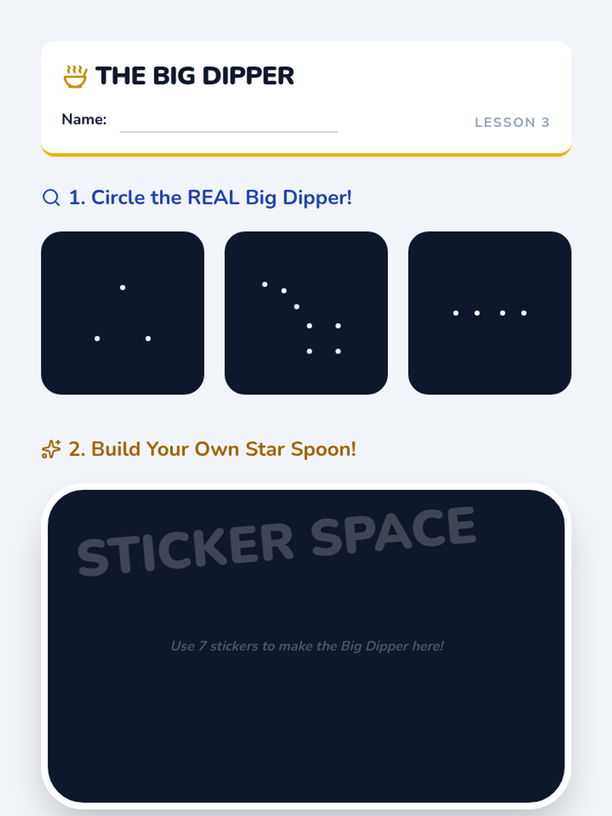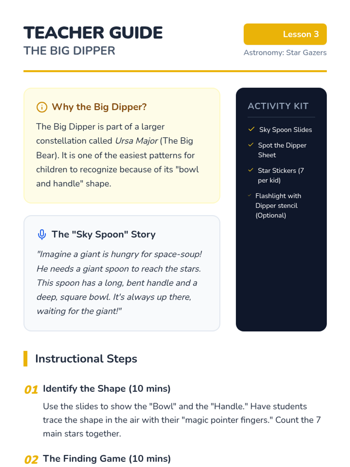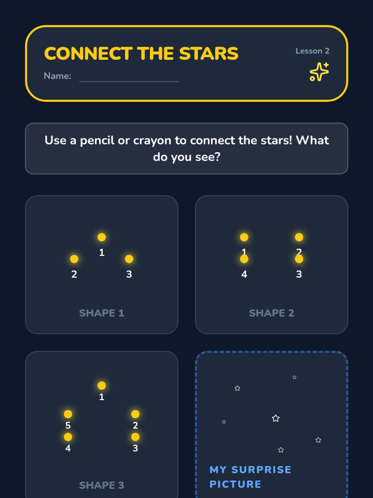 This sequence introduces Kindergarten students to stars and constellations, exploring why stars look small, how to connect them into patterns, and the diversity of their brightness and color.
