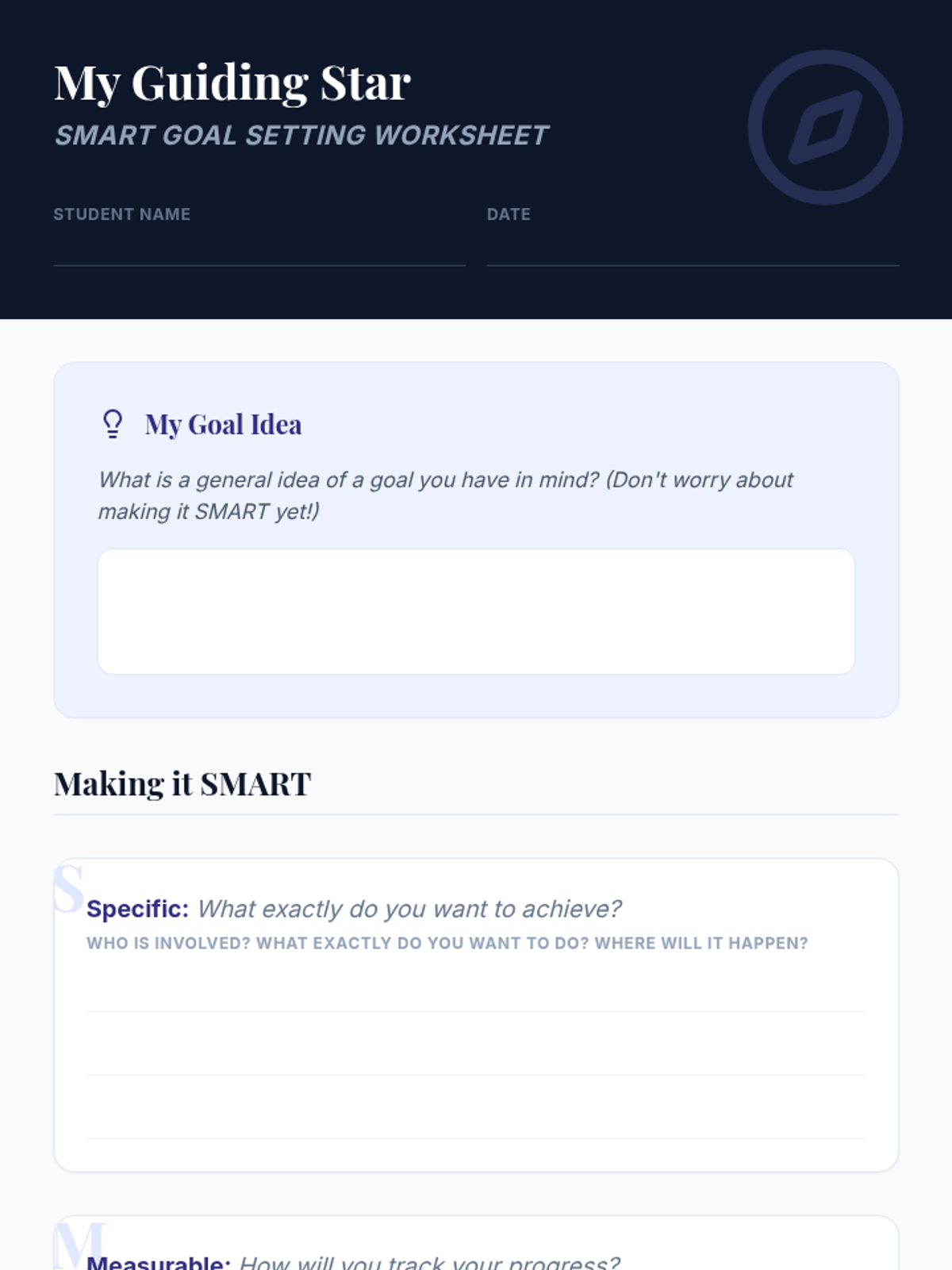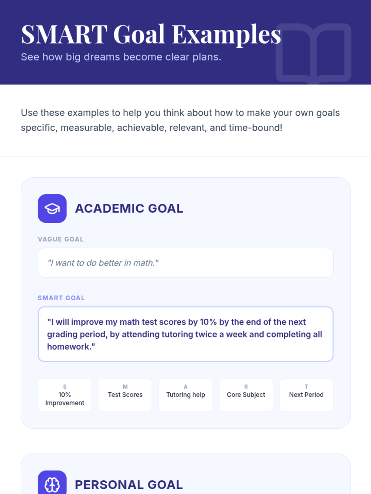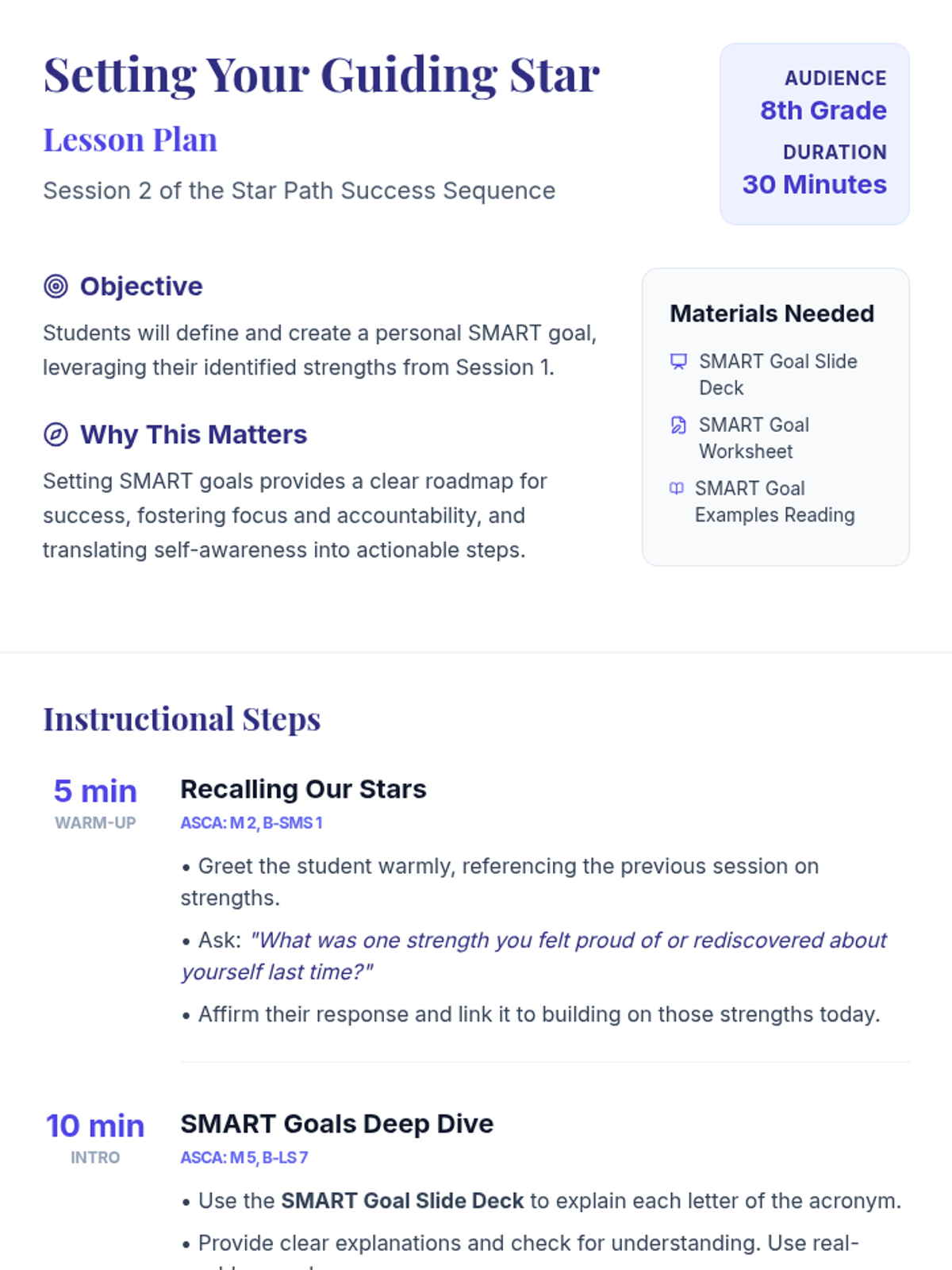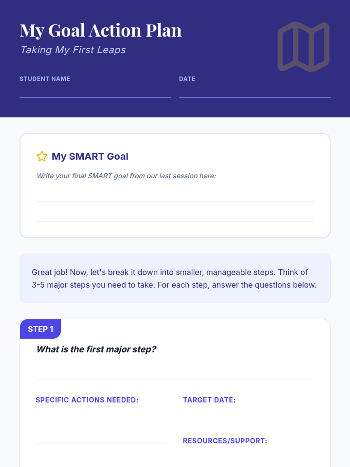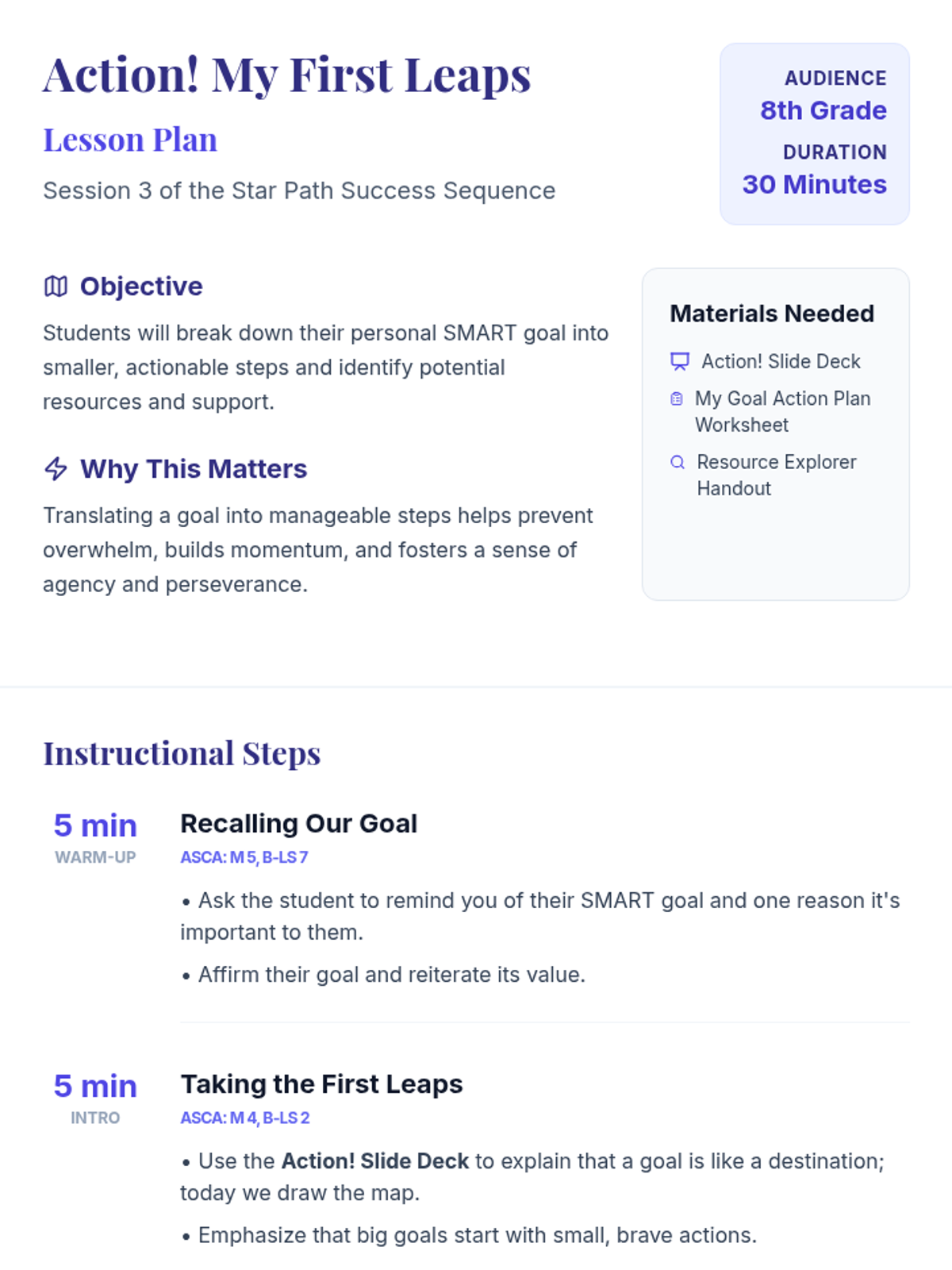 A three-session Tier 3 intervention for 8th-grade students to build confidence, define SMART goals, and create actionable plans for success. This sequence fosters agency and resilience by breaking big dreams into manageable steps.