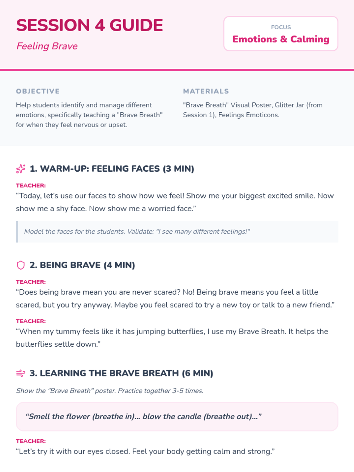 A comprehensive four-lesson series designed to help students identify their emotions, recognize physical triggers, build a coping toolbox, and align their reactions with the size of their problems.