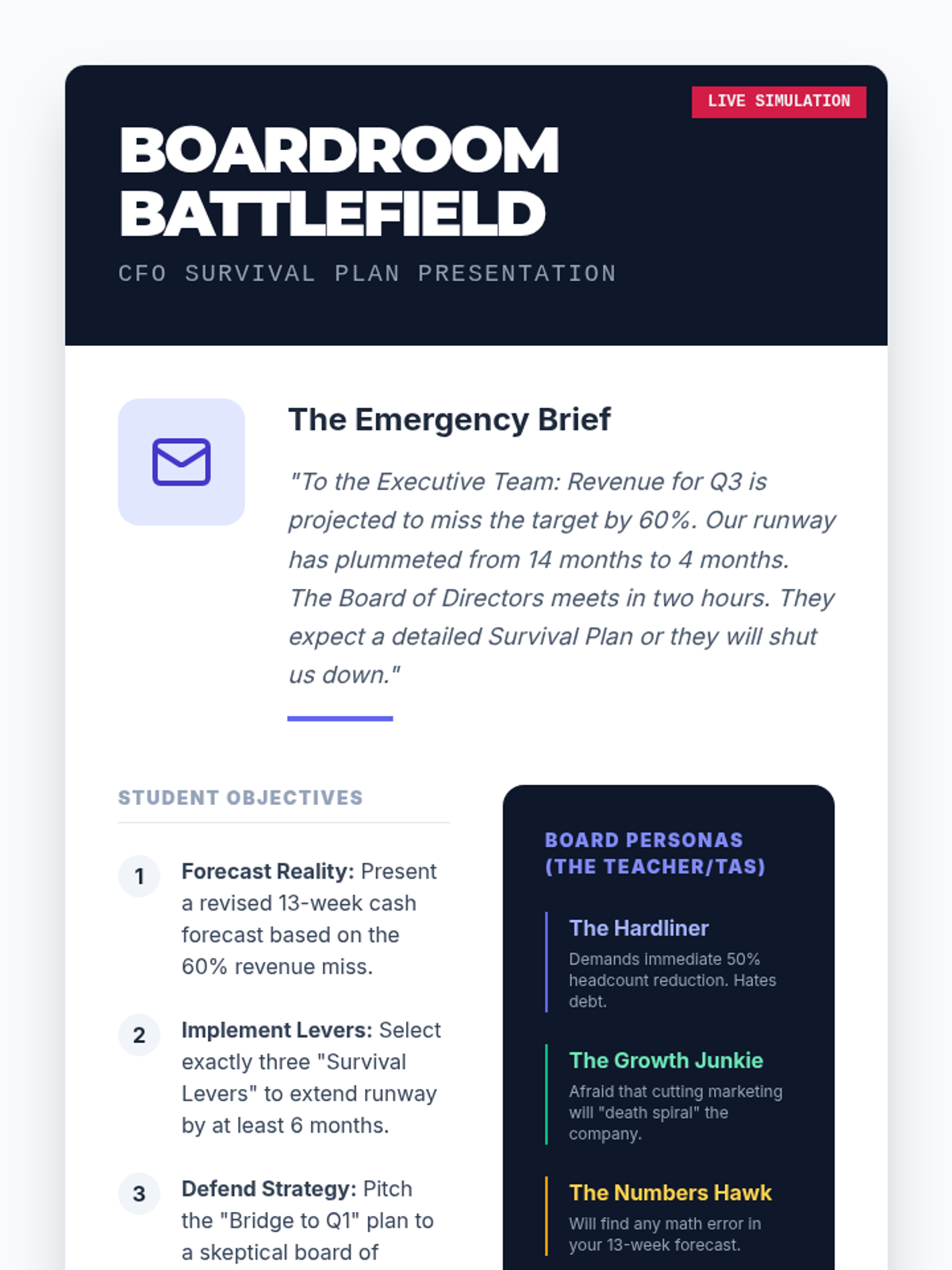 A comprehensive unit for undergraduate entrepreneurs focusing on the tactical realities of cash management, burn rates, and financial survival in early-stage startups. Students move from theoretical accounting to practical liquidity forecasting and crisis management.