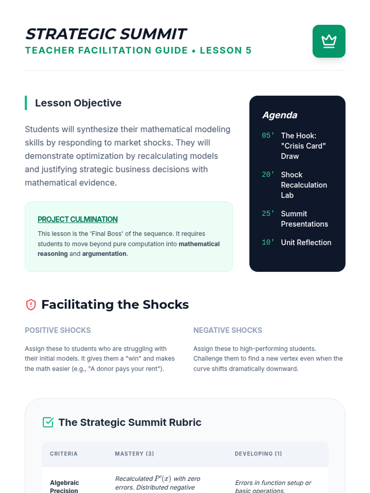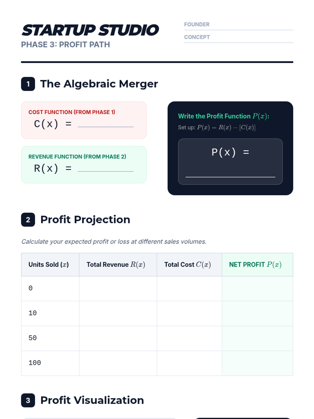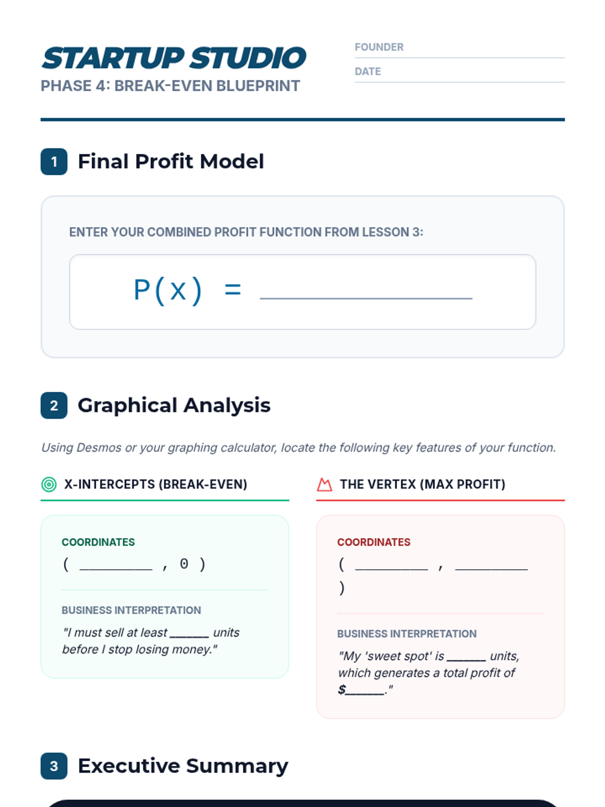 In this project-based sequence, 9th-grade students act as entrepreneurs to model the financial viability of a business startup using algebraic functions. They progress from linear cost models to revenue and profit functions, culminating in break-even analysis and strategic optimization.