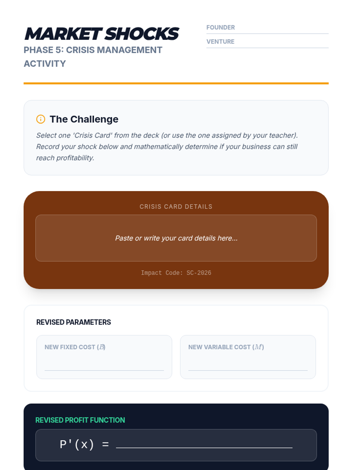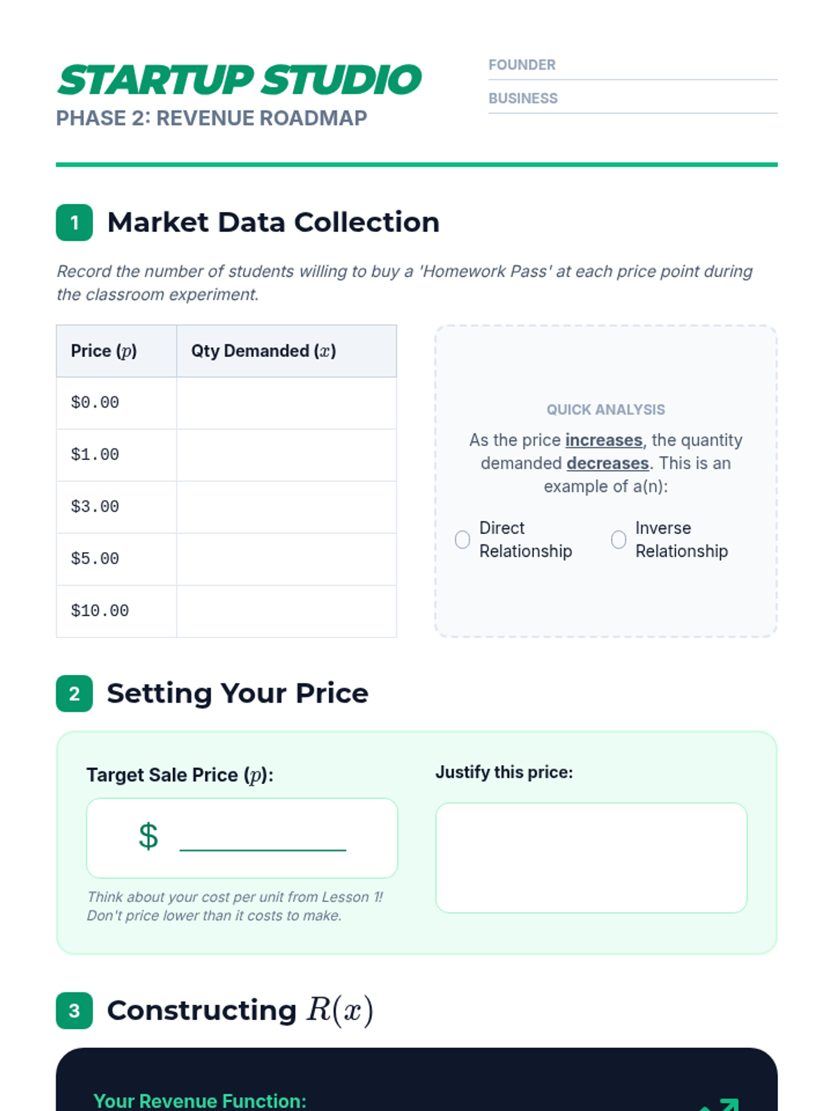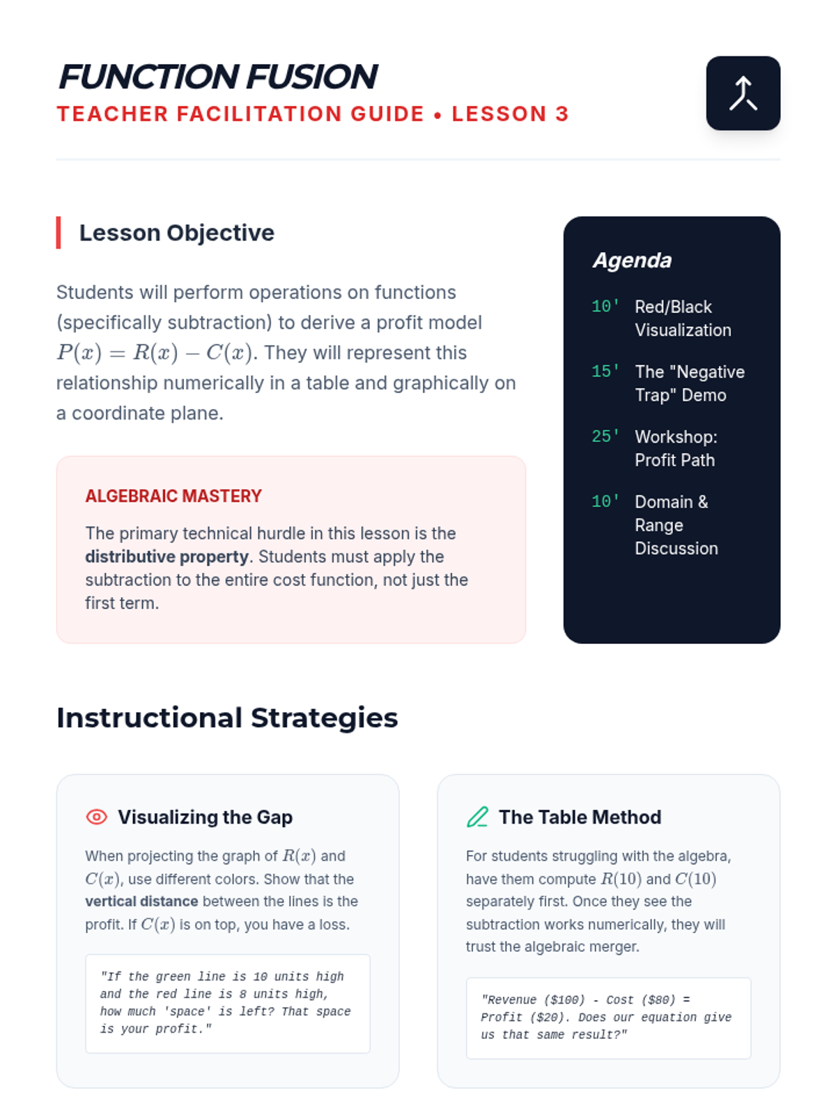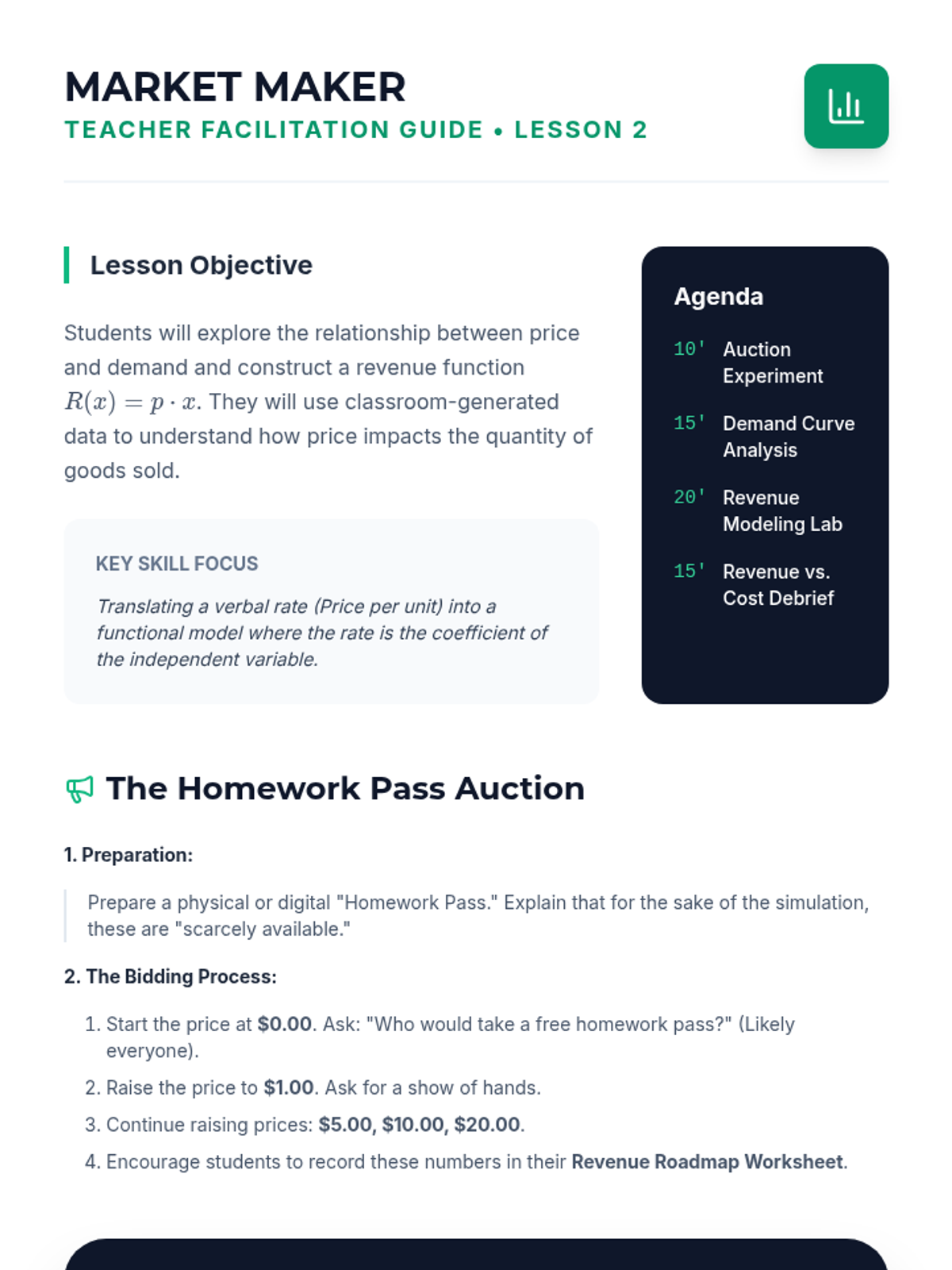 In this project-based sequence, 9th-grade students act as entrepreneurs to model the financial viability of a business startup using algebraic functions. They progress from linear cost models to revenue and profit functions, culminating in break-even analysis and strategic optimization.