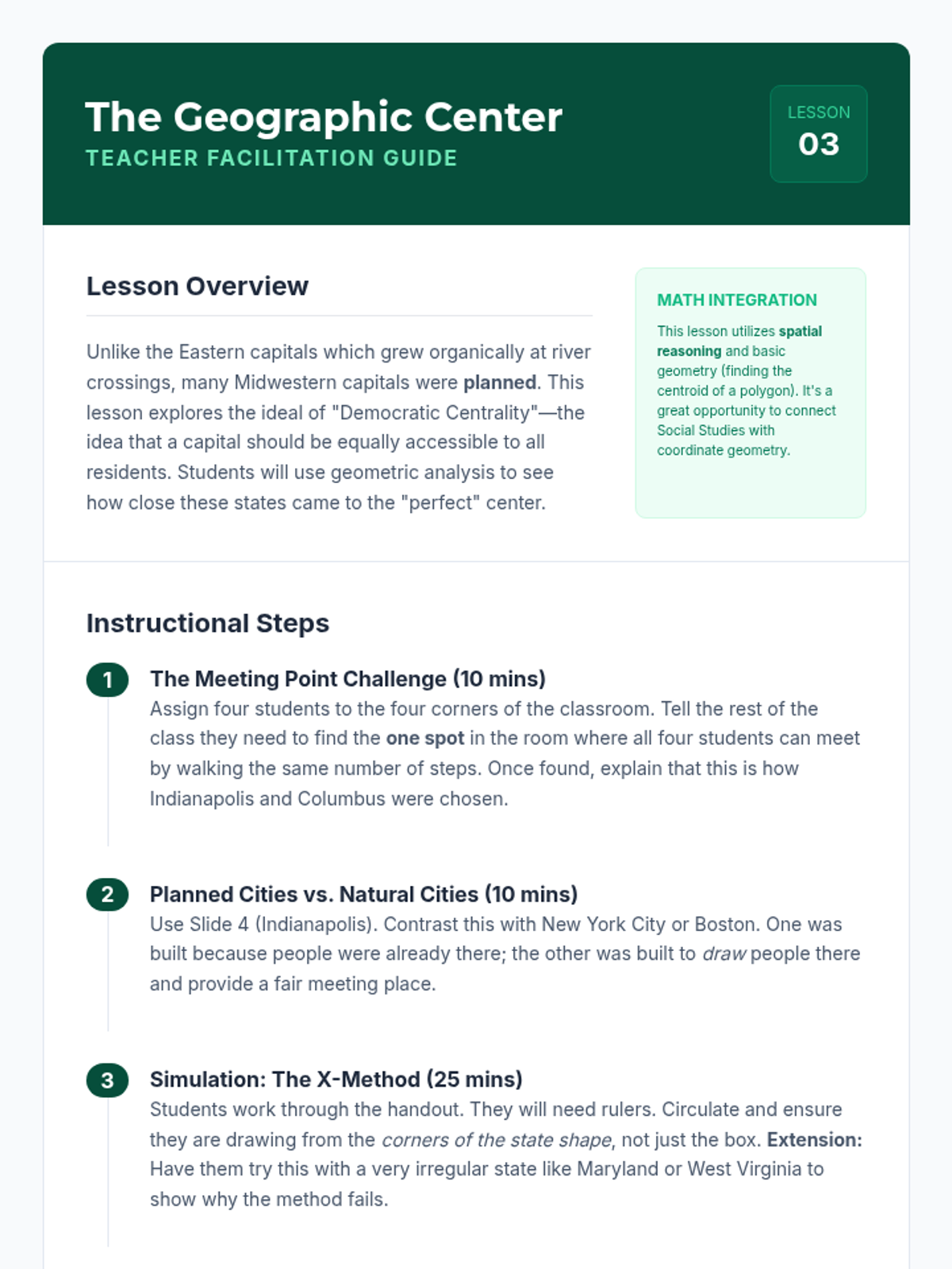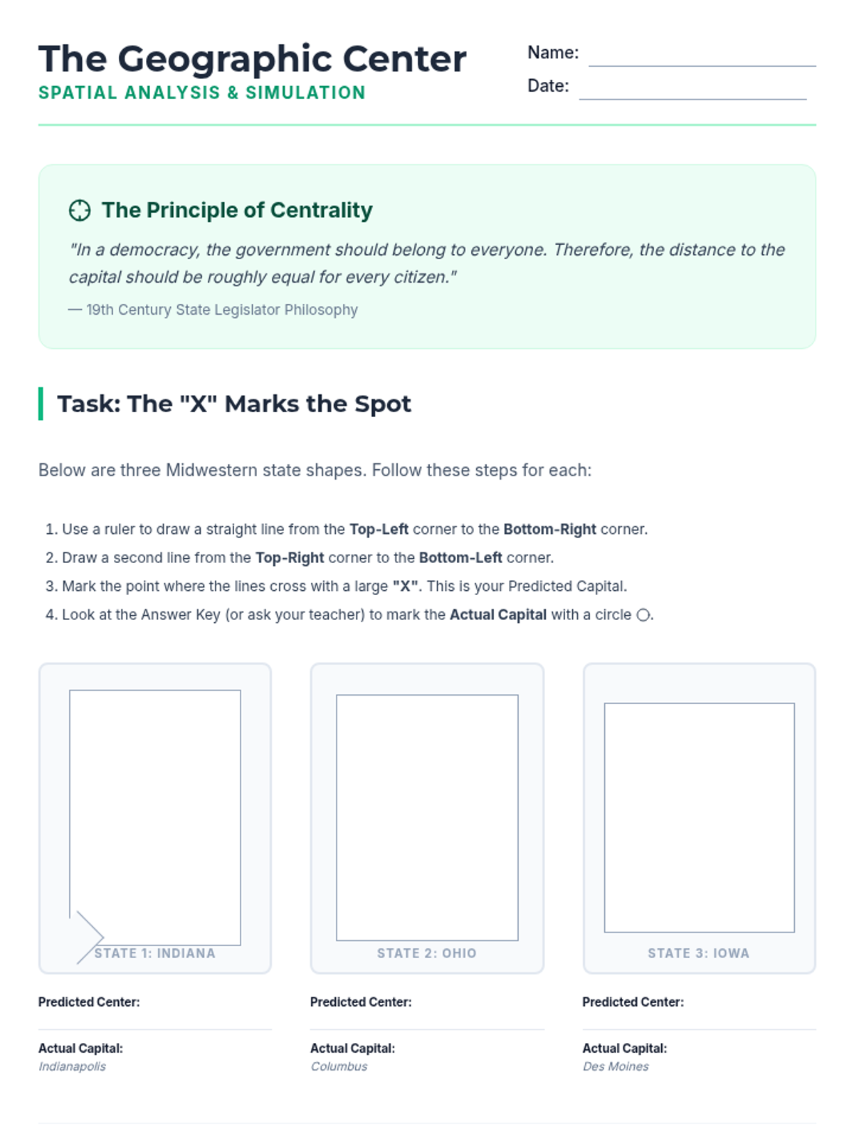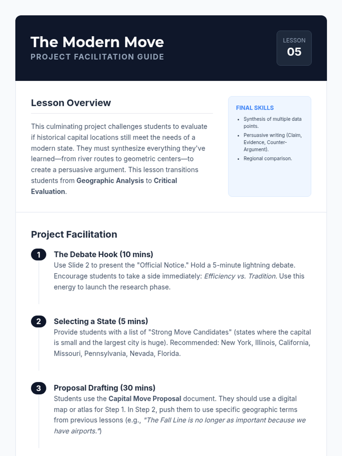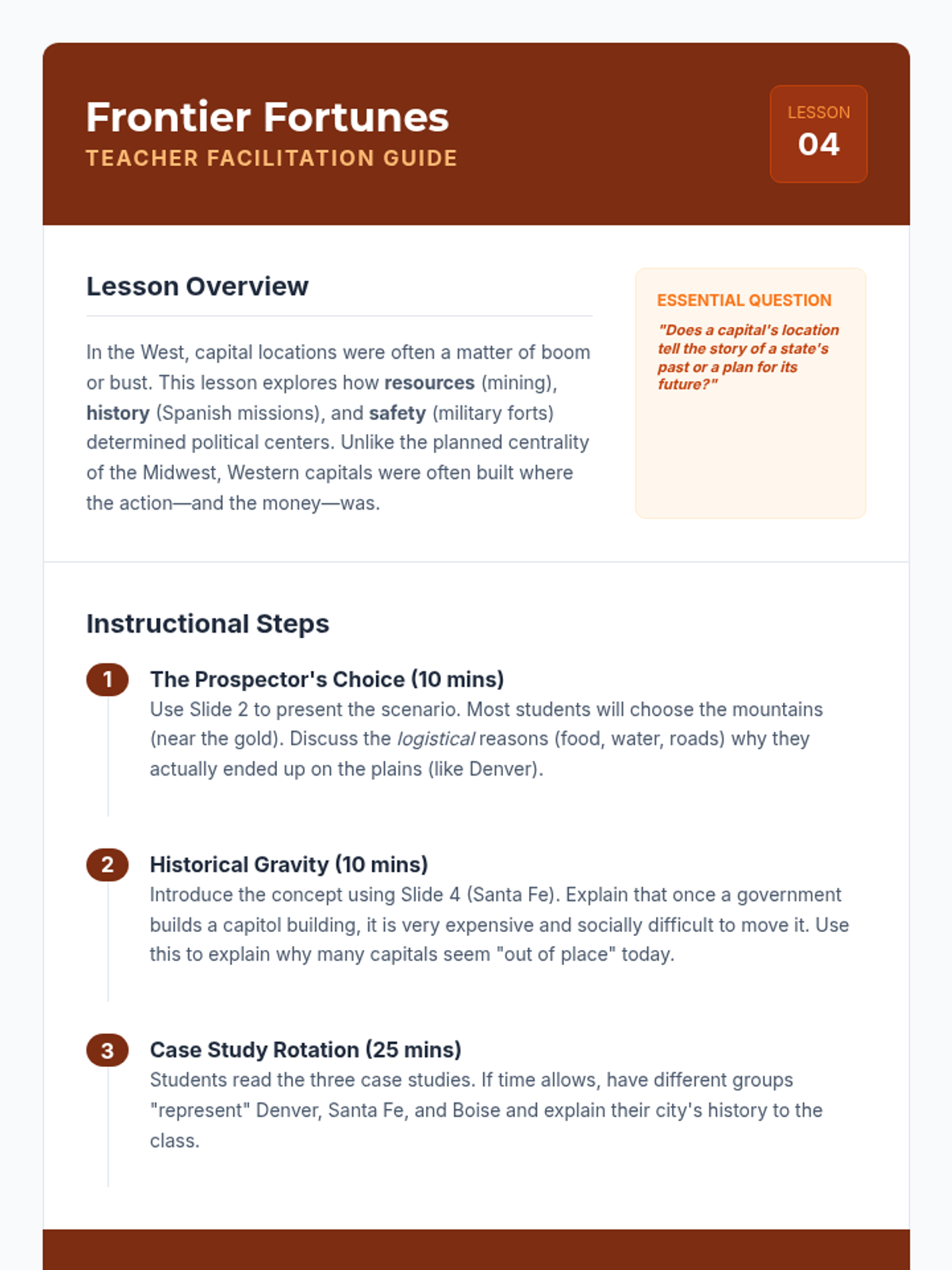 A 6th-grade geography sequence investigating why U.S. state capitals are located where they are, moving beyond memorization to analyze historical, economic, and geographic factors. Students explore patterns of centrality, waterway access, and resource proximity while debating the modern efficiency of these locations.