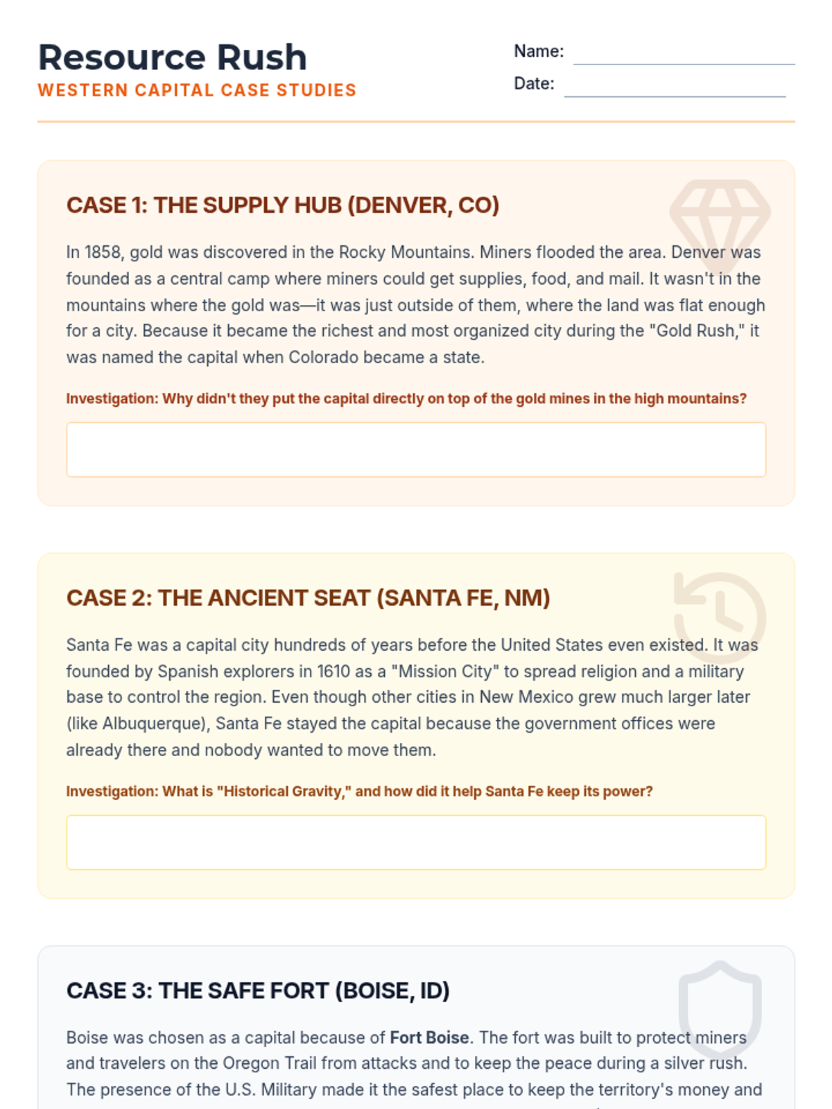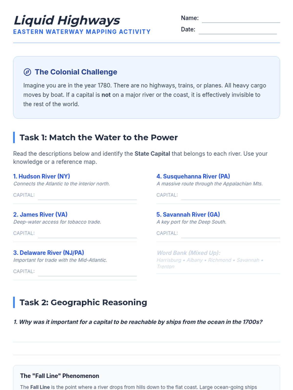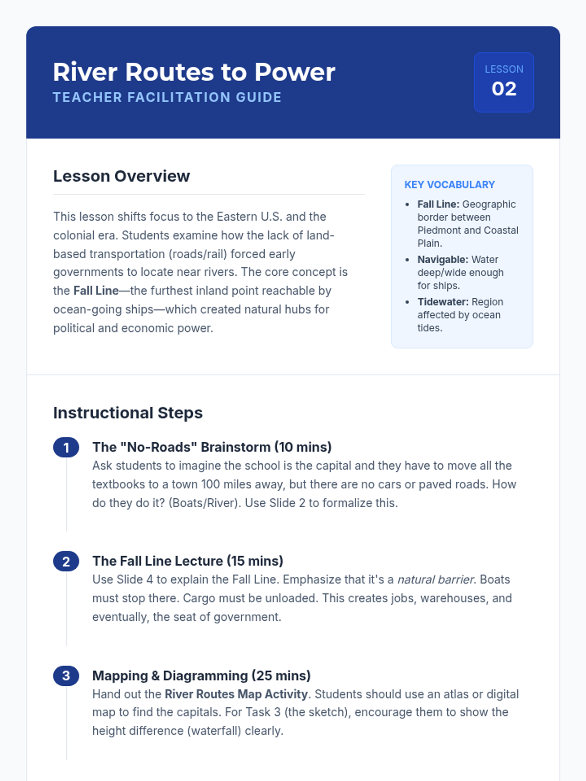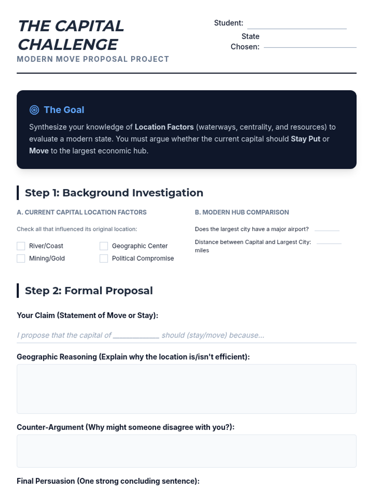 A 6th-grade geography sequence investigating why U.S. state capitals are located where they are, moving beyond memorization to analyze historical, economic, and geographic factors. Students explore patterns of centrality, waterway access, and resource proximity while debating the modern efficiency of these locations.