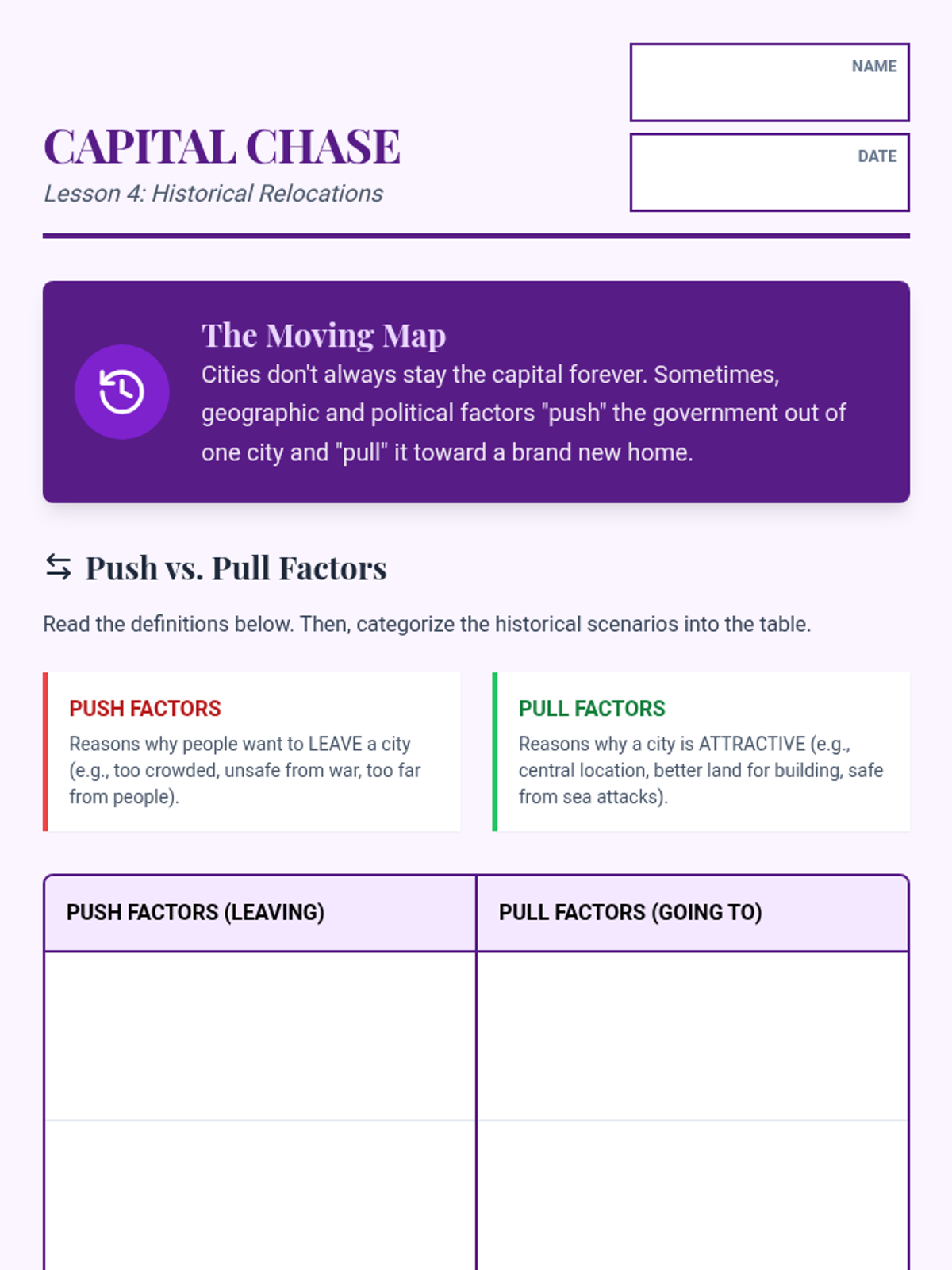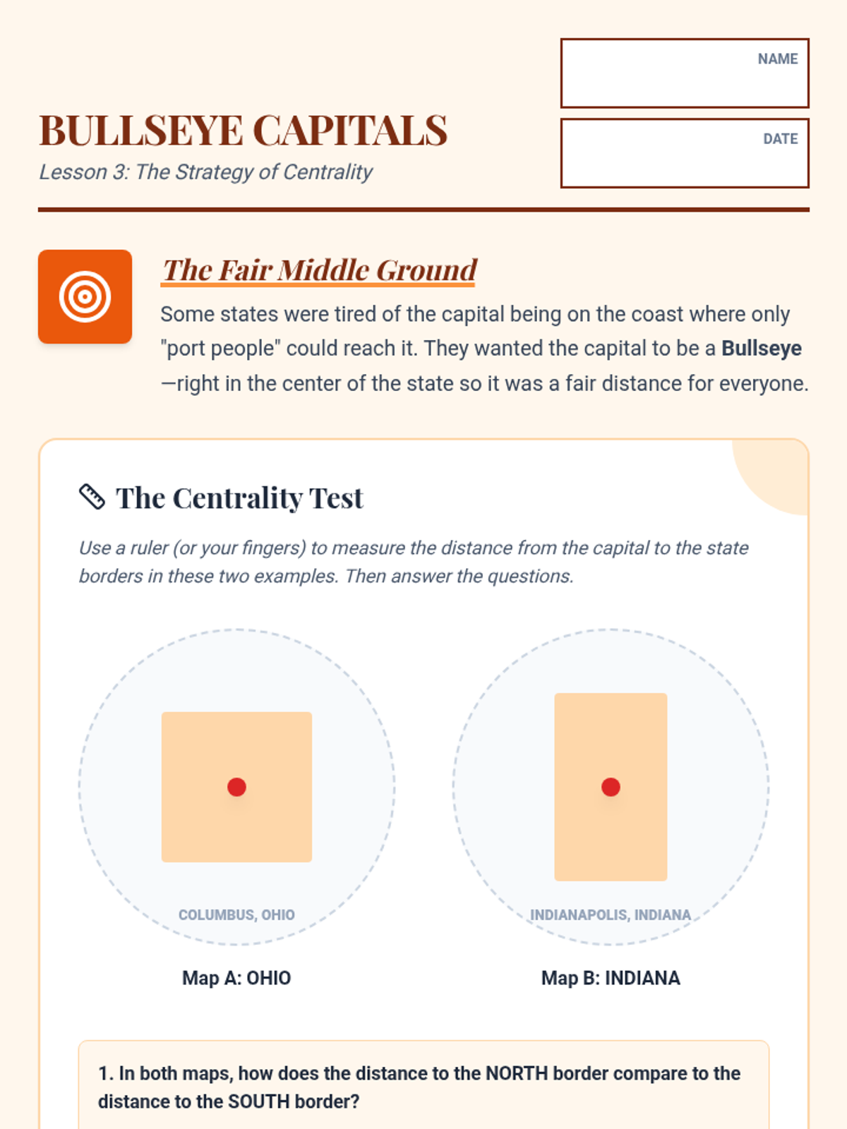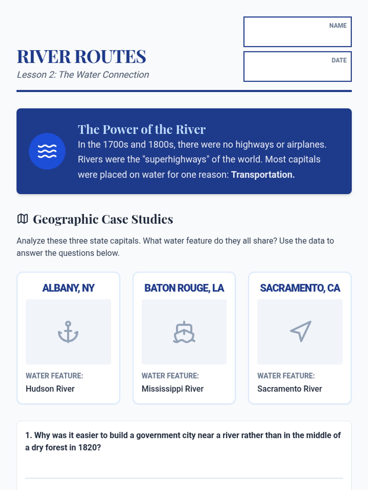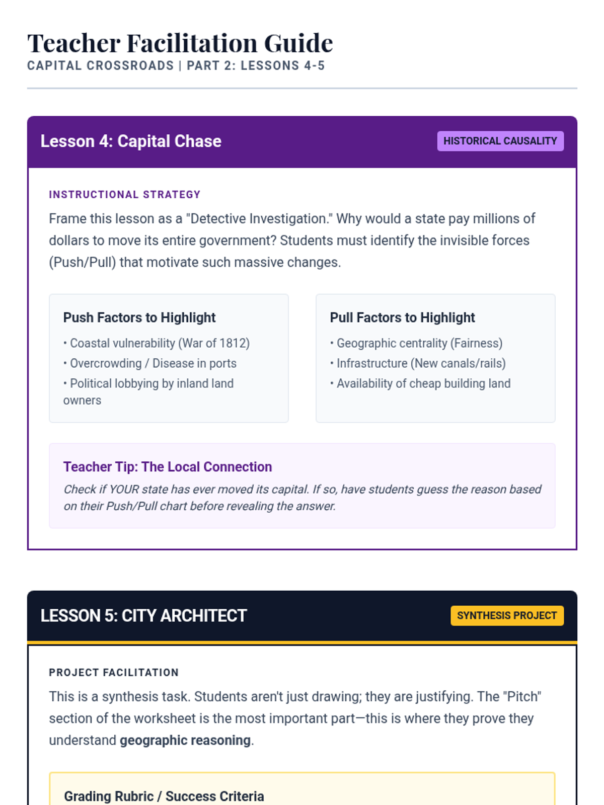 A 5-lesson unit exploring why state capitals are located where they are, focusing on geographic factors like water access, centrality, and historical shifts. Students move from defining a capital's role to designing their own strategic seat of government.