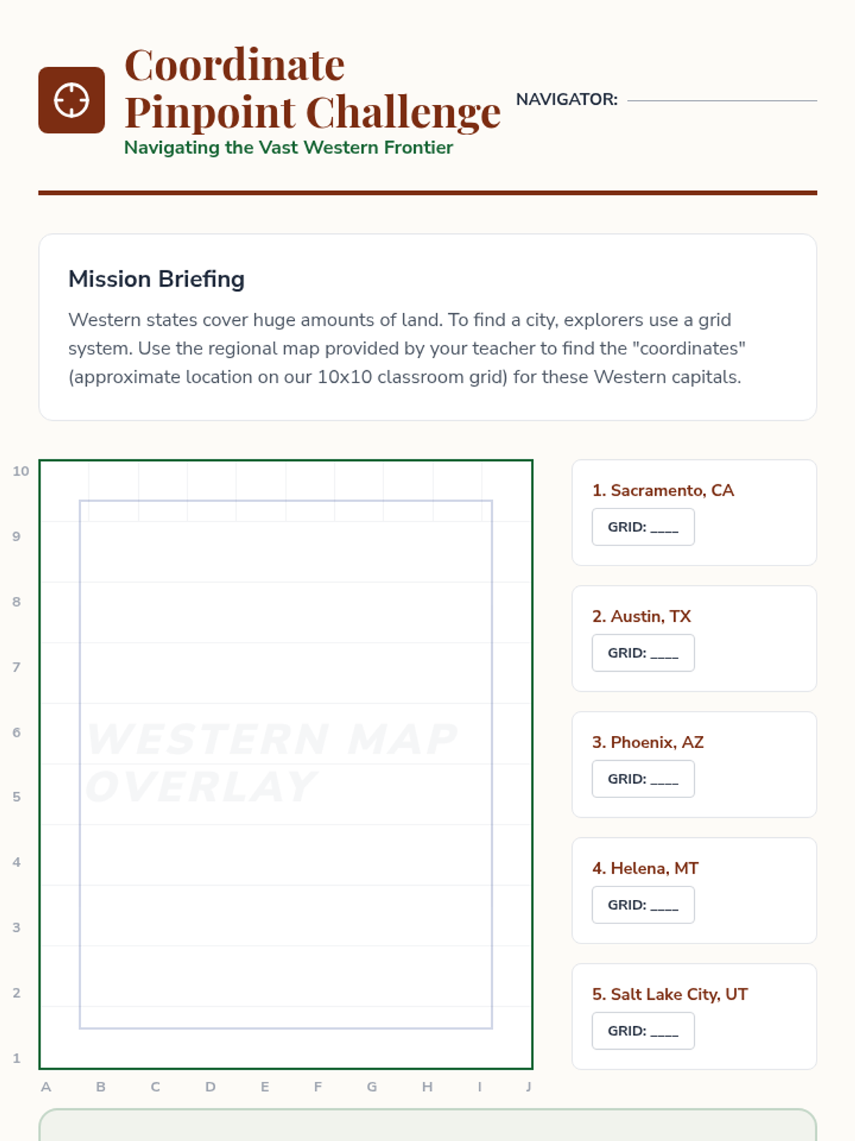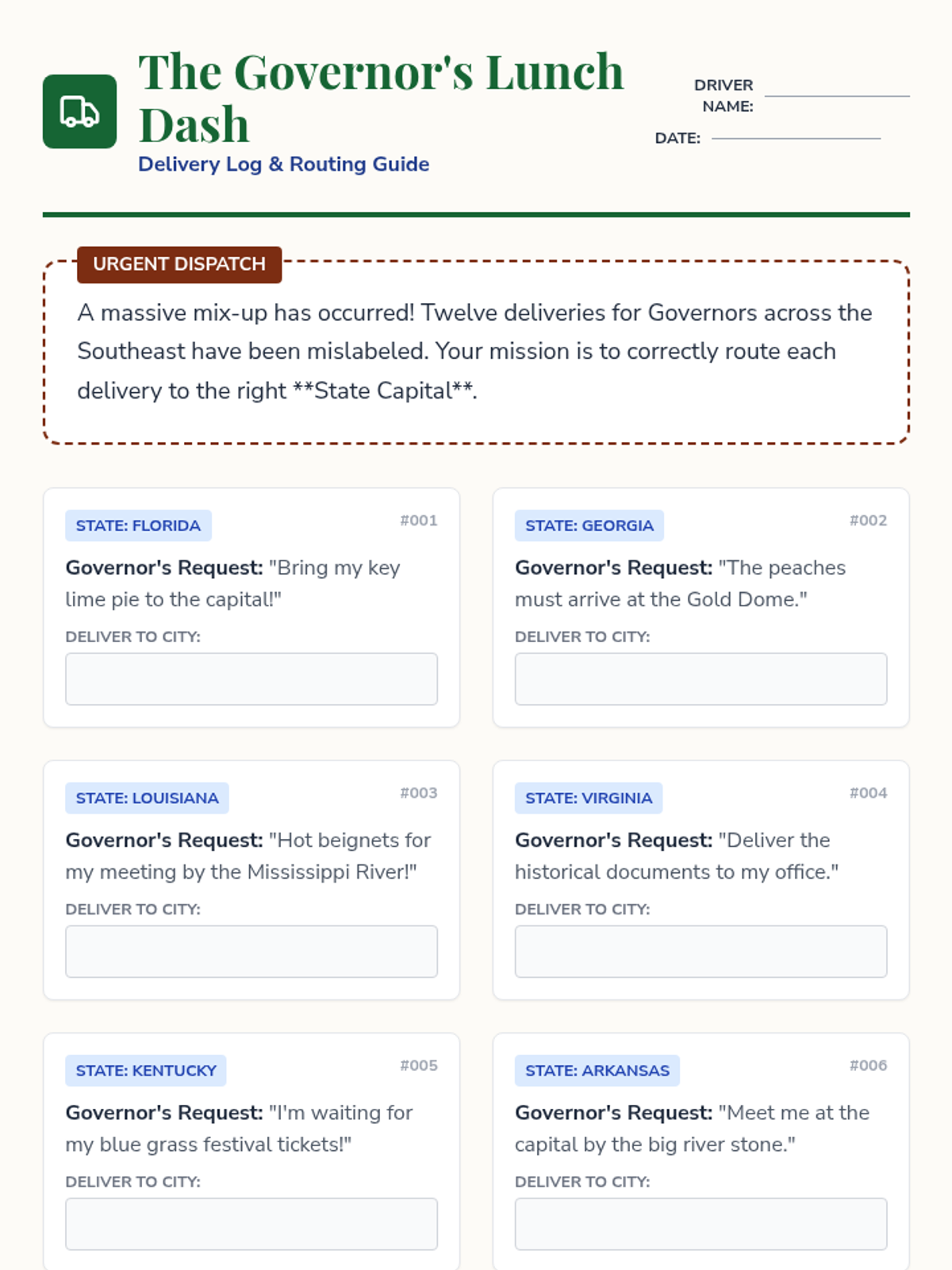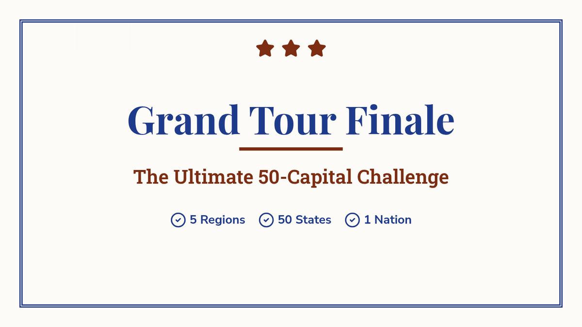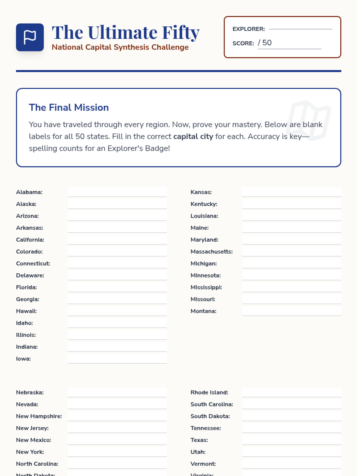A 5th-grade mastery-based sequence exploring the 50 U.S. state capitals through regional lenses, using mnemonics, map analysis, and gamified challenges to build spatial awareness.