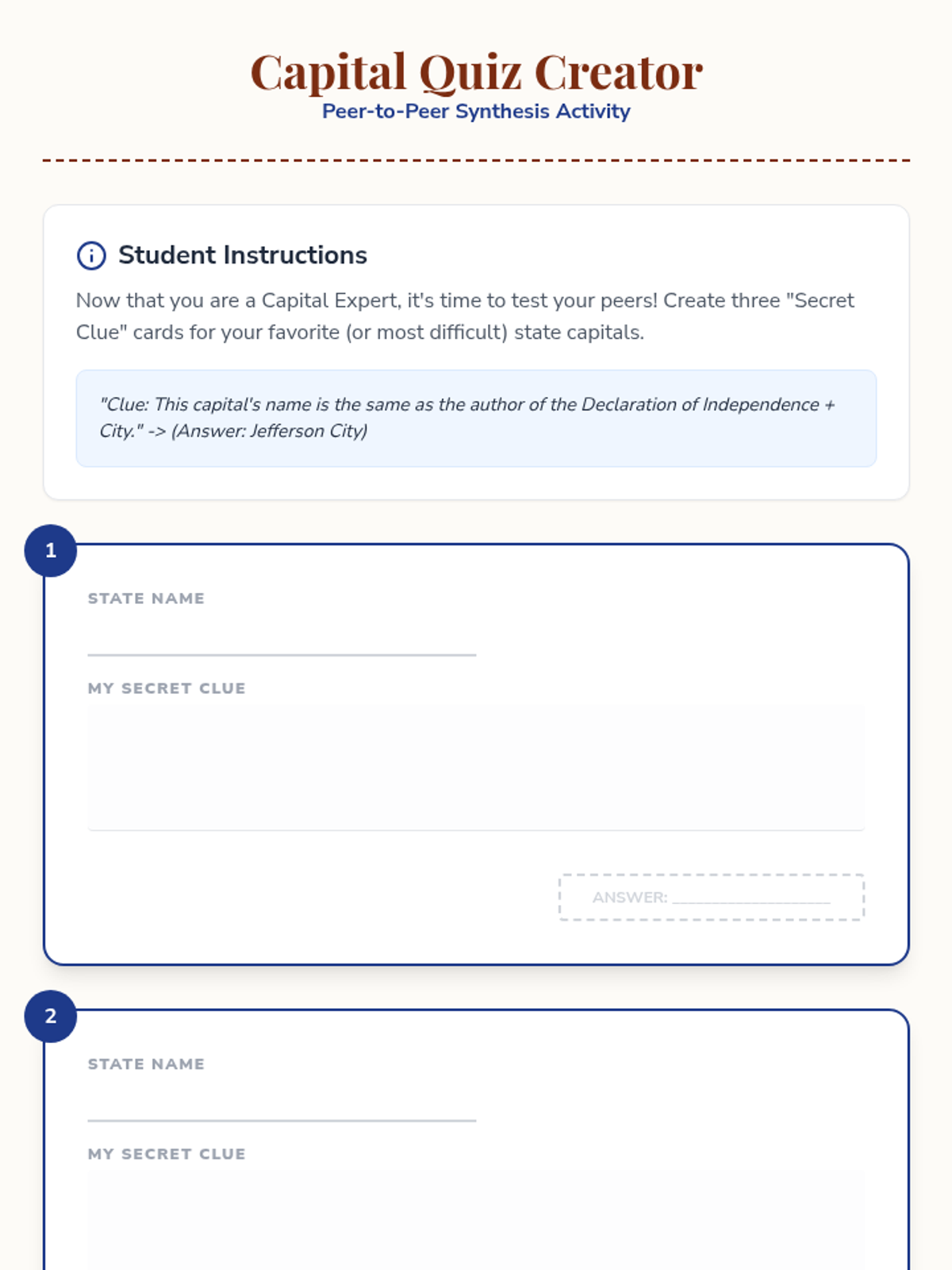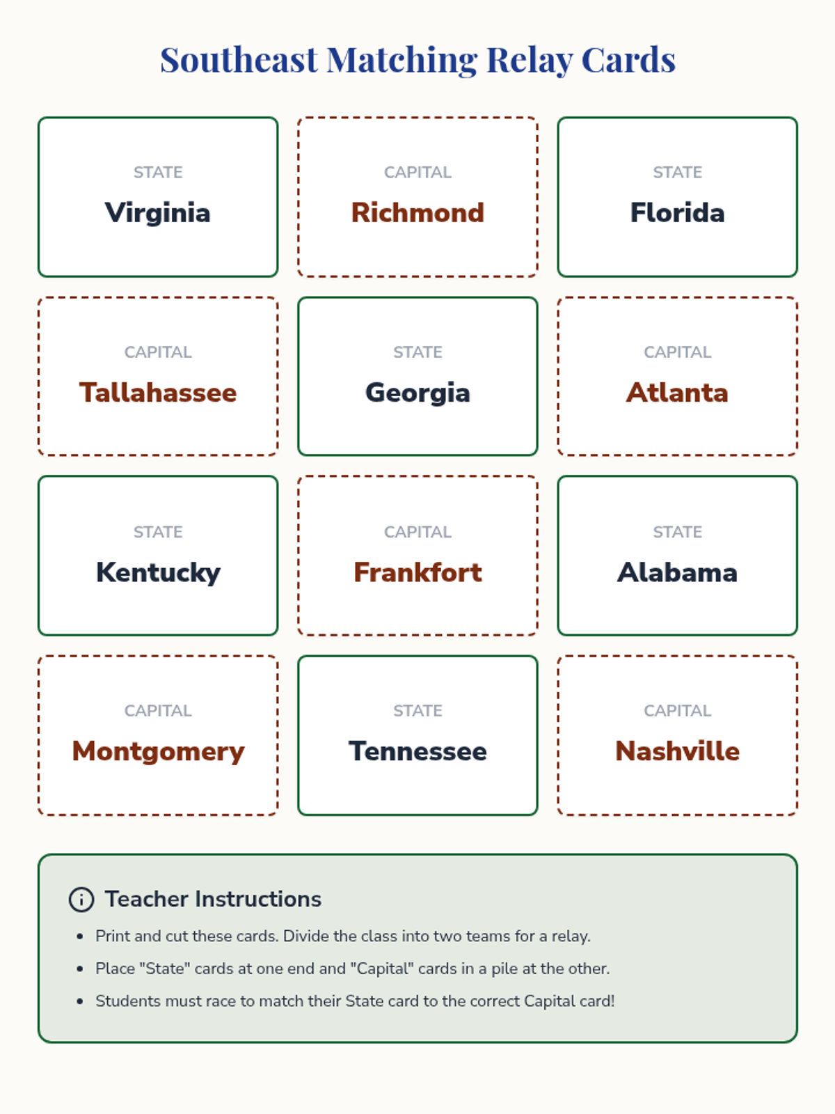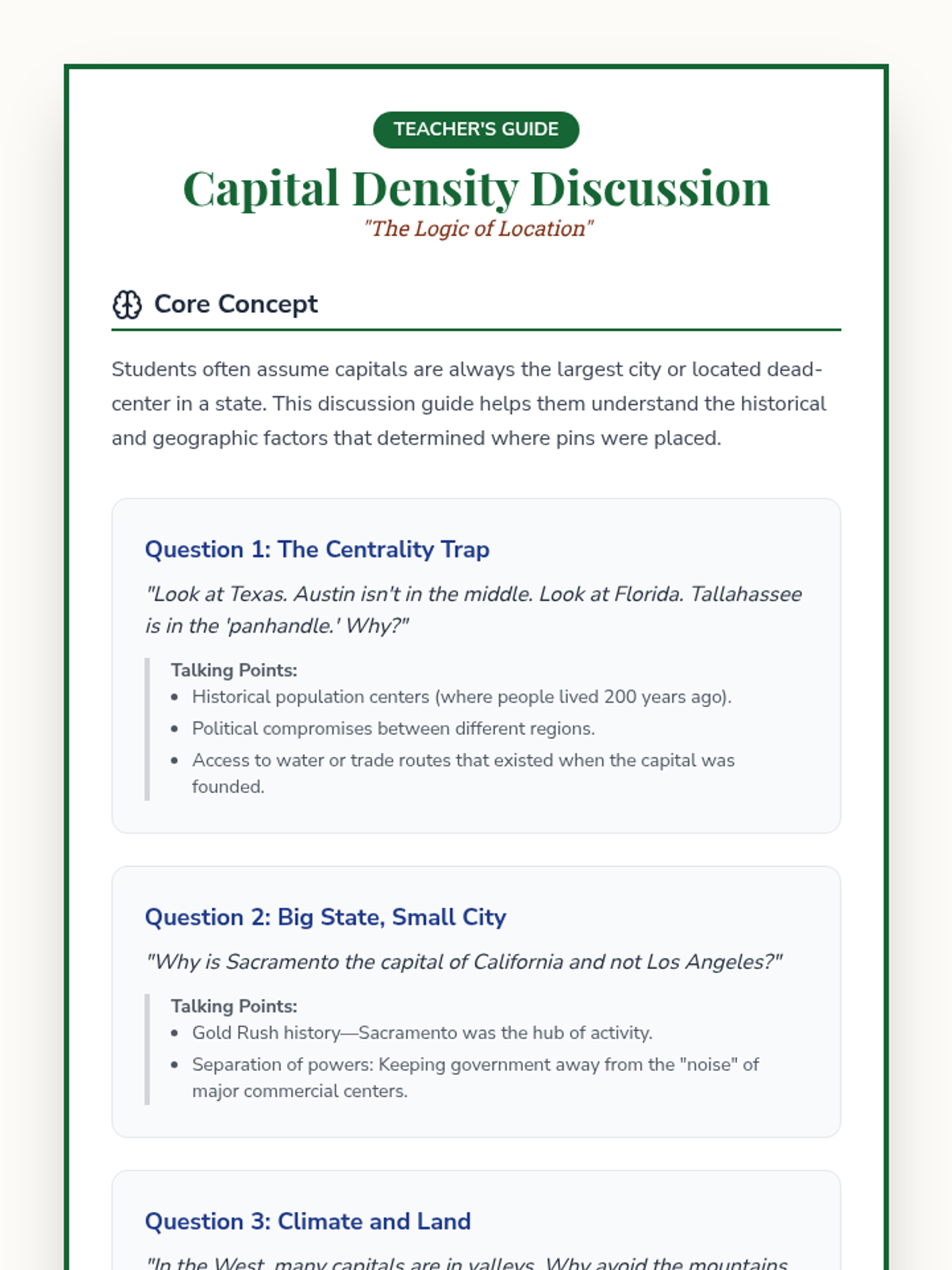 A 5th-grade mastery-based sequence exploring the 50 U.S. state capitals through regional lenses, using mnemonics, map analysis, and gamified challenges to build spatial awareness.