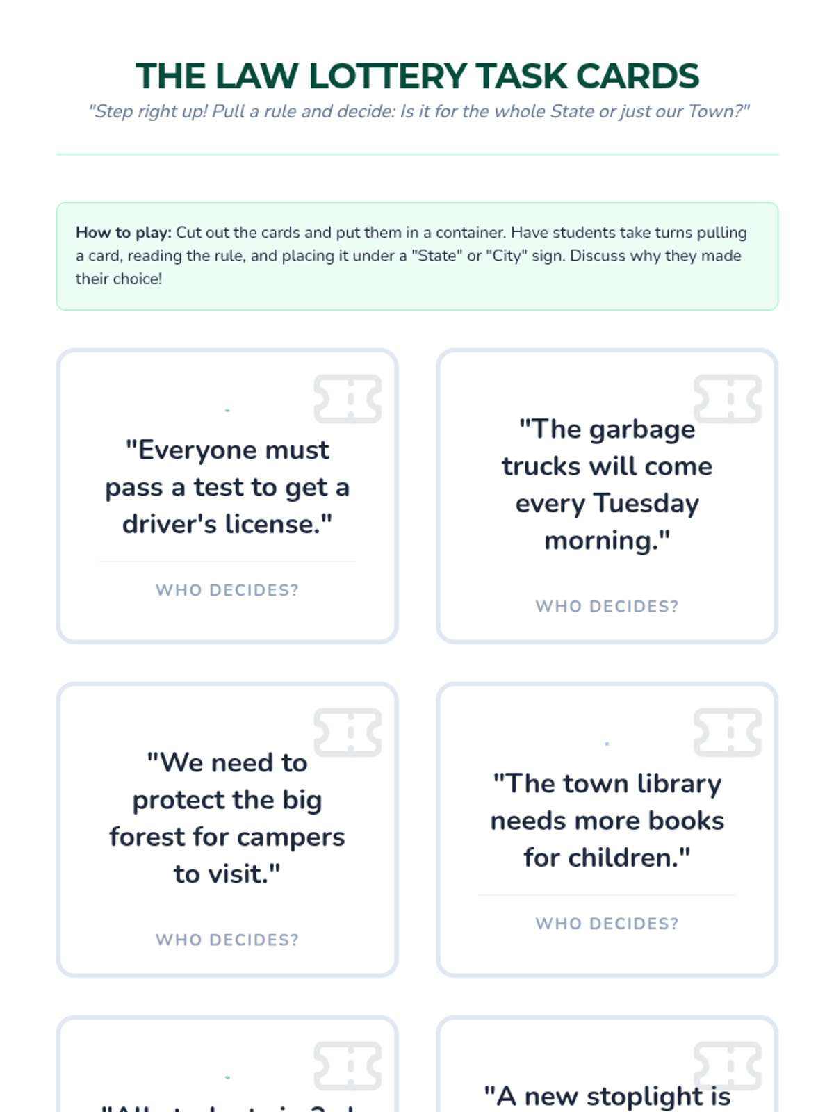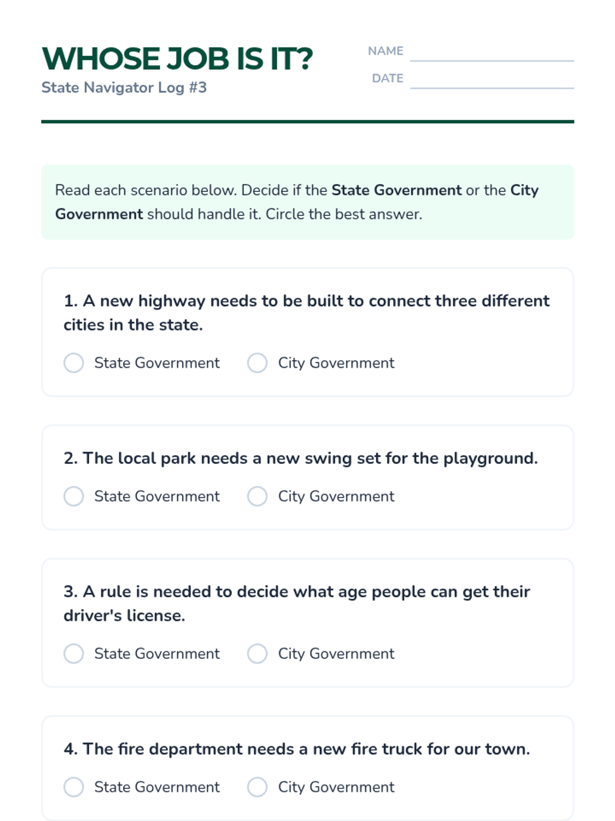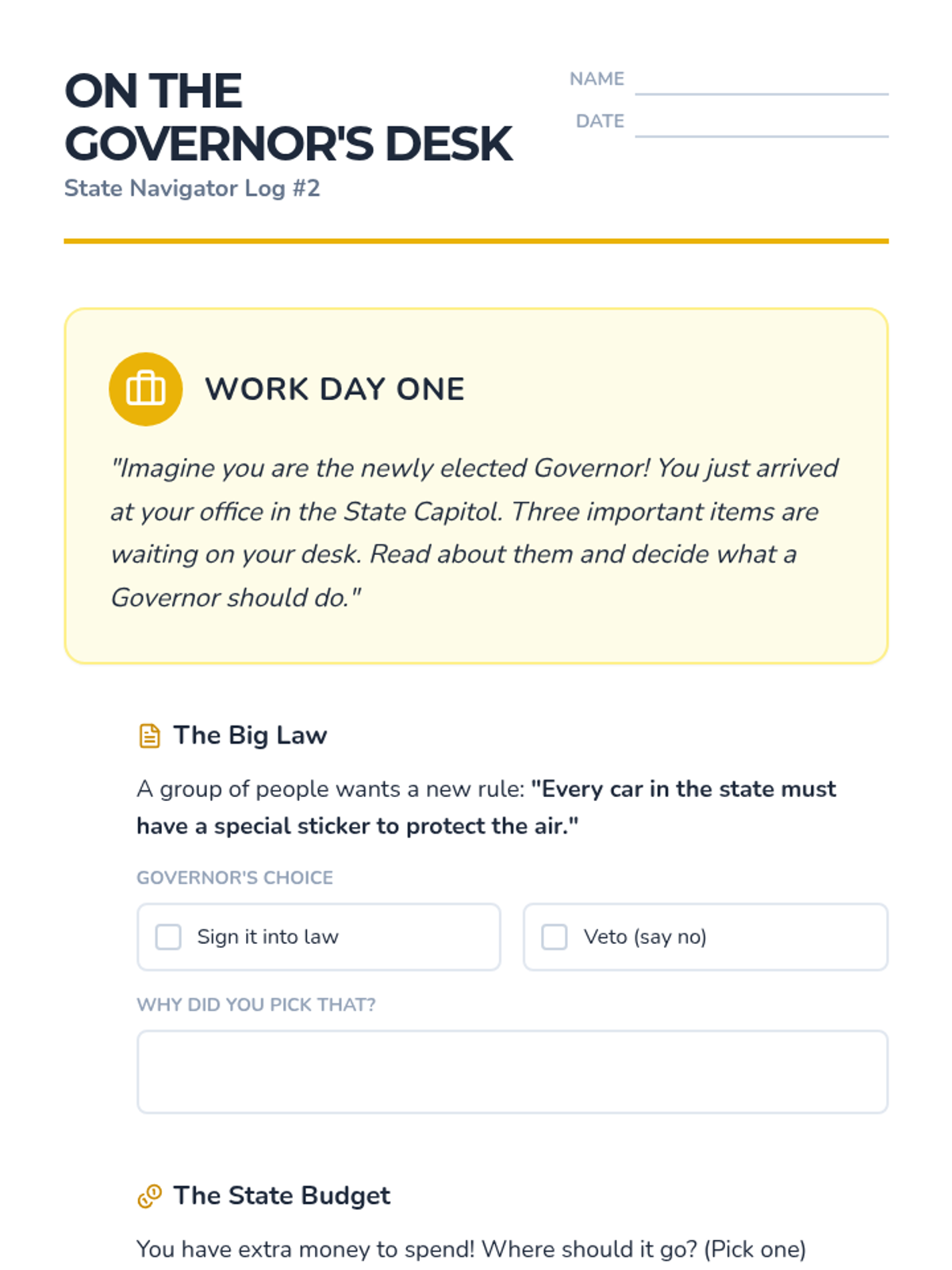 This sequence explores the hierarchy of government, the role of the Governor, the distinction between state and local laws, and the significance of state capitals. Students will engage in simulations and projects to understand how state government functions and impacts their lives.