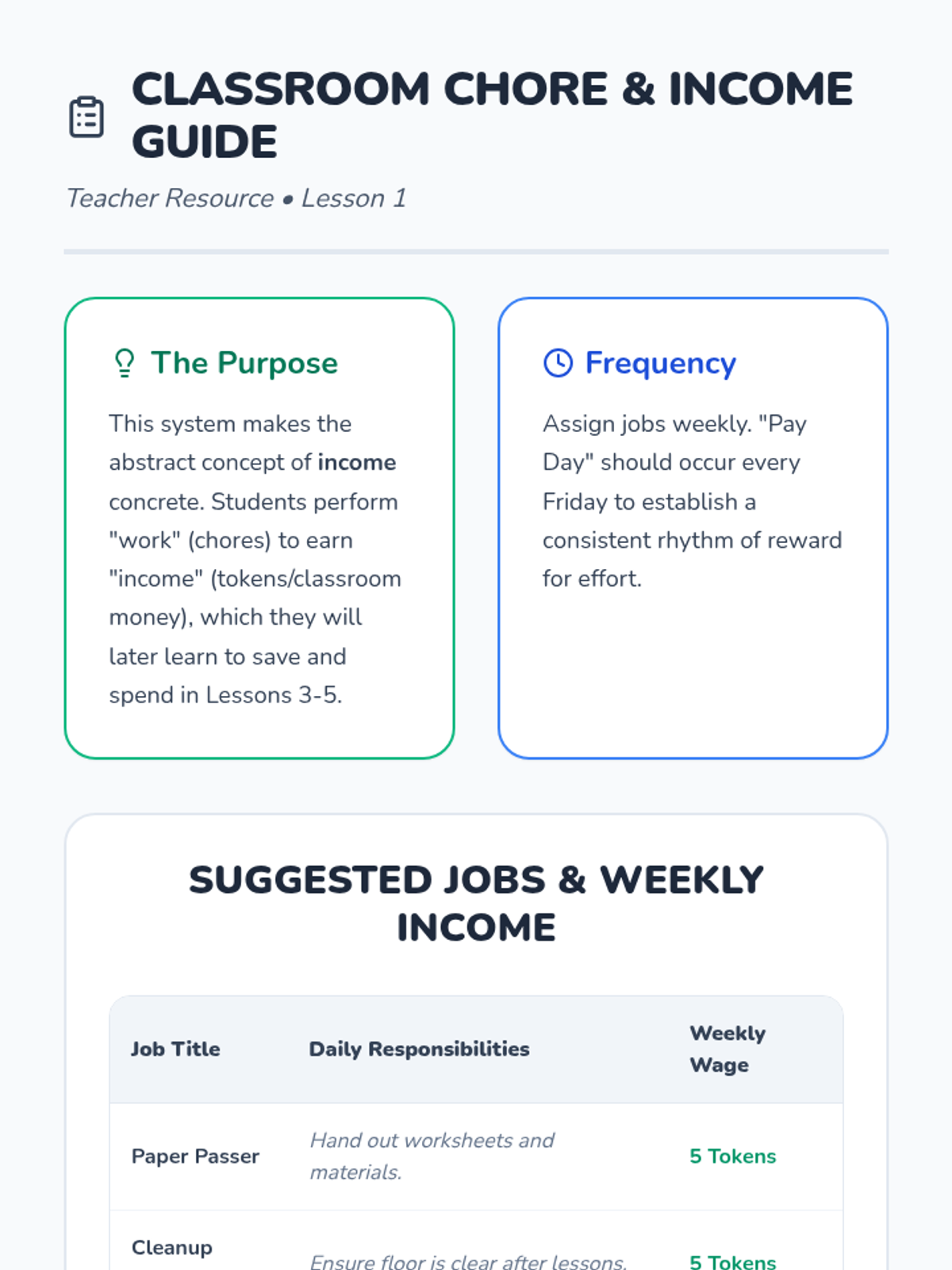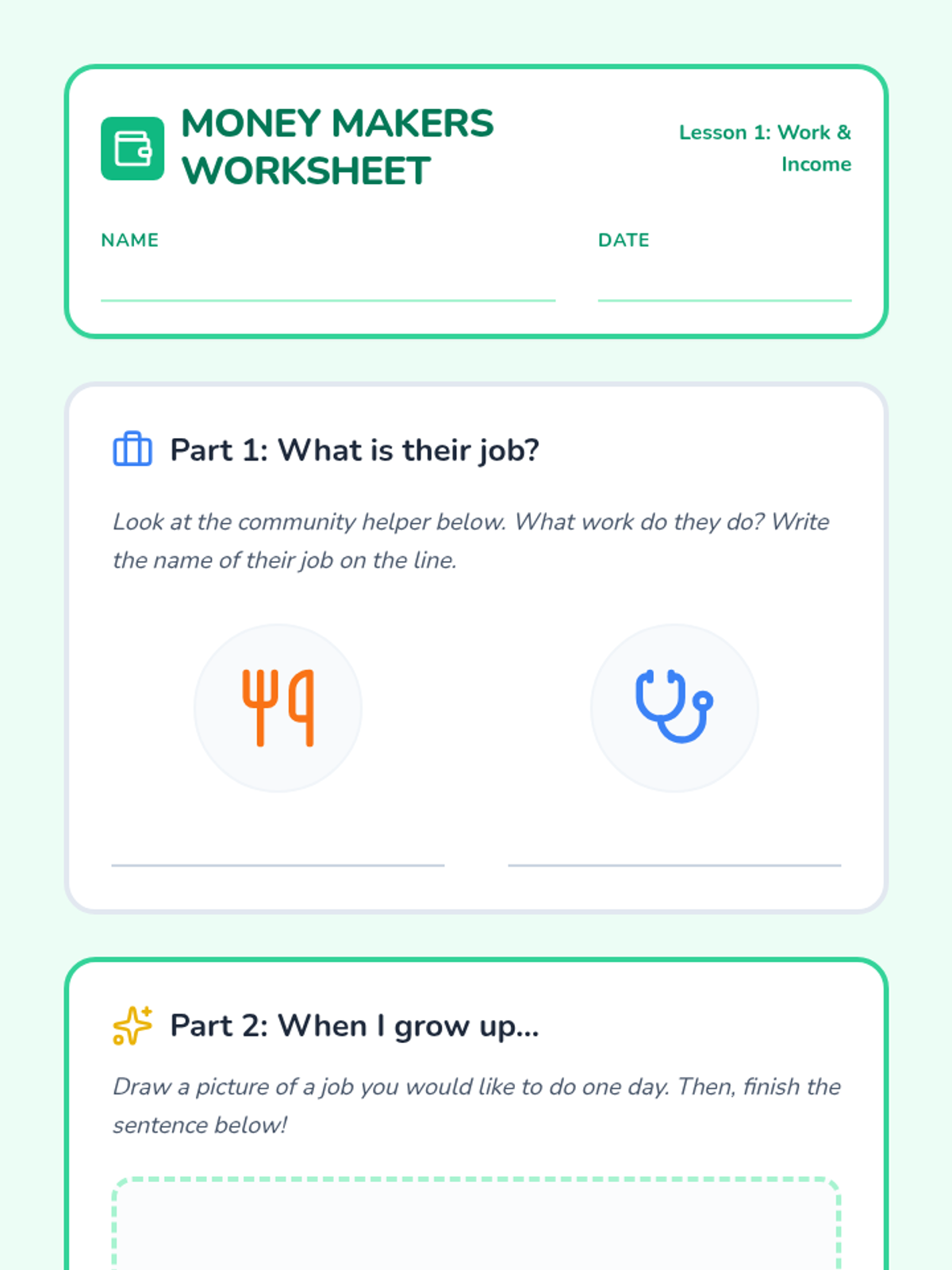 This 1st Grade sequence introduces the fundamentals of economics by exploring how money is earned through work, the difference between goods and services, and the importance of saving for the future. Students engage in classroom simulations and goal-setting to make abstract financial concepts concrete and actionable.
