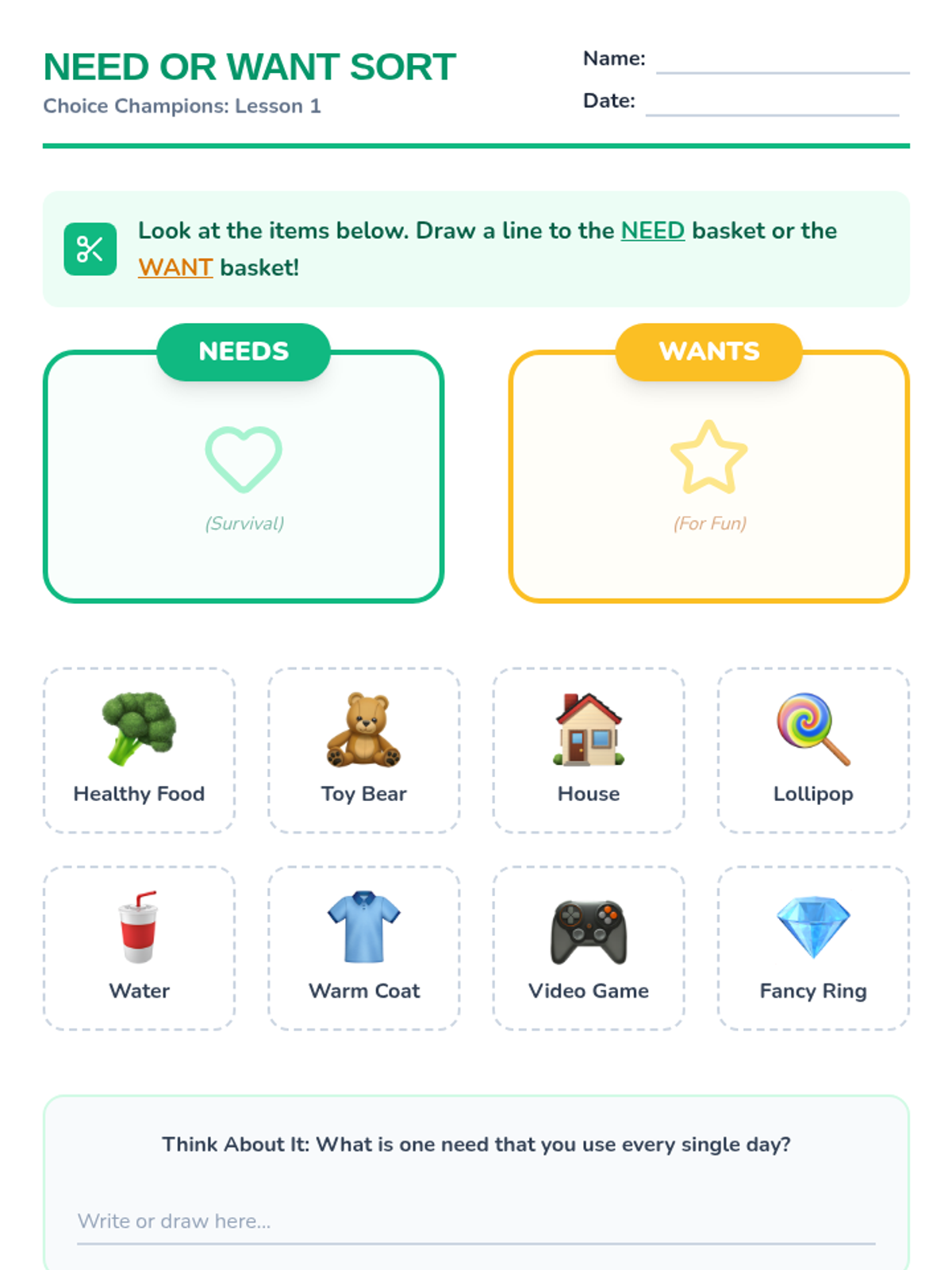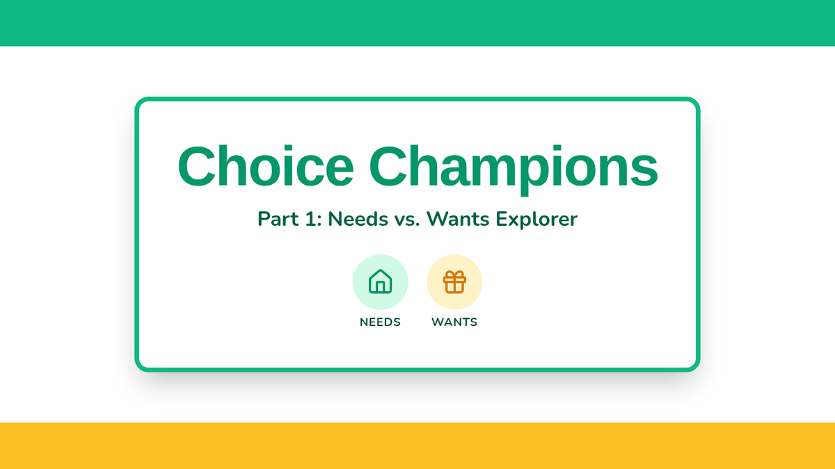 A foundational sequence for 1st graders exploring needs, wants, and scarcity. Students learn to differentiate survival essentials from desires and understand why resources are limited through simulations, games, and creative projects.