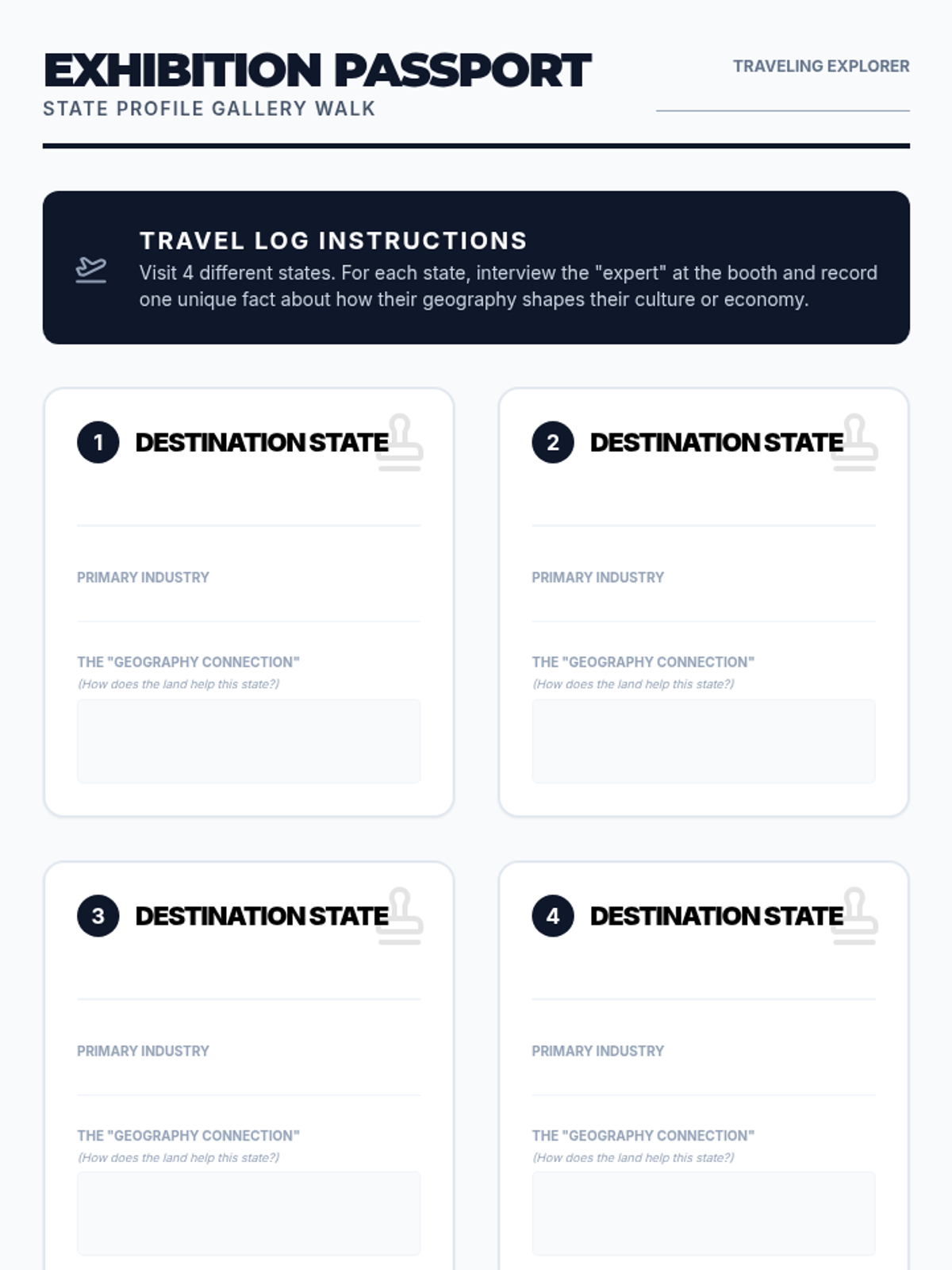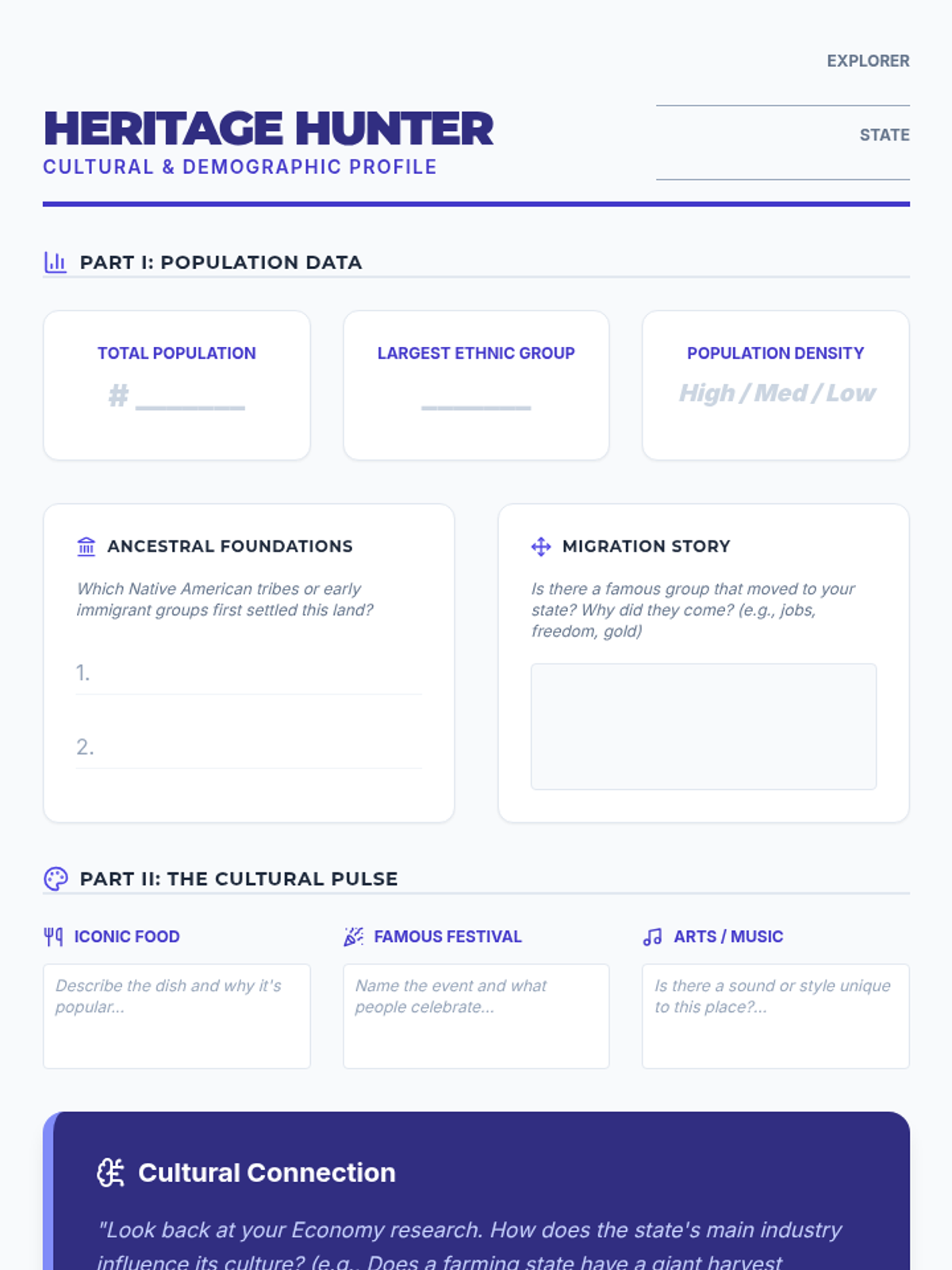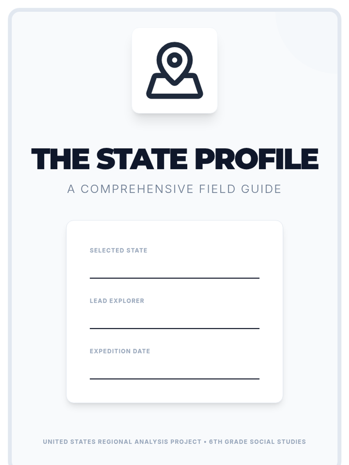 A project-based unit where 6th-grade students research a U.S. state to understand the interplay between physical geography, economic activities, and cultural identity. The sequence moves from physical foundations to human systems, culminating in a comprehensive State Profile exhibition.