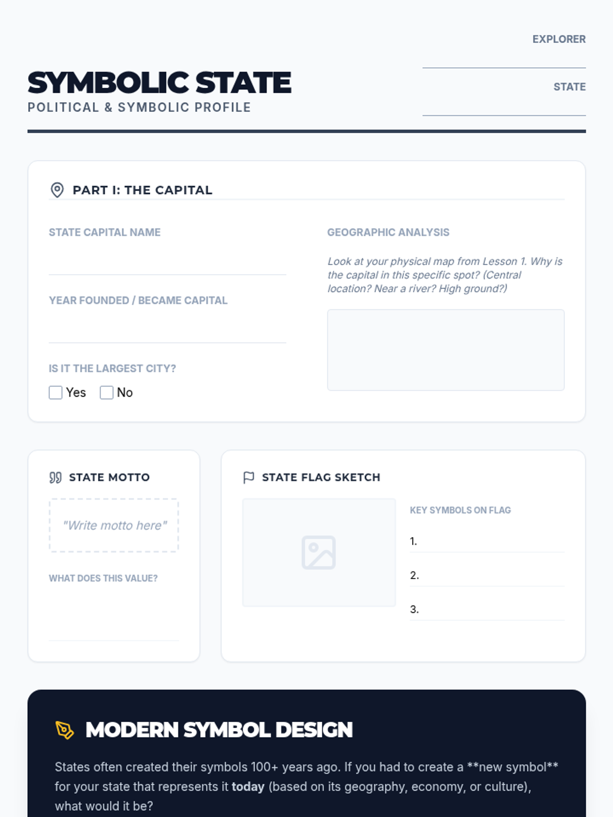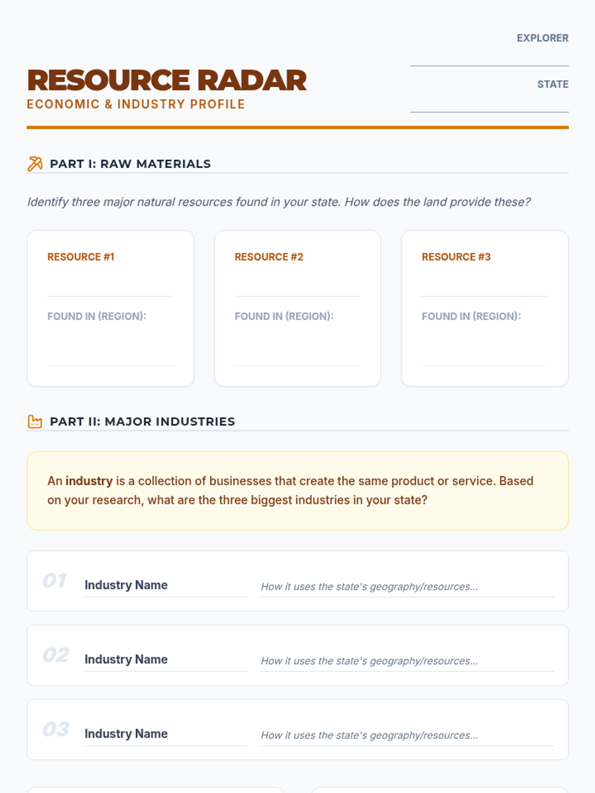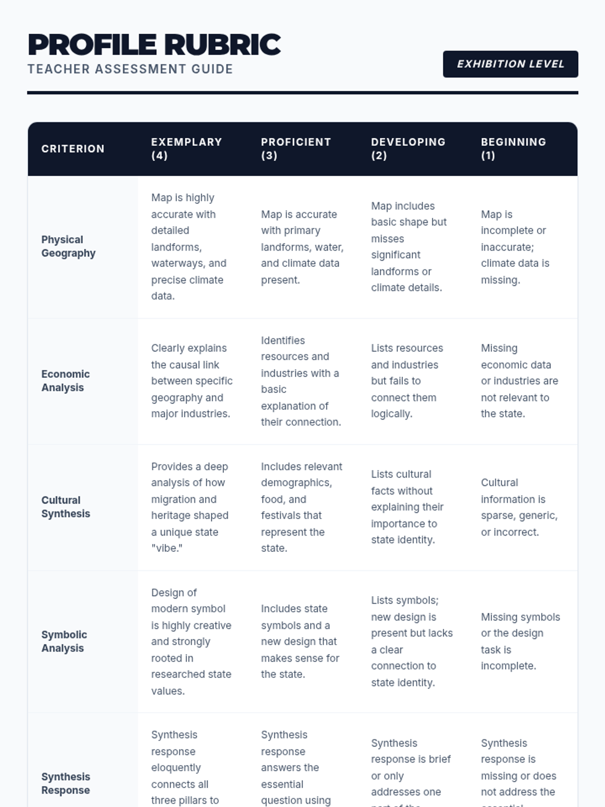 A project-based unit where 6th-grade students research a U.S. state to understand the interplay between physical geography, economic activities, and cultural identity. The sequence moves from physical foundations to human systems, culminating in a comprehensive State Profile exhibition.