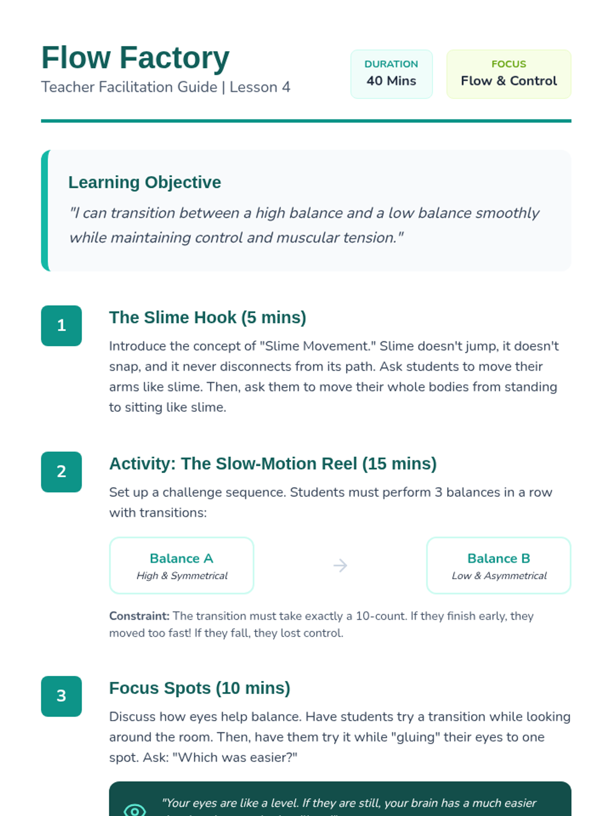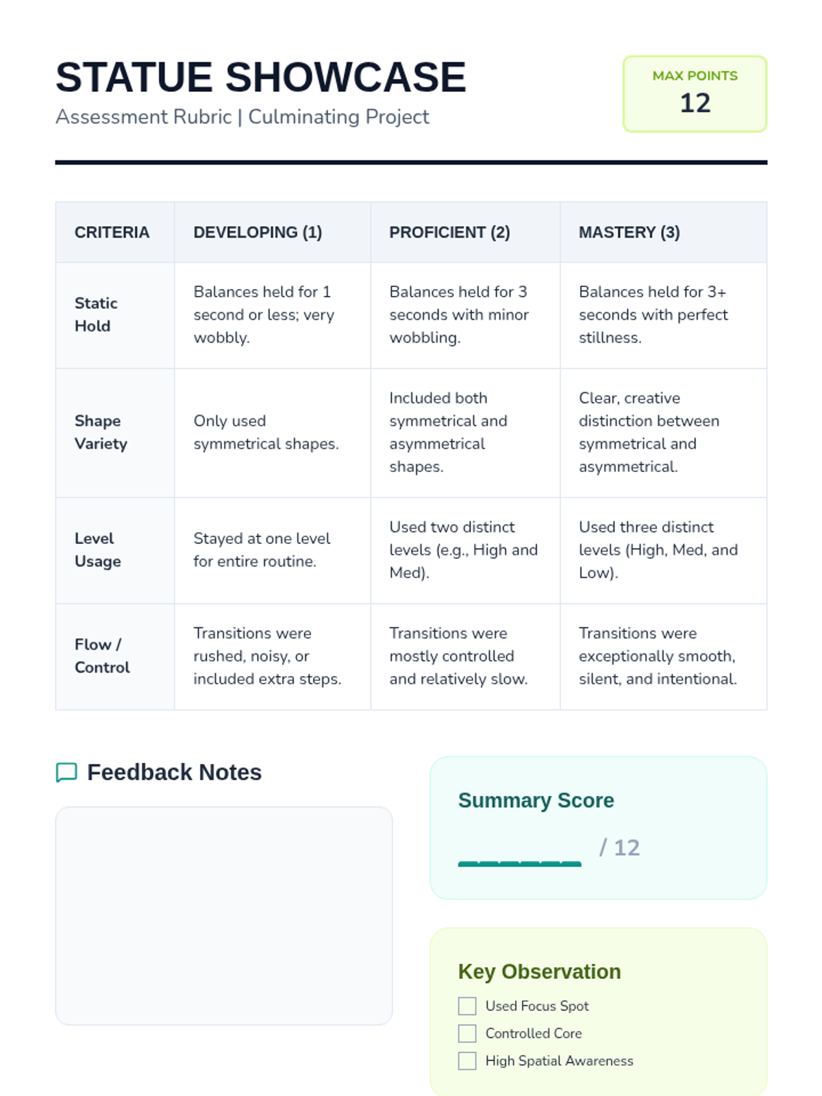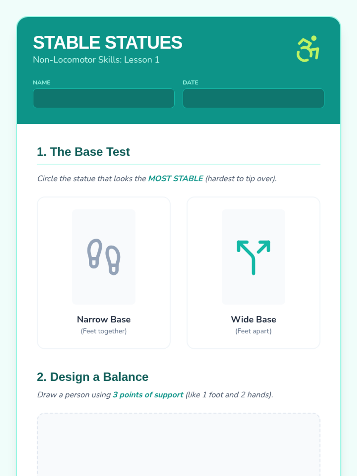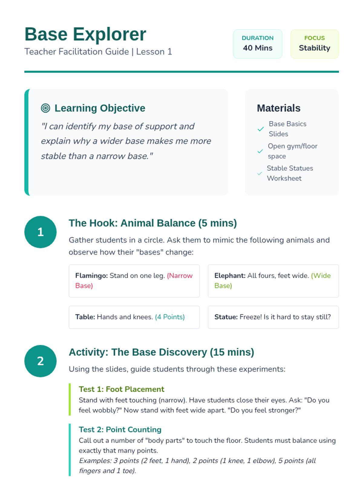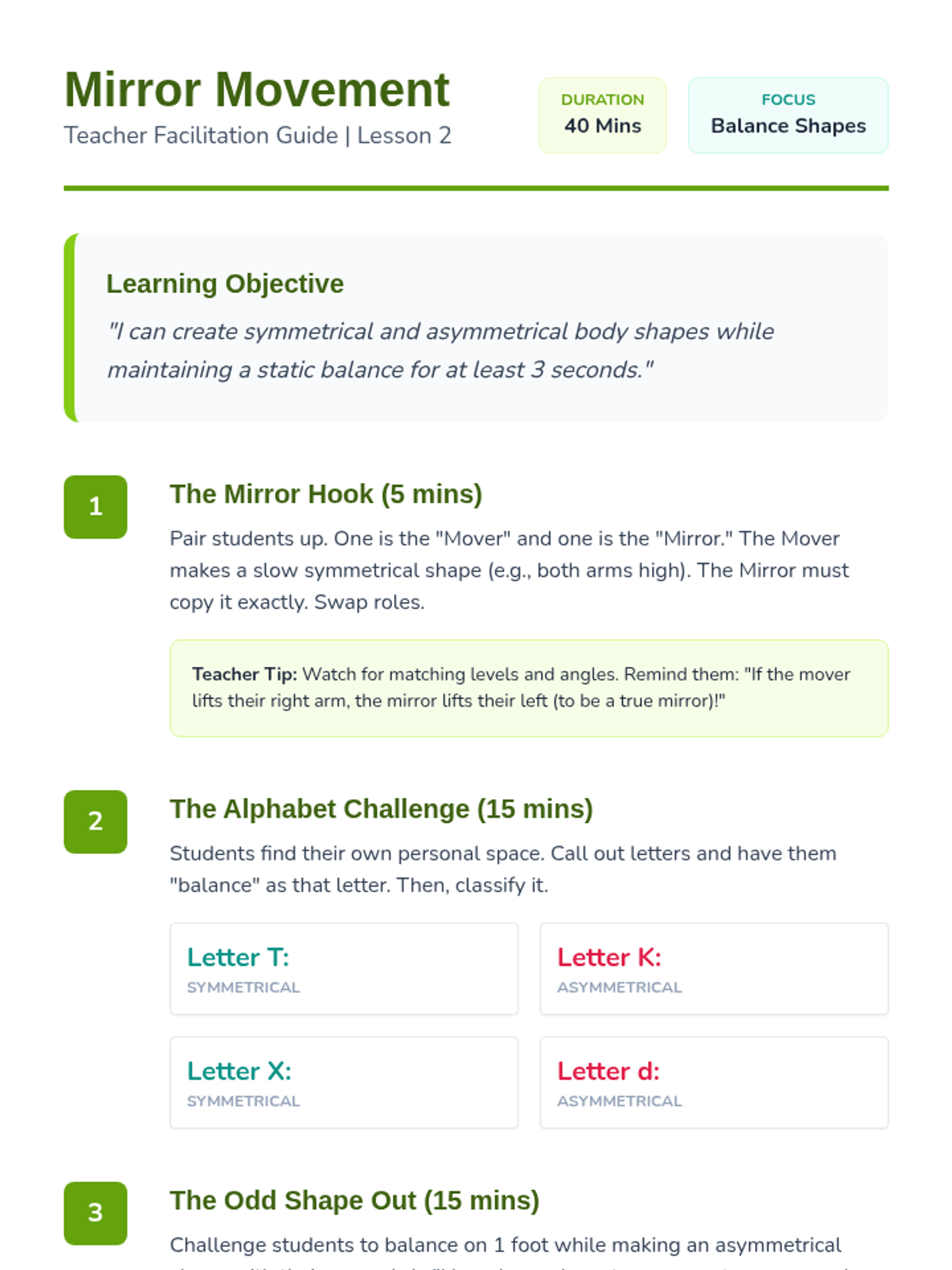 This sequence introduces 2nd Grade students to the fundamental principles of static balance. Students will explore how bases of support, symmetry, and levels of movement affect their stability and body control, culminating in a choreographed balance routine.
